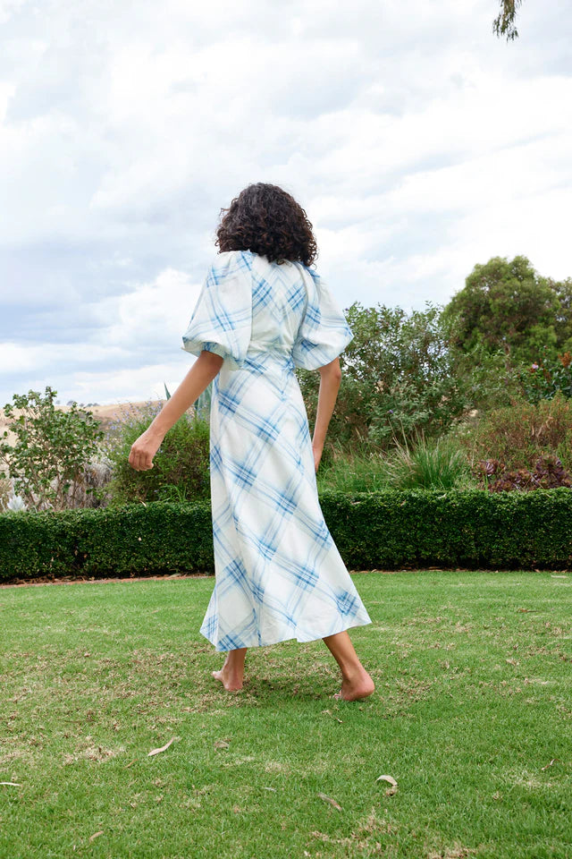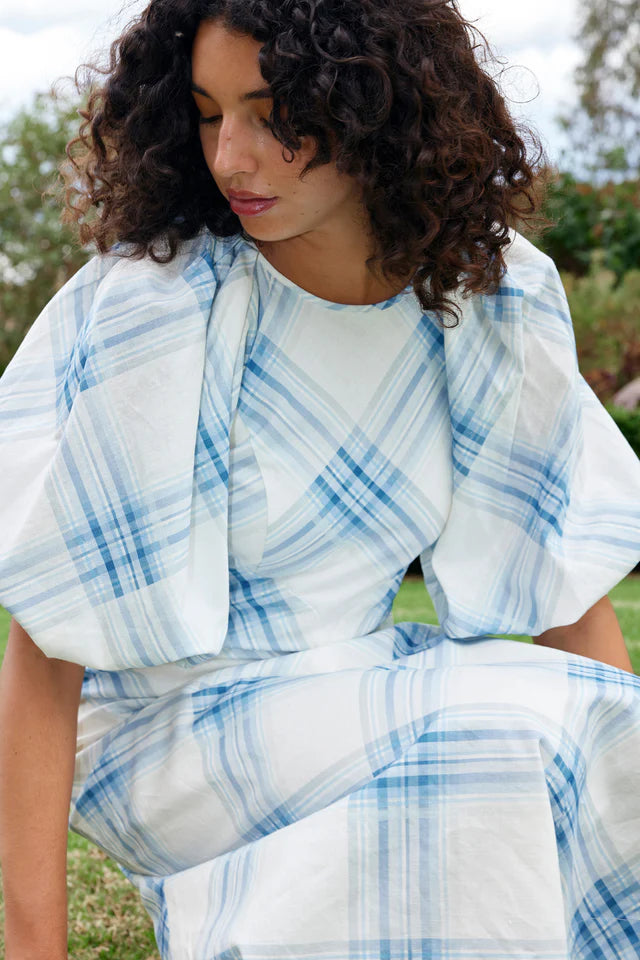 Aston Studio Lucinda Dress in Cerulean Plaid. This charming dress blends vintage elegance with modern ease. Featuring a flowing midi silhouette, it showcases a soft blue plaid pattern on a crisp white background. The voluminous puff sleeves add a touch of drama, while delicate ruching at the waist enhances the feminine shape. Light and airy, this dress is perfect for warm-weather outings, offering both comfort and effortless style.