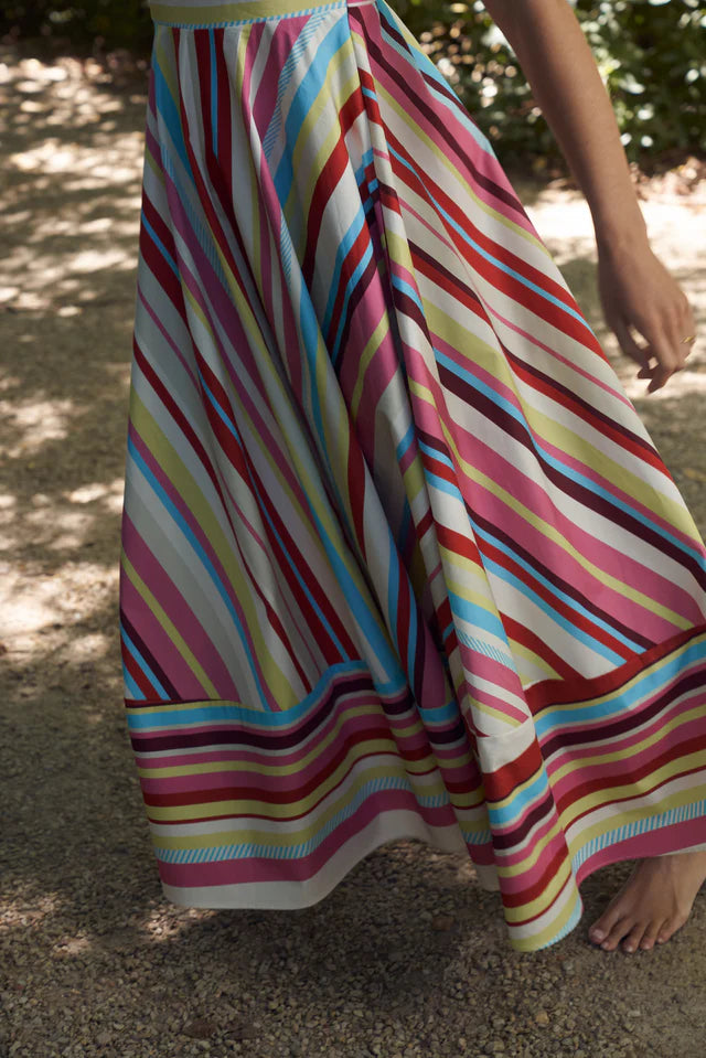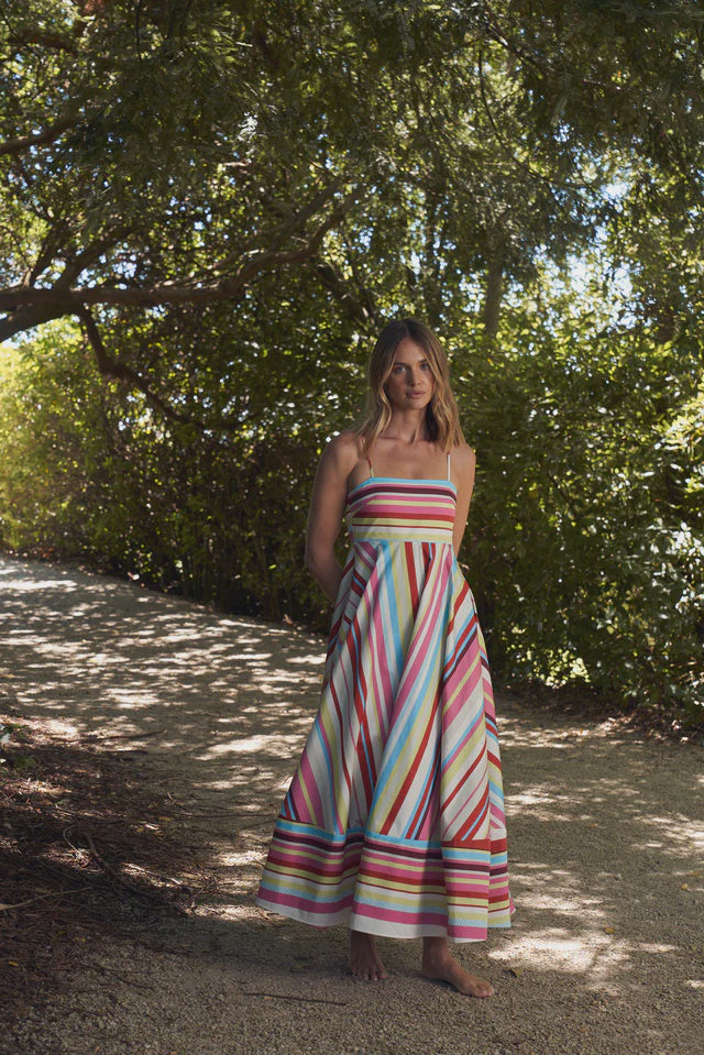 Aston Studio Rue Dress in Monarch Stripe. The Rue Dress in our exclusive Monarch Stripe is a sophisticated silhouette with adjustable shoulder straps, featuring a full skirt for added elegance and femininity.