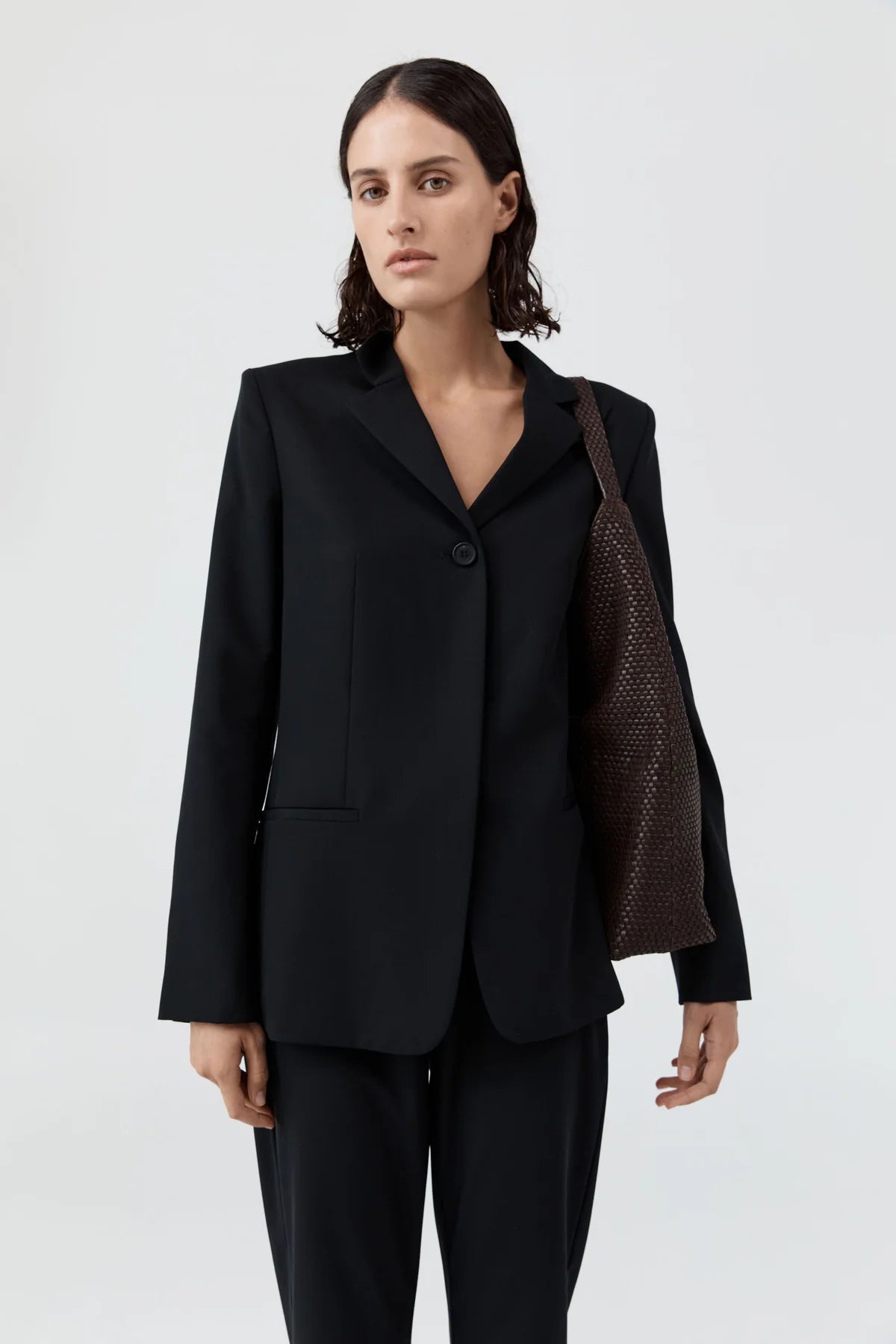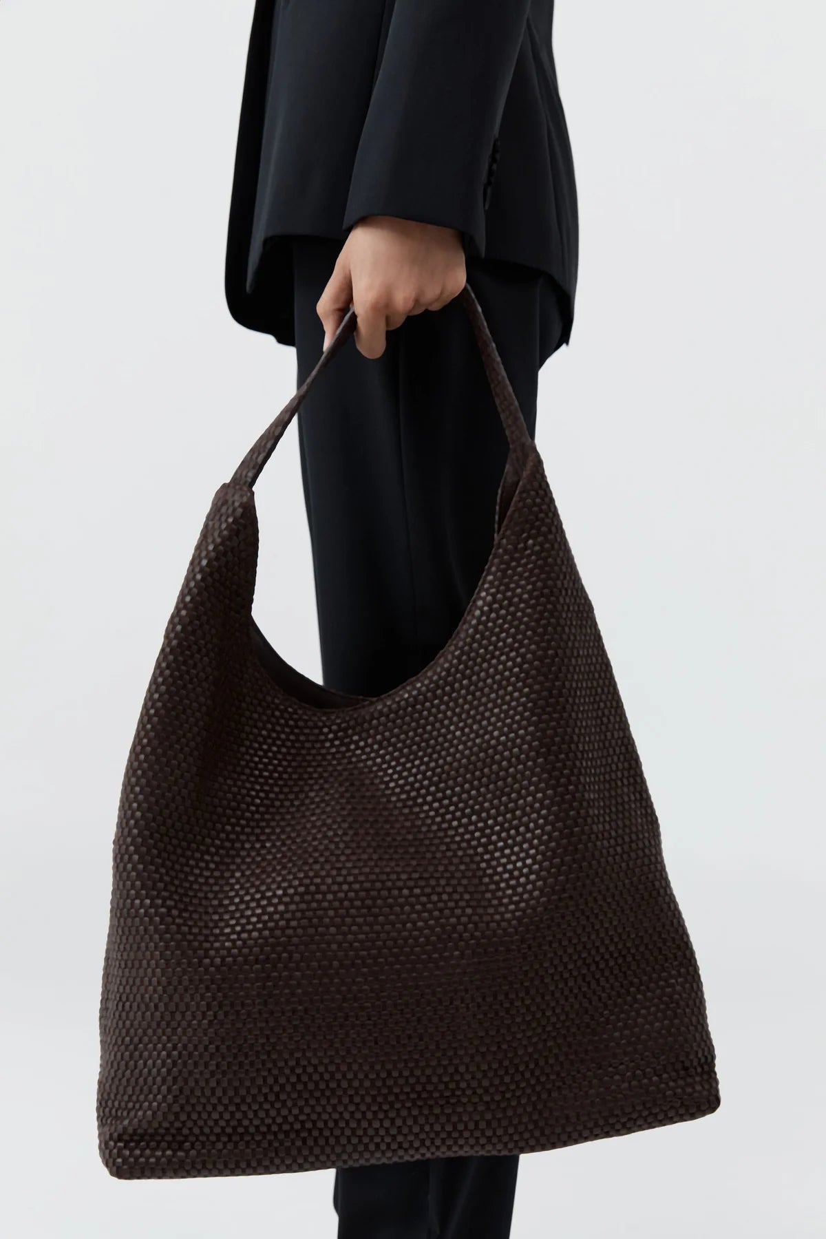 St Agni Lattice Weave Large Tote in Coffee. The Lattice Weave Large Tote plays on exaggerated shapes and organic forms, offering a relaxed structure and oversized silhouette. An internal zip pocket provides secure storage, while the spacious design ensures high-rotation wear. Pair with minimalist wardrobe heroes for a refined interplay between the exaggerated and the understated.