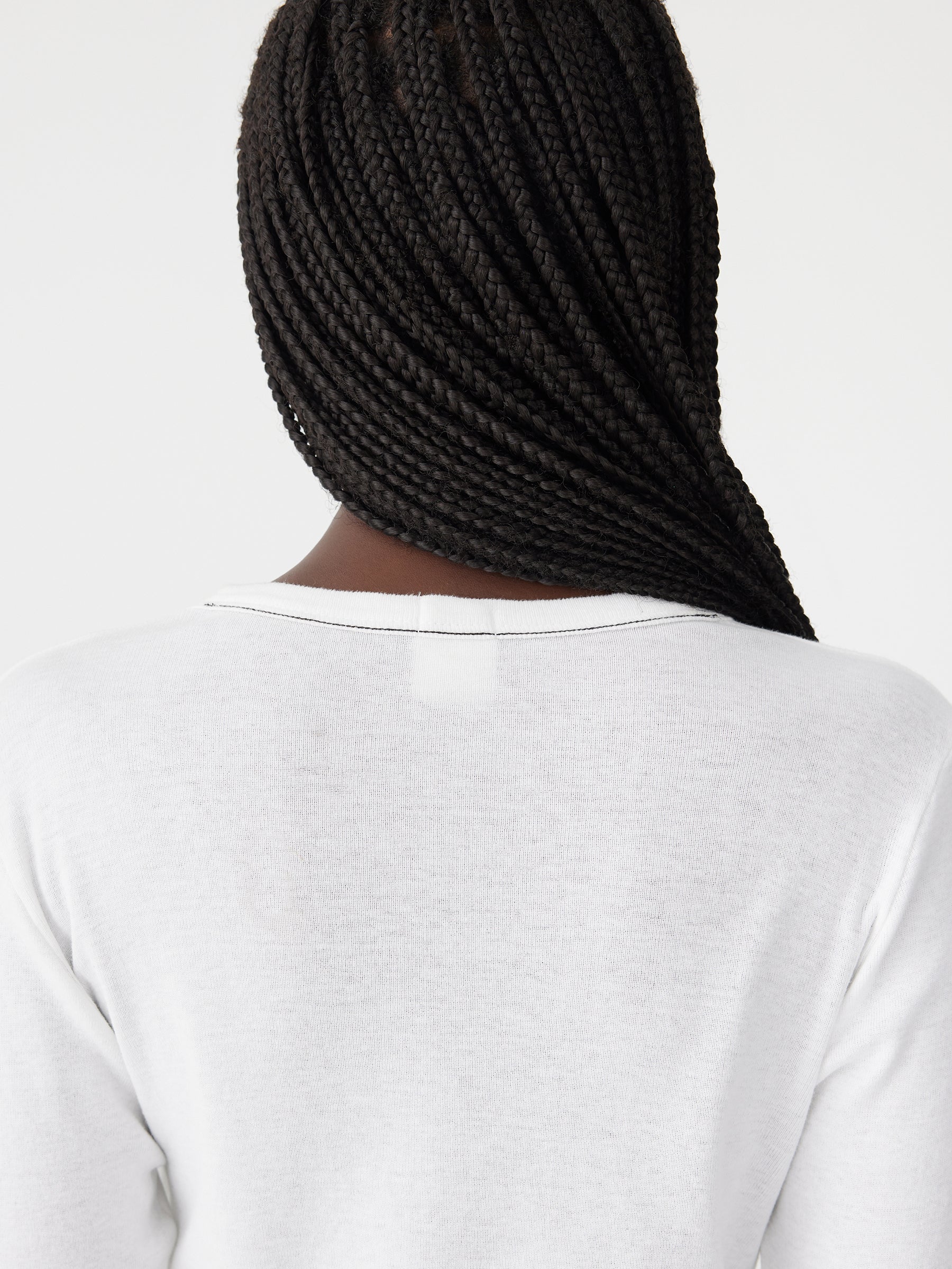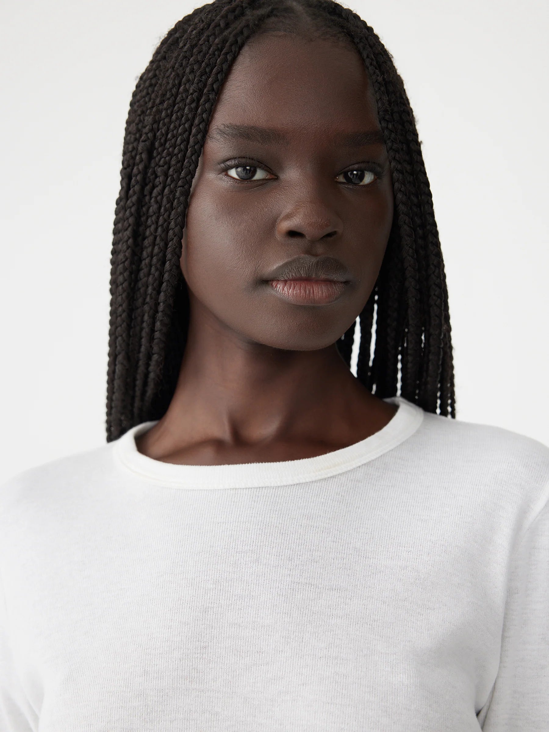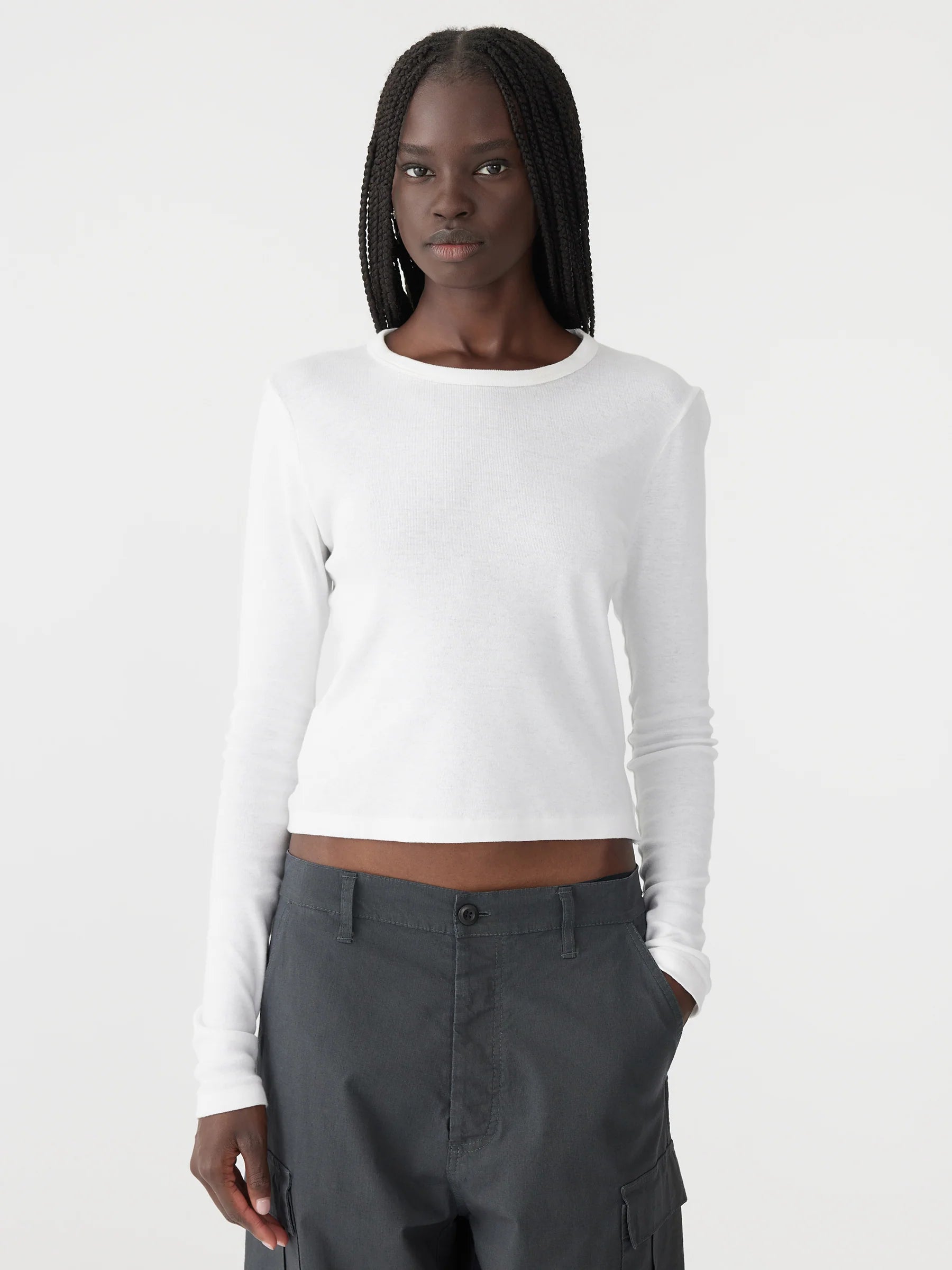 Bassike Slim Fit Rib Long Sleeve Baby T-Shirt In White. Crafted from organic cotton superfine rib knitted in Australia, the Slim Fit Rib Long Sleeve Baby T-Shirt is designed for a slim fit in a cropped silhouette. This lightweight style features a classic crew neckline and signature Bassike chainstitch along the back neck. Complete with ribbed finishes along hem, cuffs and neckline.