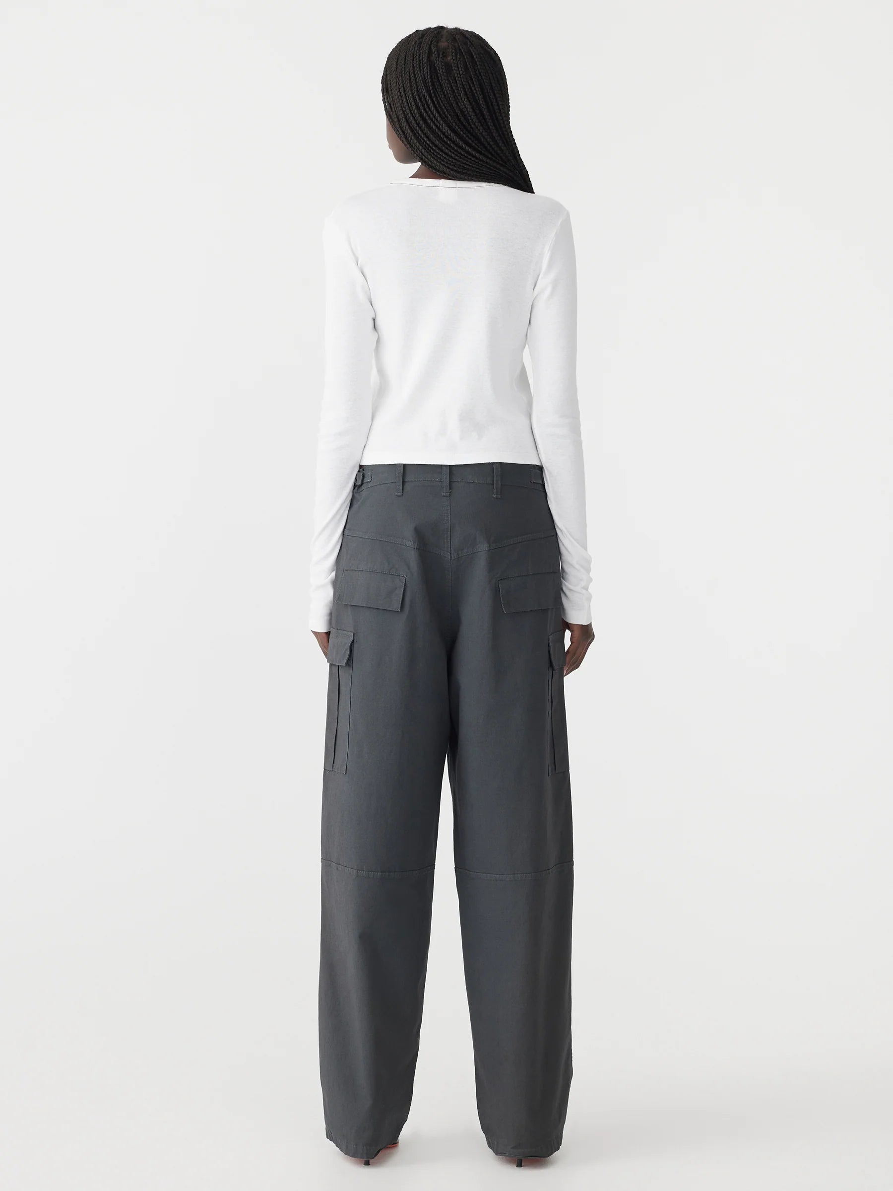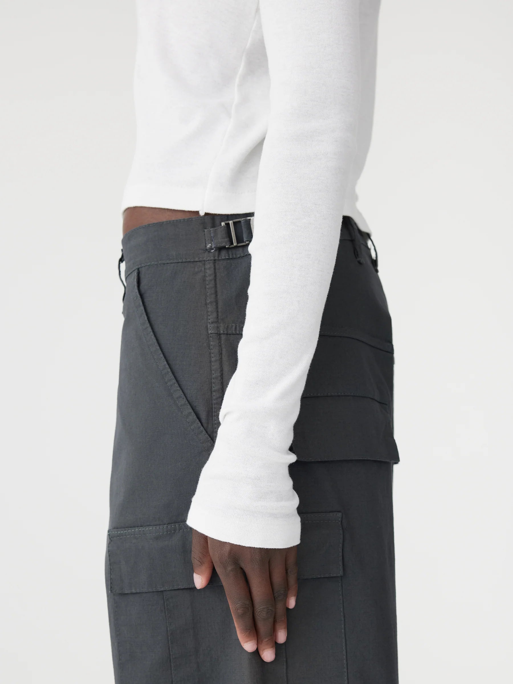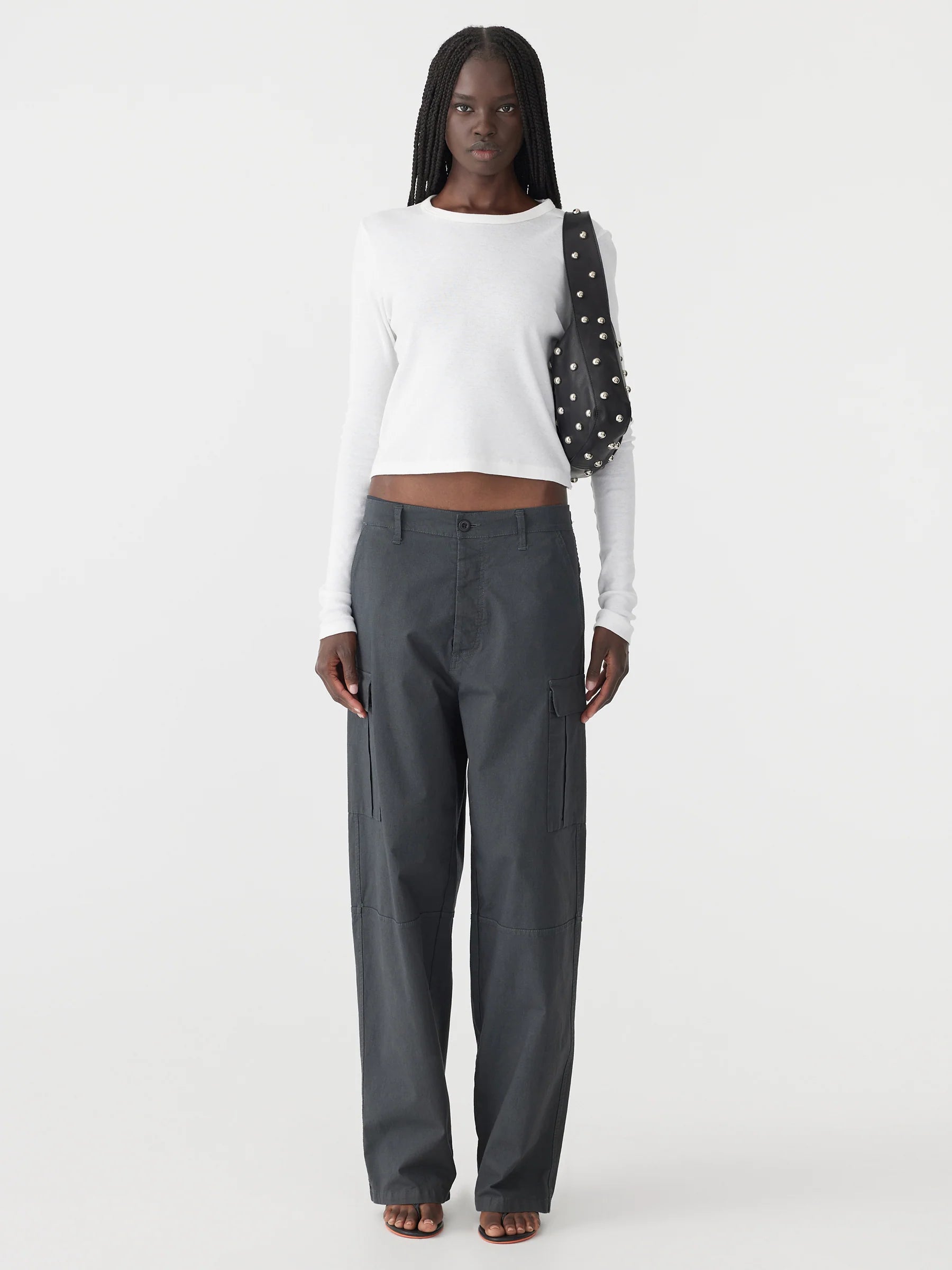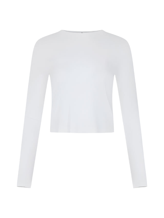 Bassike Slim Fit Rib Long Sleeve Baby T-Shirt In White. Crafted from organic cotton superfine rib knitted in Australia, the Slim Fit Rib Long Sleeve Baby T-Shirt is designed for a slim fit in a cropped silhouette. This lightweight style features a classic crew neckline and signature Bassike chainstitch along the back neck. Complete with ribbed finishes along hem, cuffs and neckline.