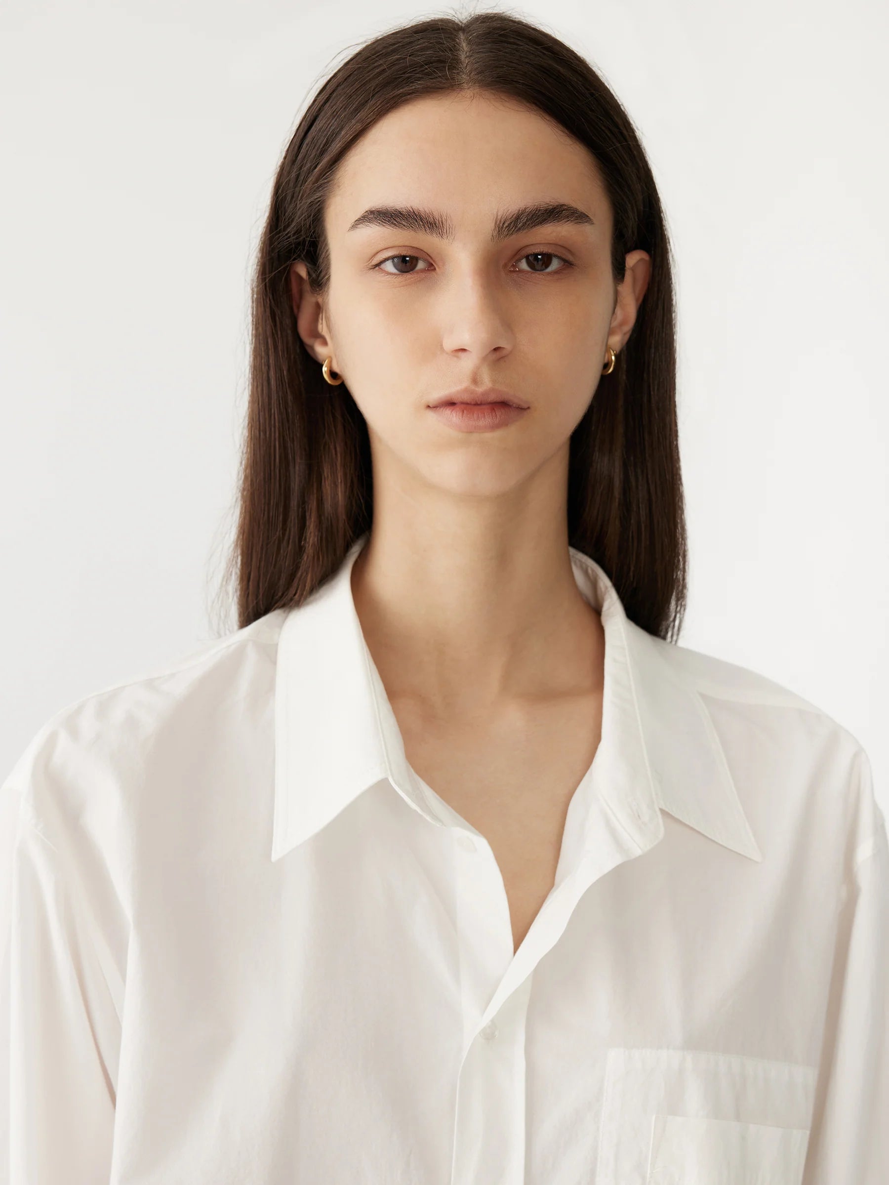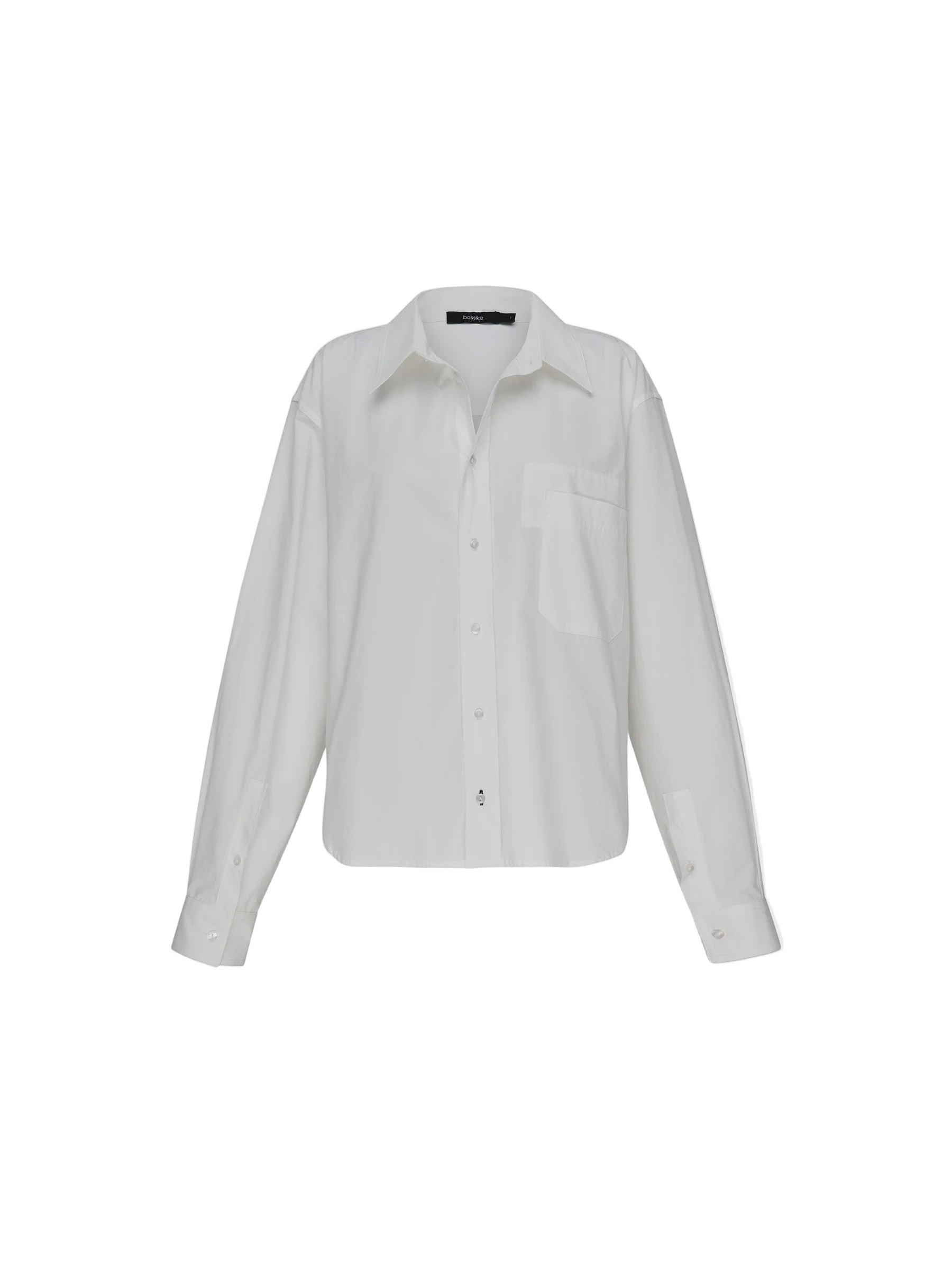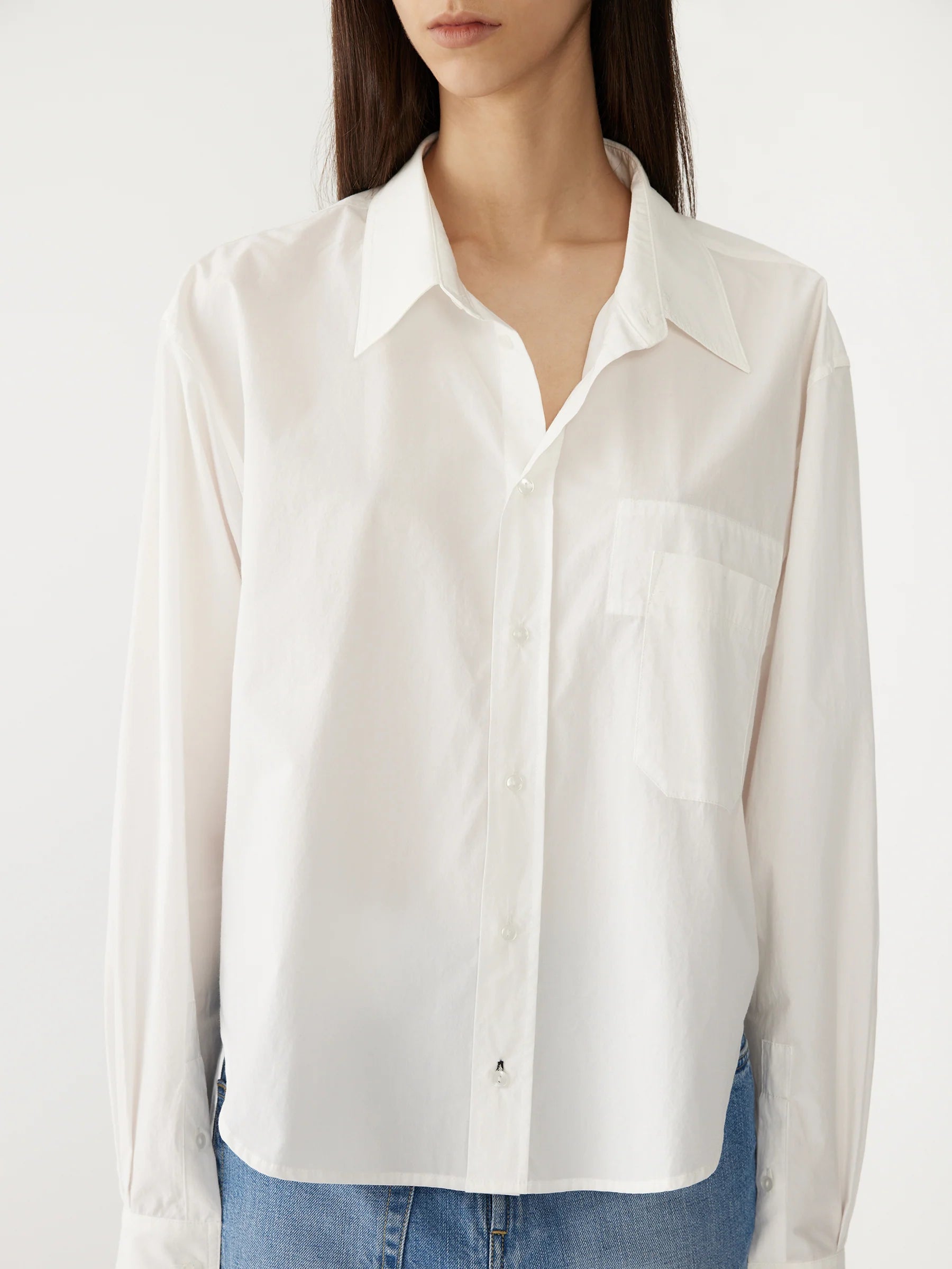 The casual classic shirt in crisp organic cotton. Designed as an easy-fitting button up, the final garment is refined by a front patch pocket with pocket bearer stitch detail feature. Complete with a reverse packet cuff and rounded hem in a cropped length.