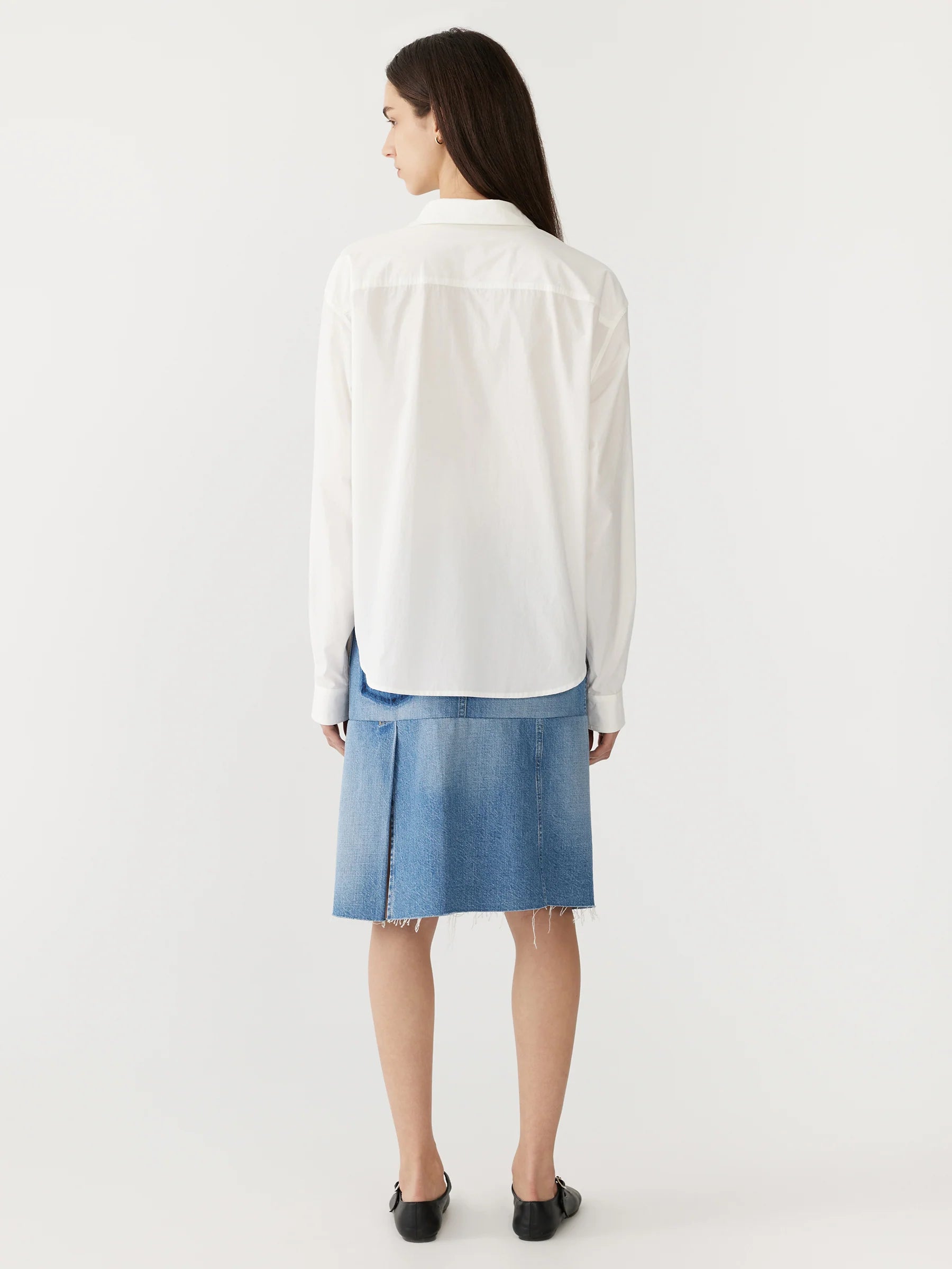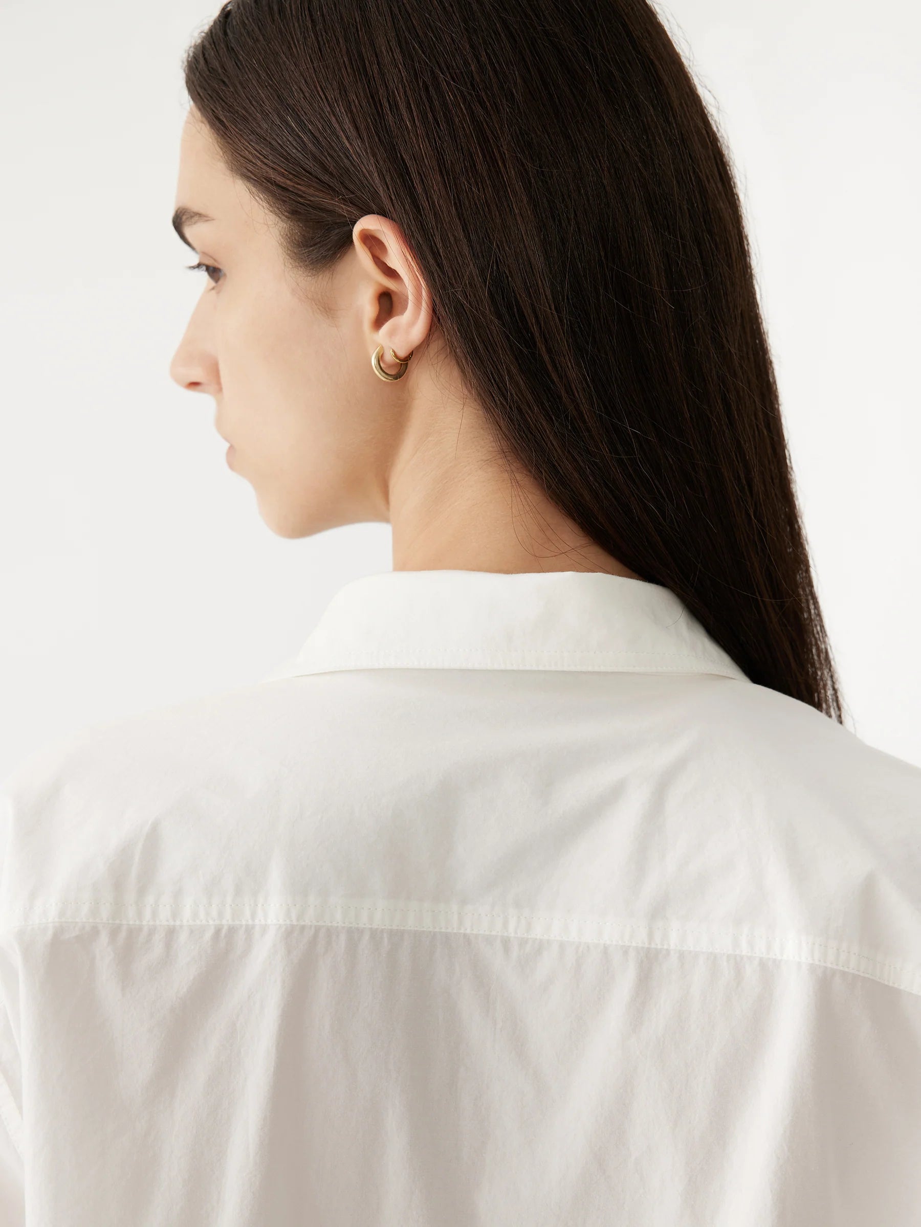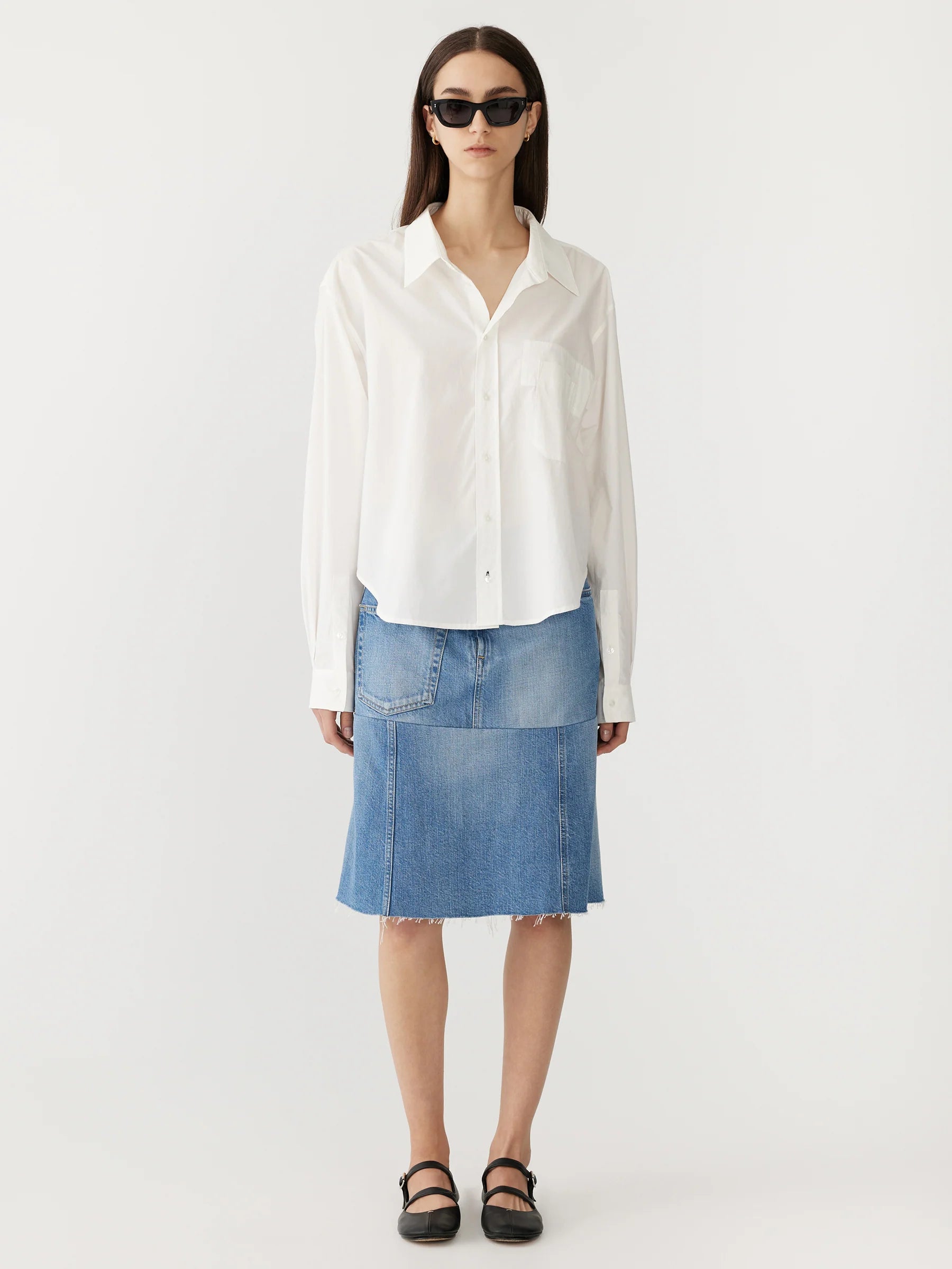 The casual classic shirt in crisp organic cotton. Designed as an easy-fitting button up, the final garment is refined by a front patch pocket with pocket bearer stitch detail feature. Complete with a reverse packet cuff and rounded hem in a cropped length.
