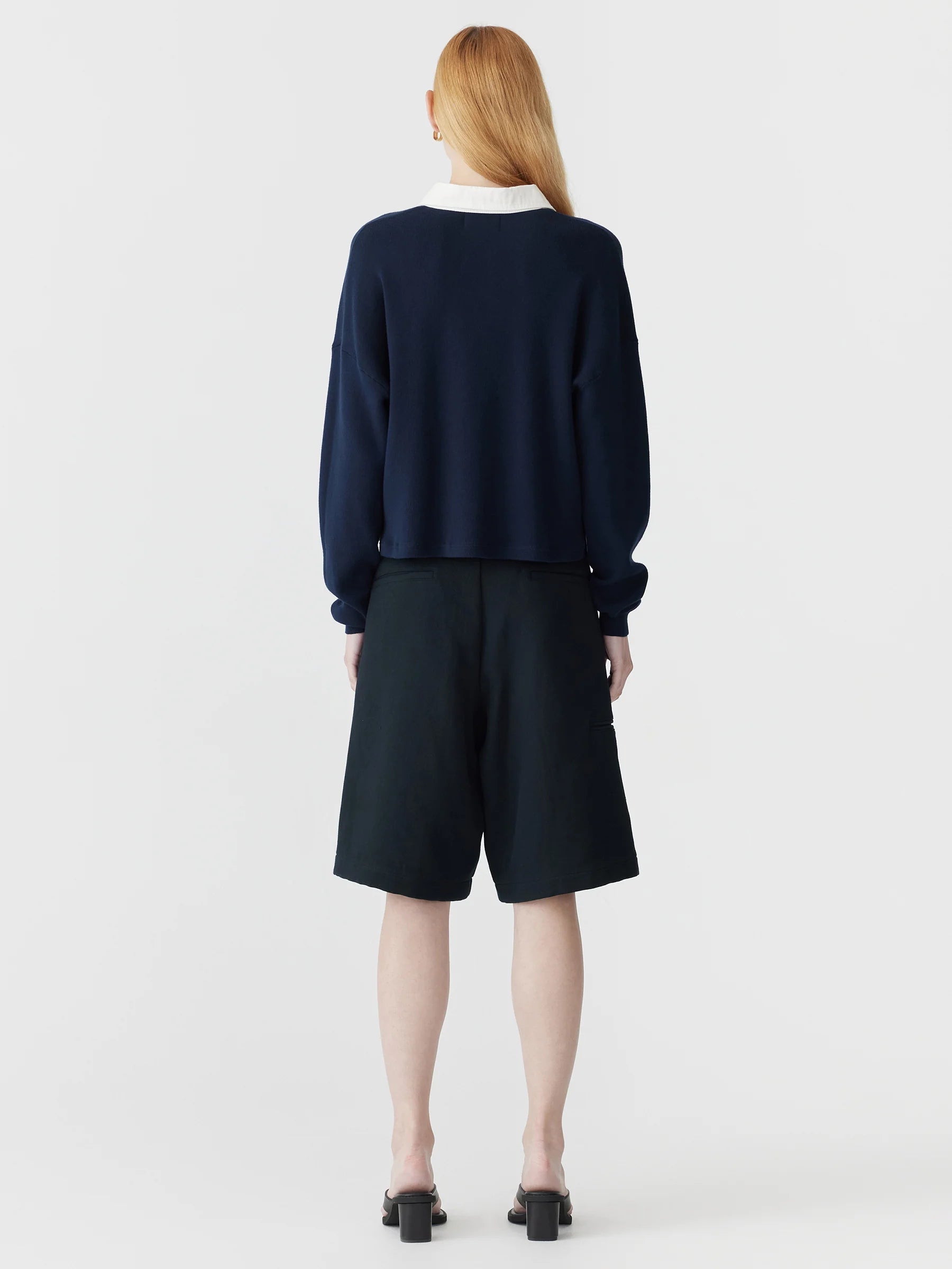 Bassike Cotton Polo Knitted Sweat In Ink. Crafted from 100% cotton, the Cotton Polo Knitted Sweat is designed for a regular fit with a slightly cropped silhouette. Features a contrast canvas collar and internal placket for a refined take on the classic polo. Finished with ribbed sleeve cuffs and side splits at hem.