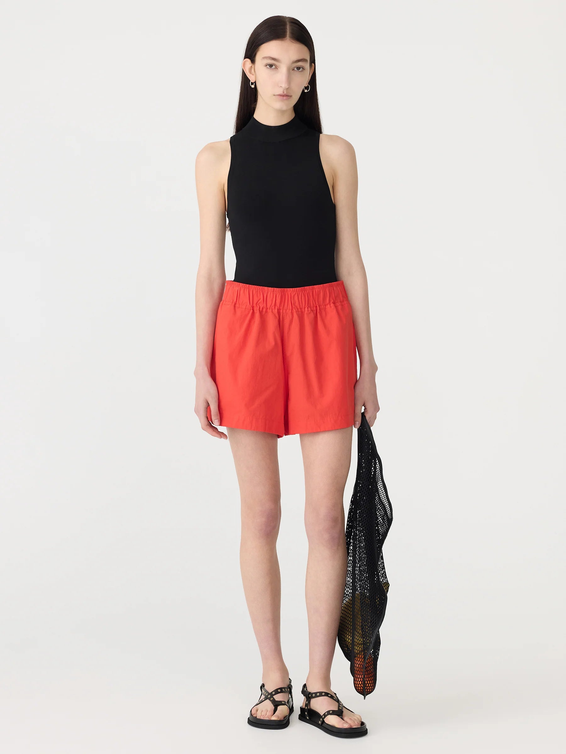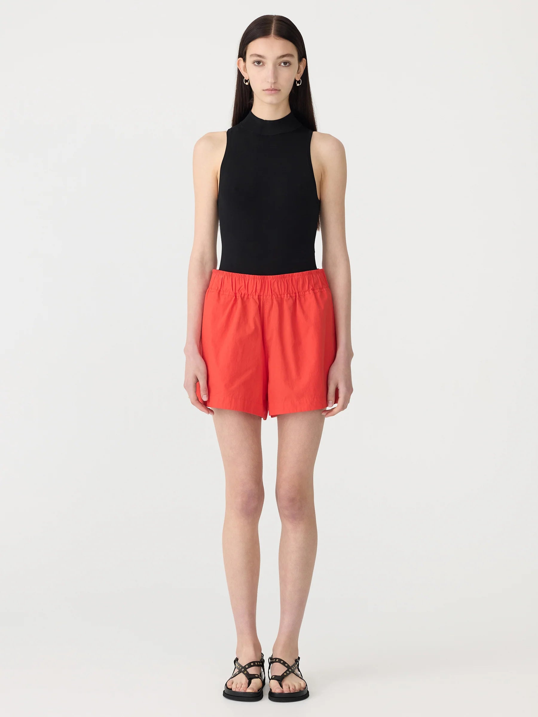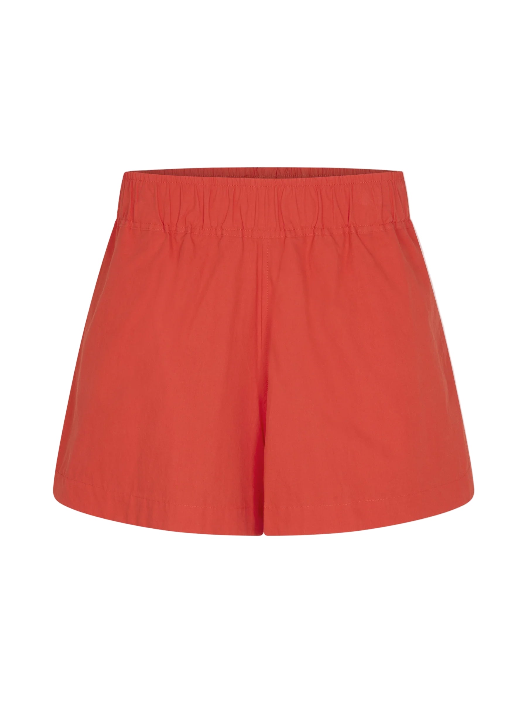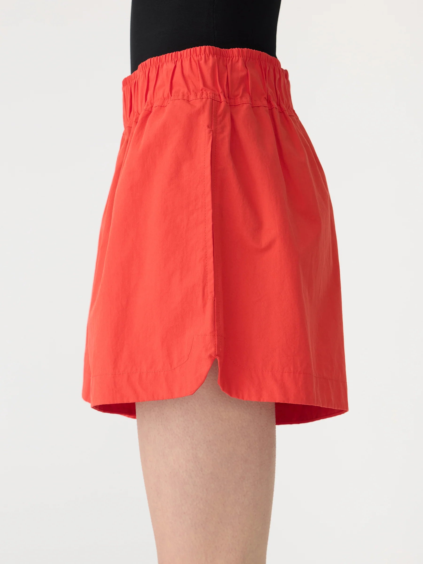 Bassike Crushed Cotton Tennis Short in Red. Crafted from lightweight compact cotton with a natural crushed texture, the Crushed Cotton Tennis Short is designed with a wide elasticated waistband for ease and comfort. Featuring side entry pockets, curved hem side splits and finished with signature Bassike branded topstitching at the back.