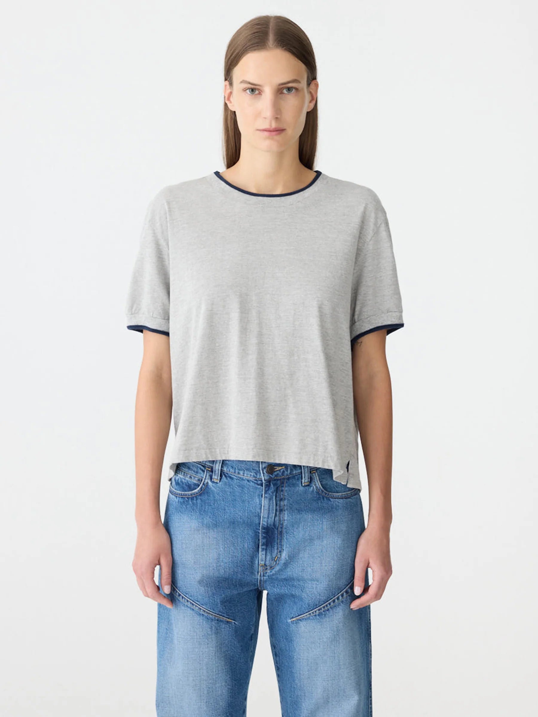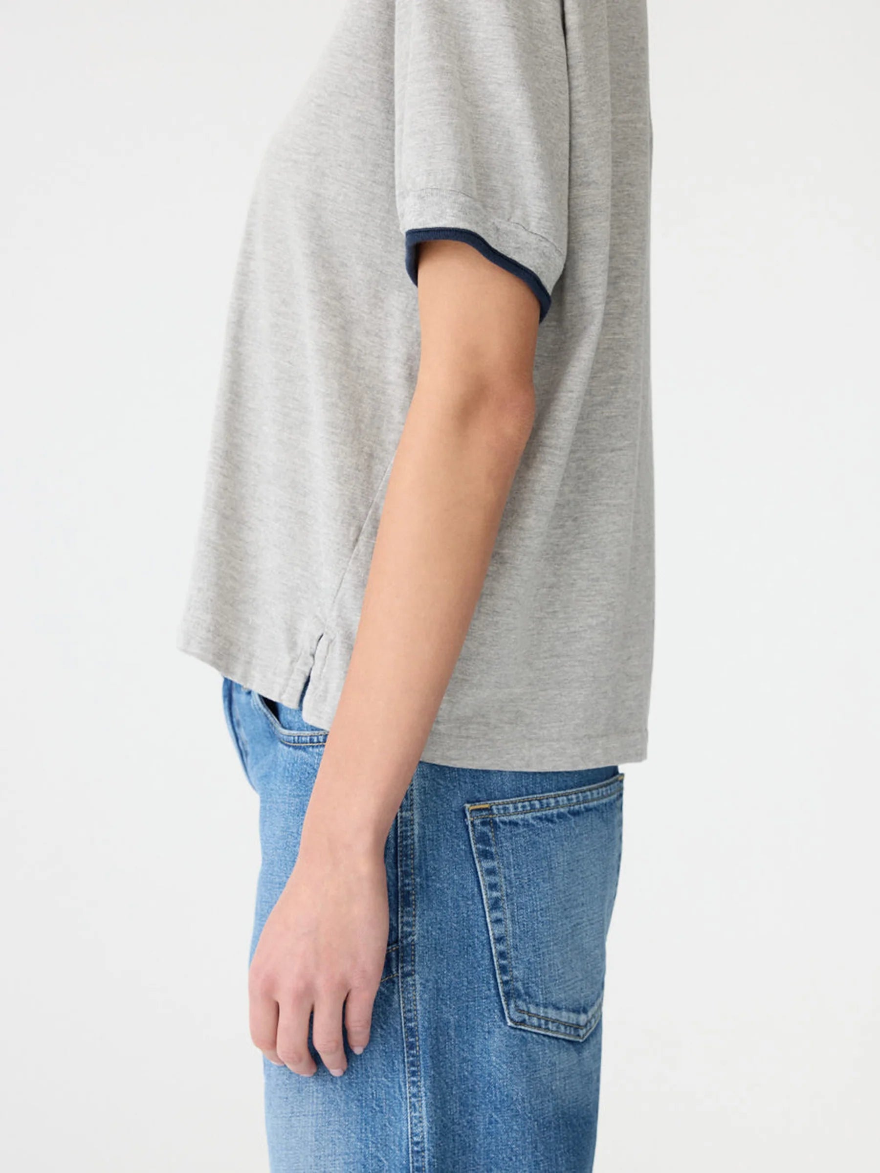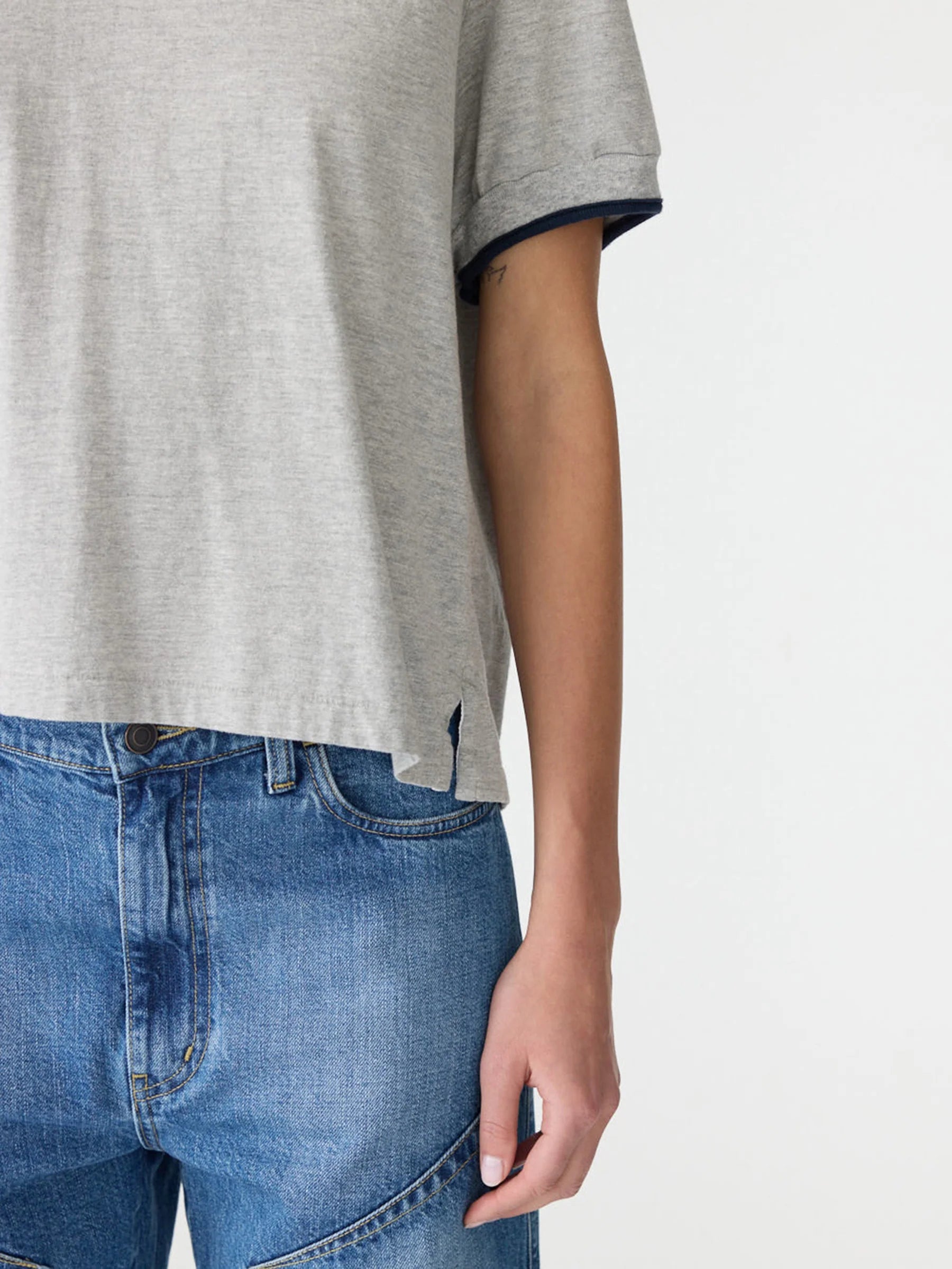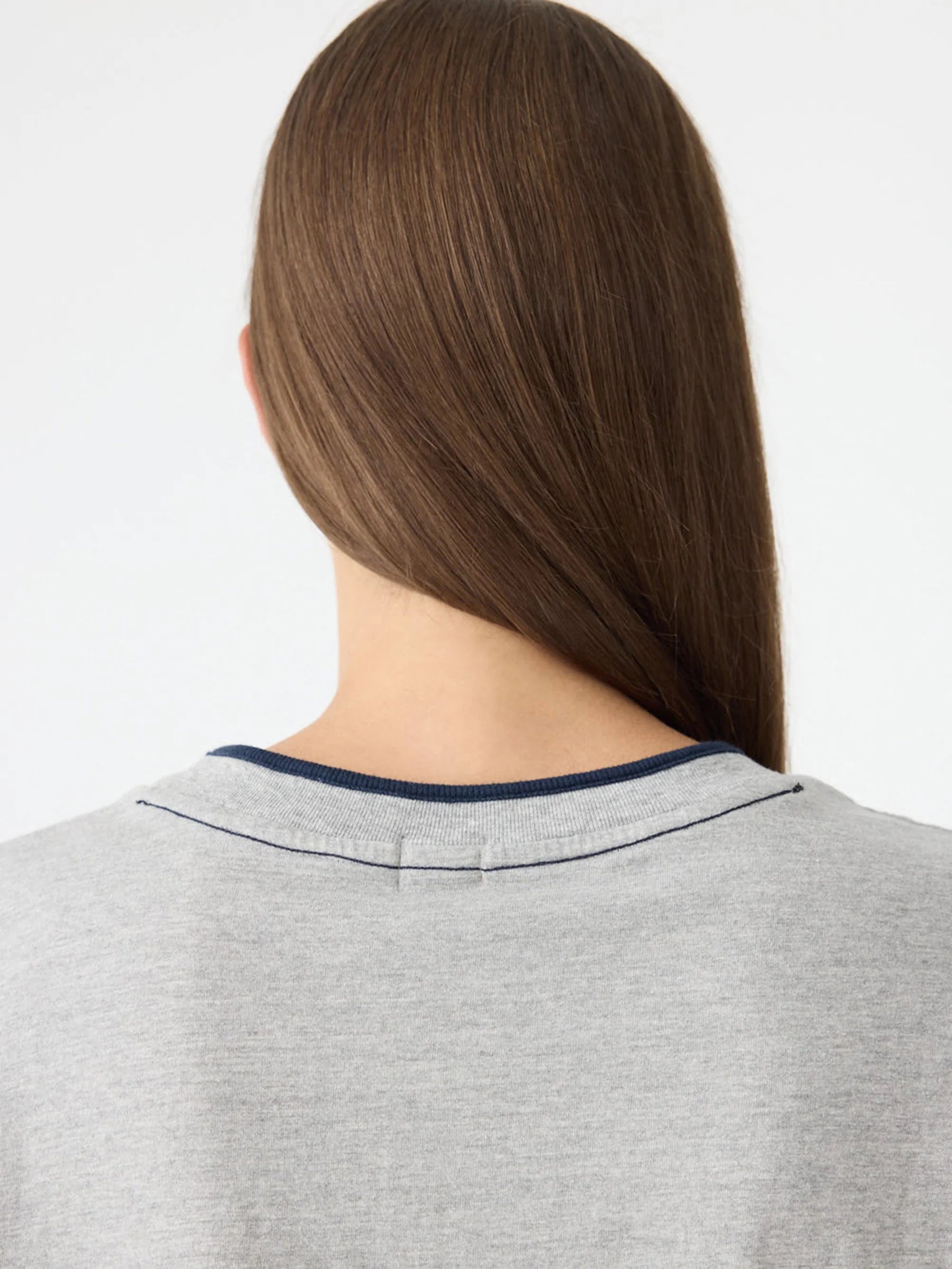 Bassike Layered Neck T-Shirt in Grey Marle and Blue Ink. The Layered Neck T-Shirt is a boxy short sleeve style crafted from organic single jersey. Designed with a layered contrast neckline and sleeve hems, finished with side hem splits bound in cotton tape and signature Bassike stitching at the back neck.