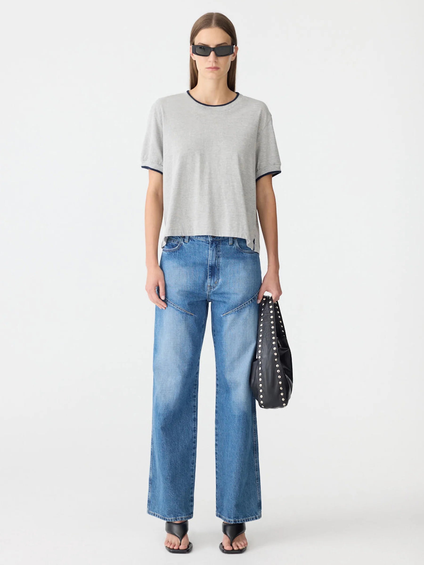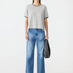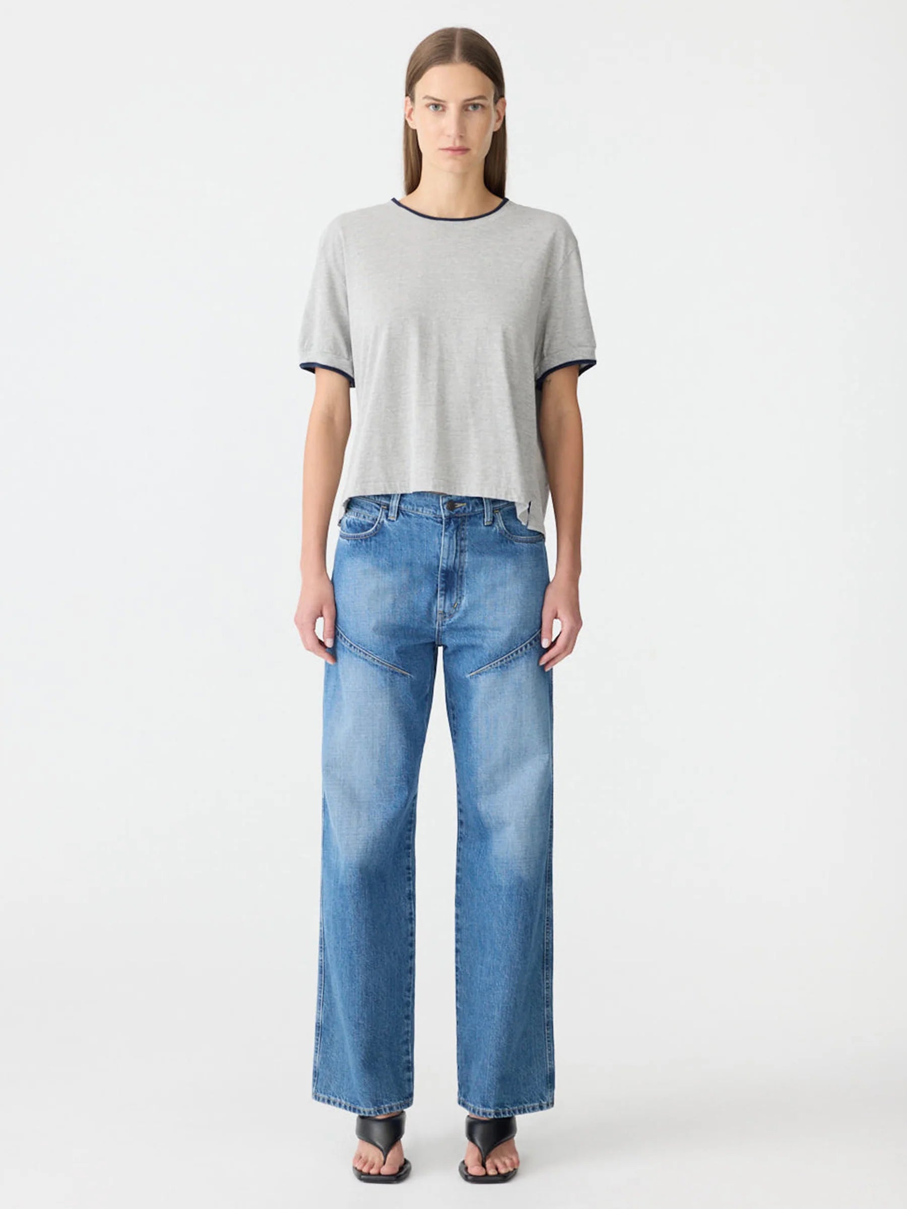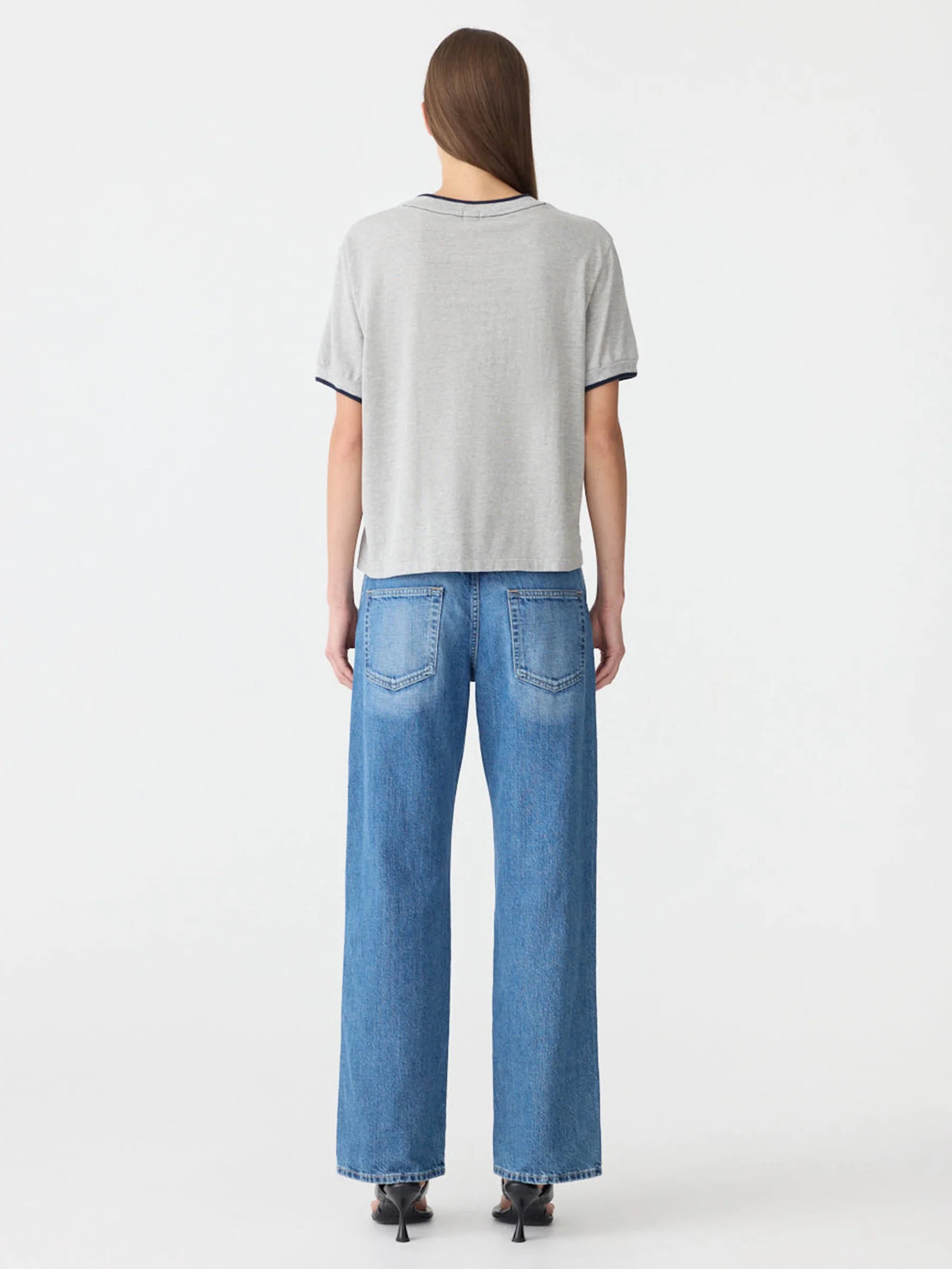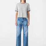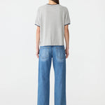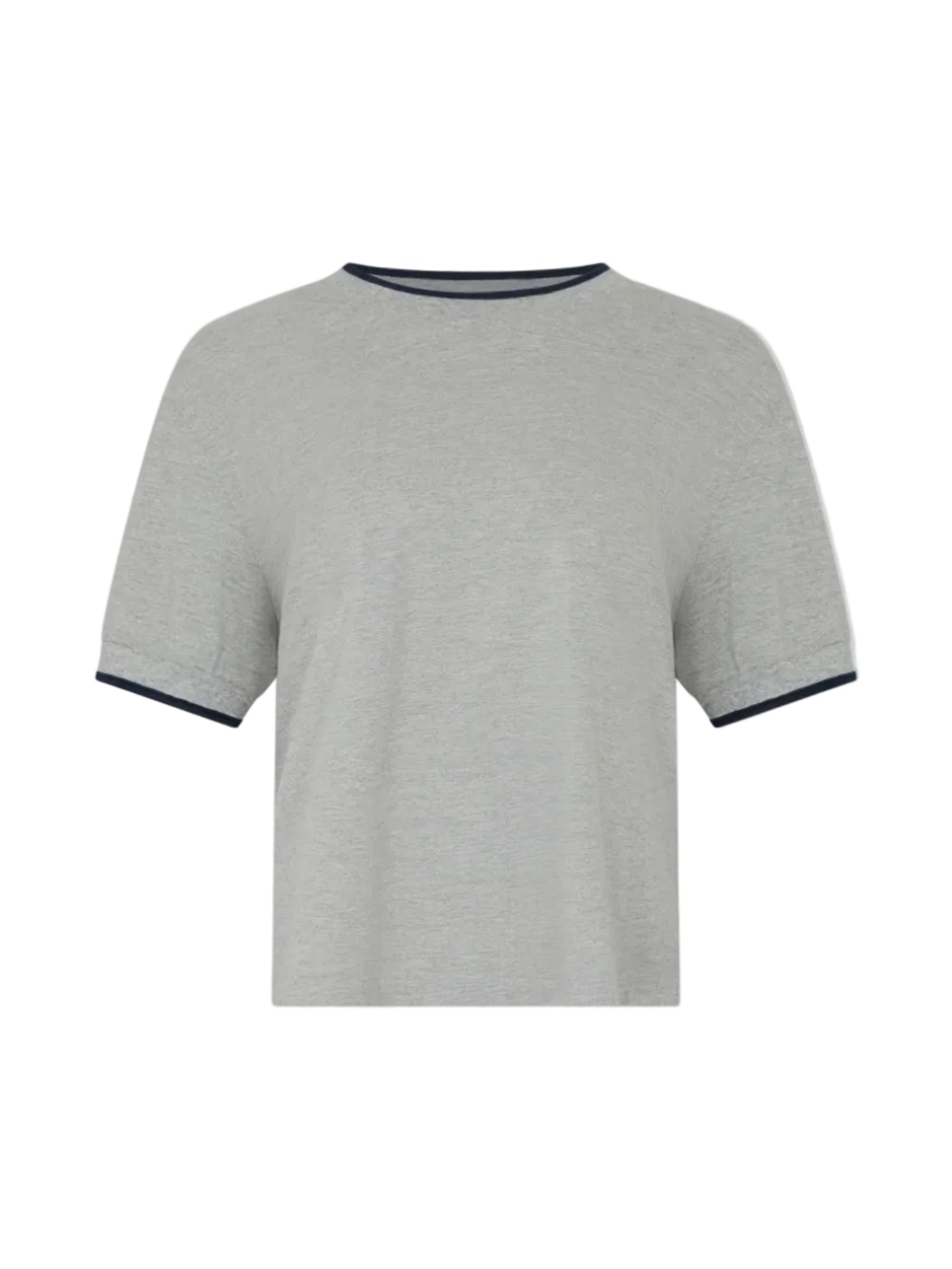Bassike Layered Neck T-Shirt in Grey Marle and Blue Ink. The Layered Neck T-Shirt is a boxy short sleeve style crafted from organic single jersey. Designed with a layered contrast neckline and sleeve hems, finished with side hem splits bound in cotton tape and signature Bassike stitching at the back neck.