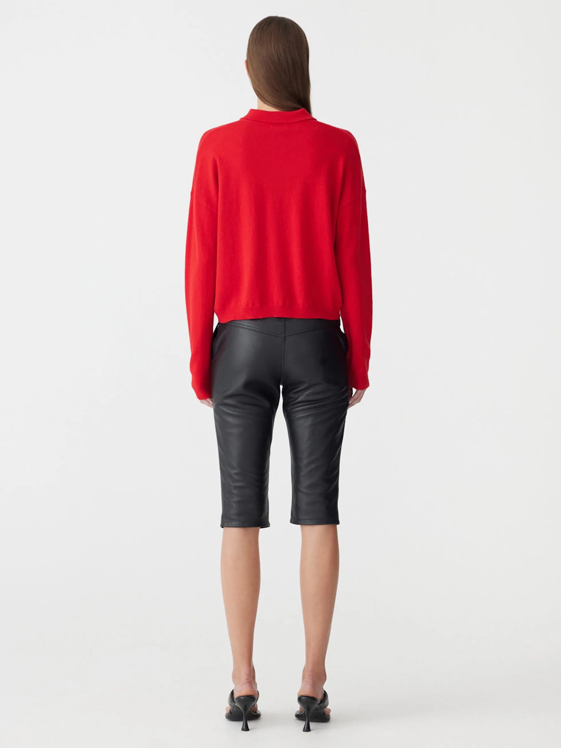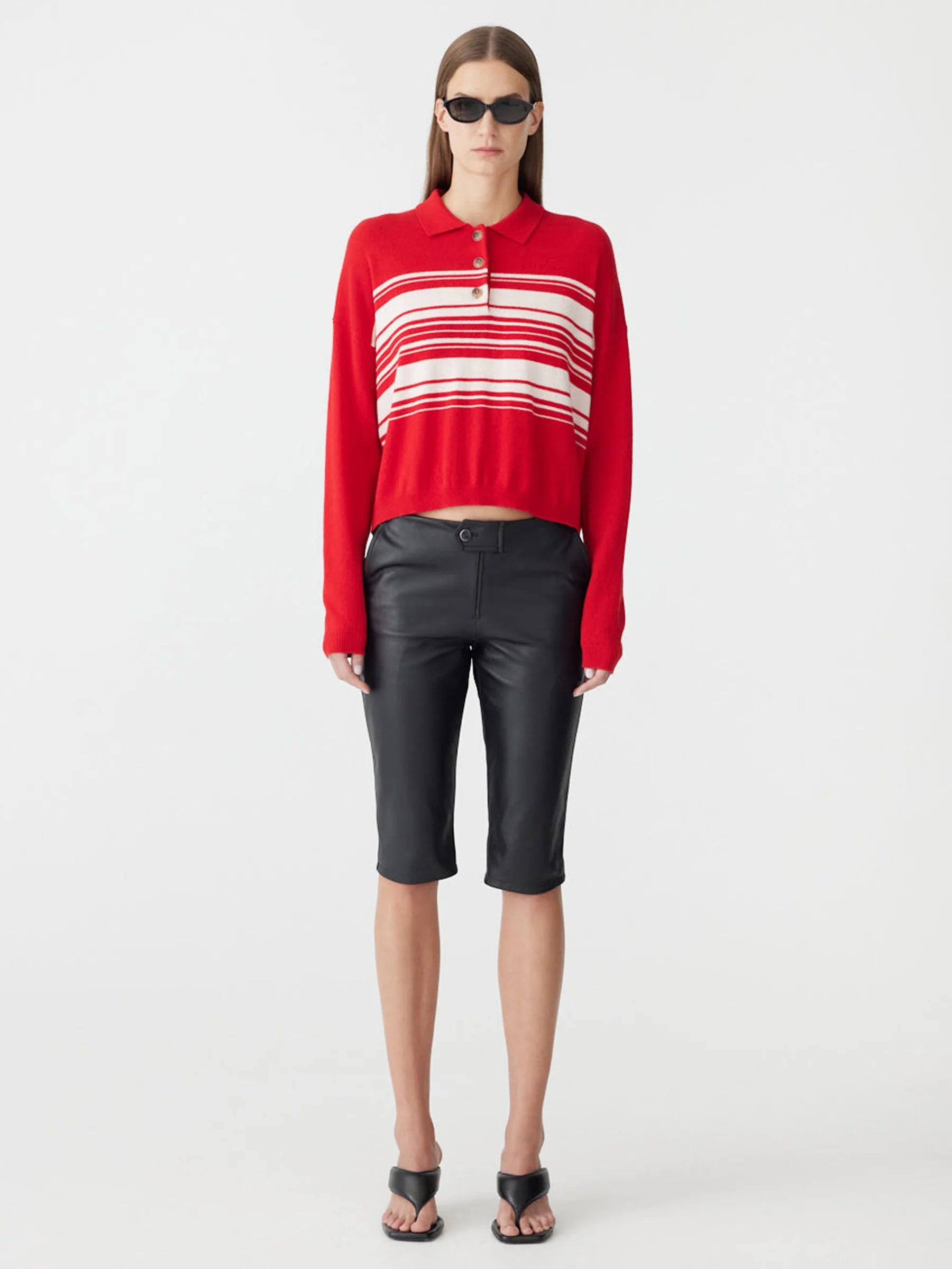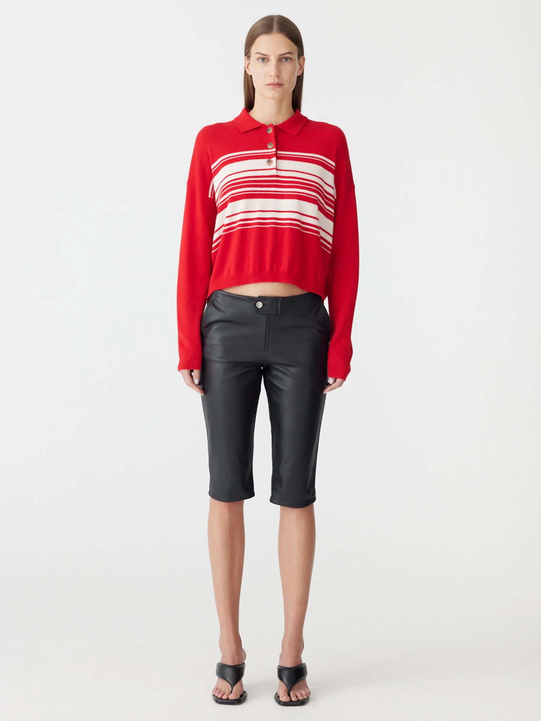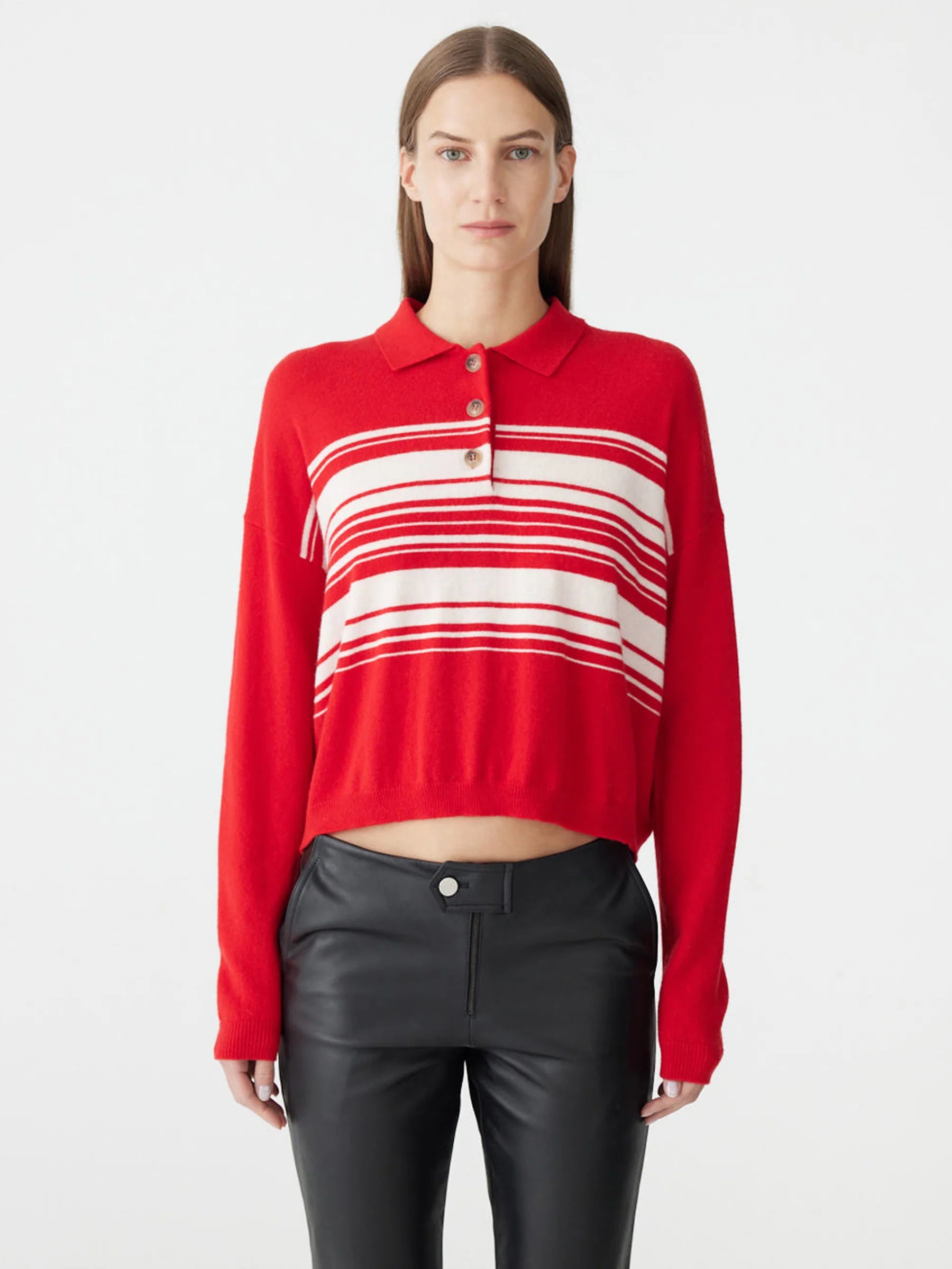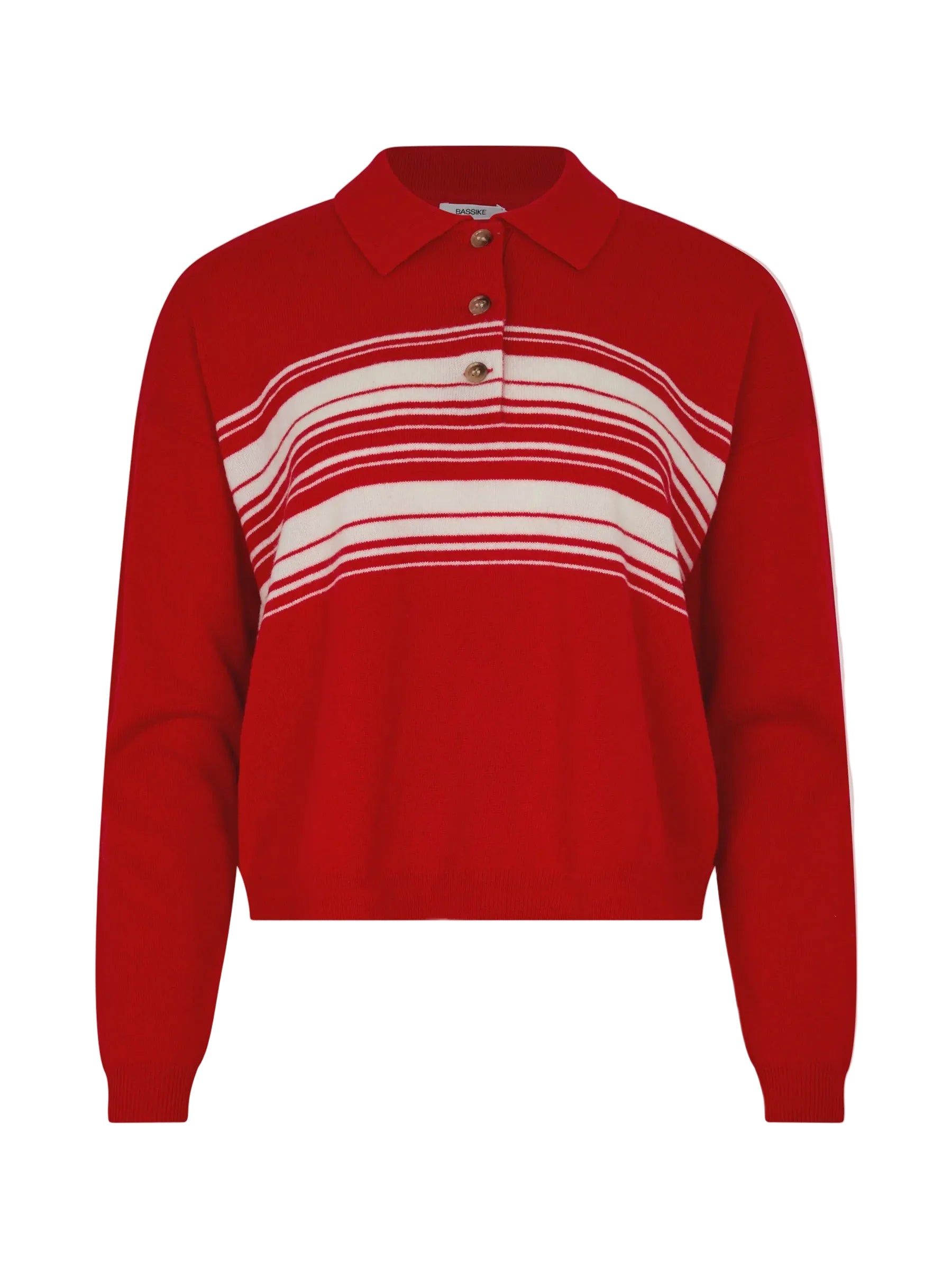 Bassike Stripe Wool Cashmere Polo in Red and Natural. The Fine Gauge Wool Cashmere Polo is a relaxed fit knit designed with subtle knitted stripe detailing. Crafted from a soft merino wool and cashmere blend, offering a lightweight feel with natural warmth and refined texture.