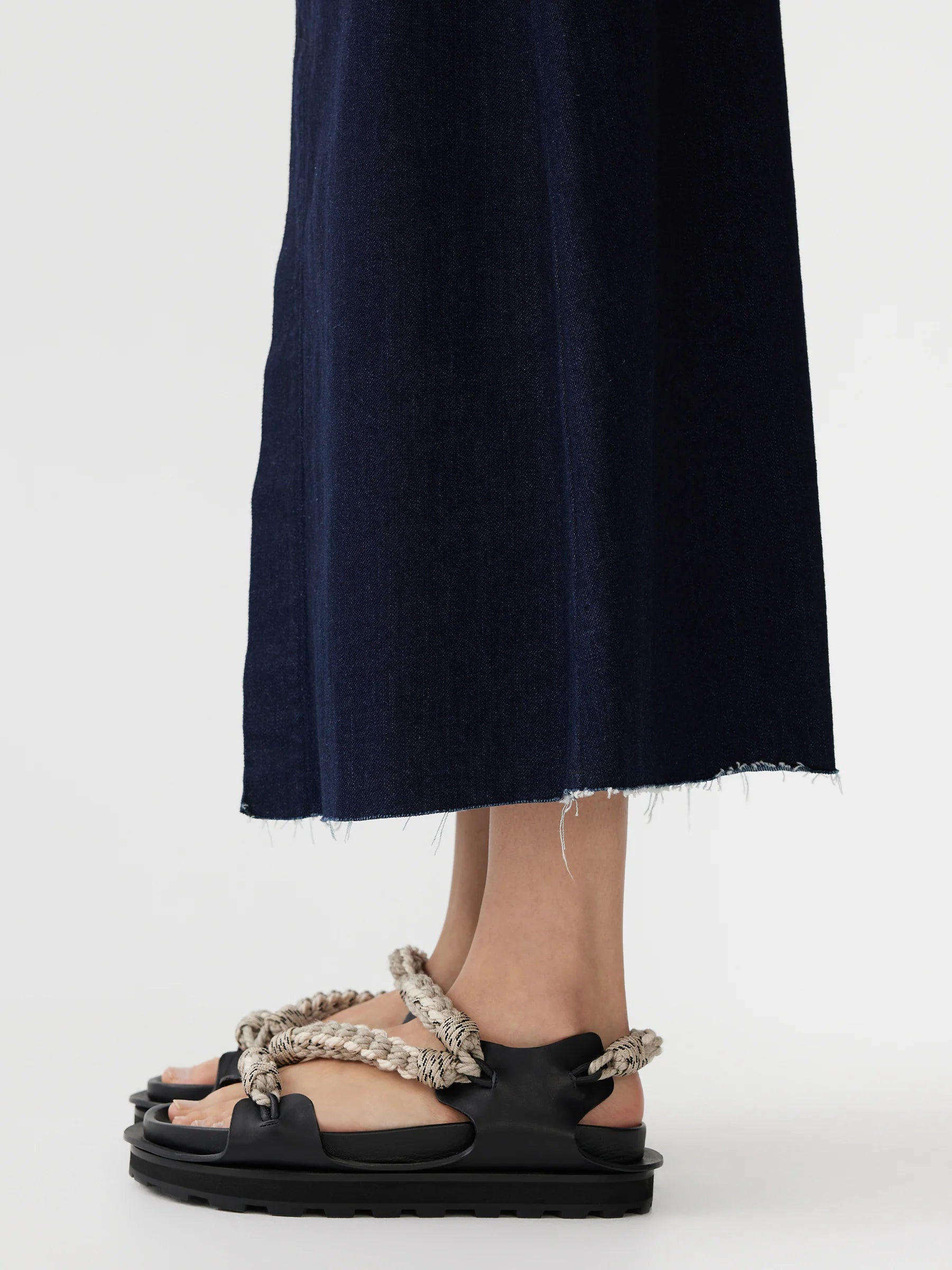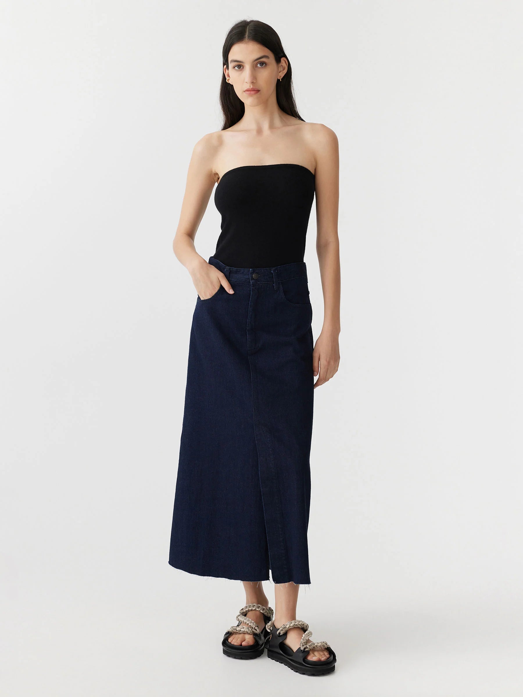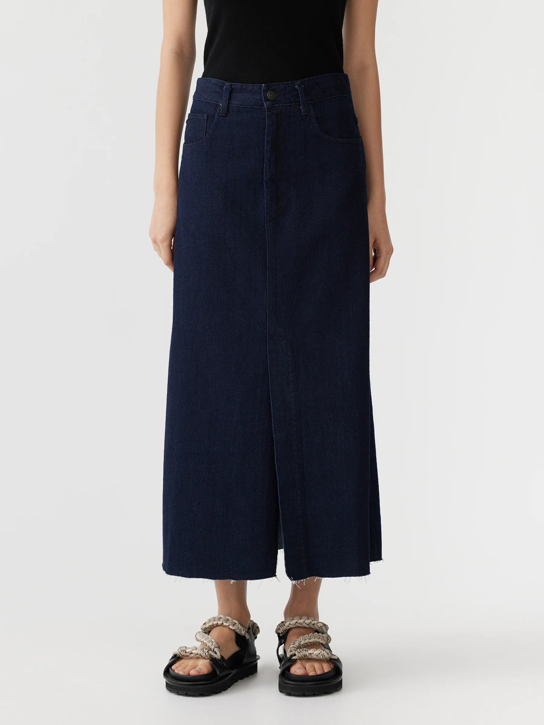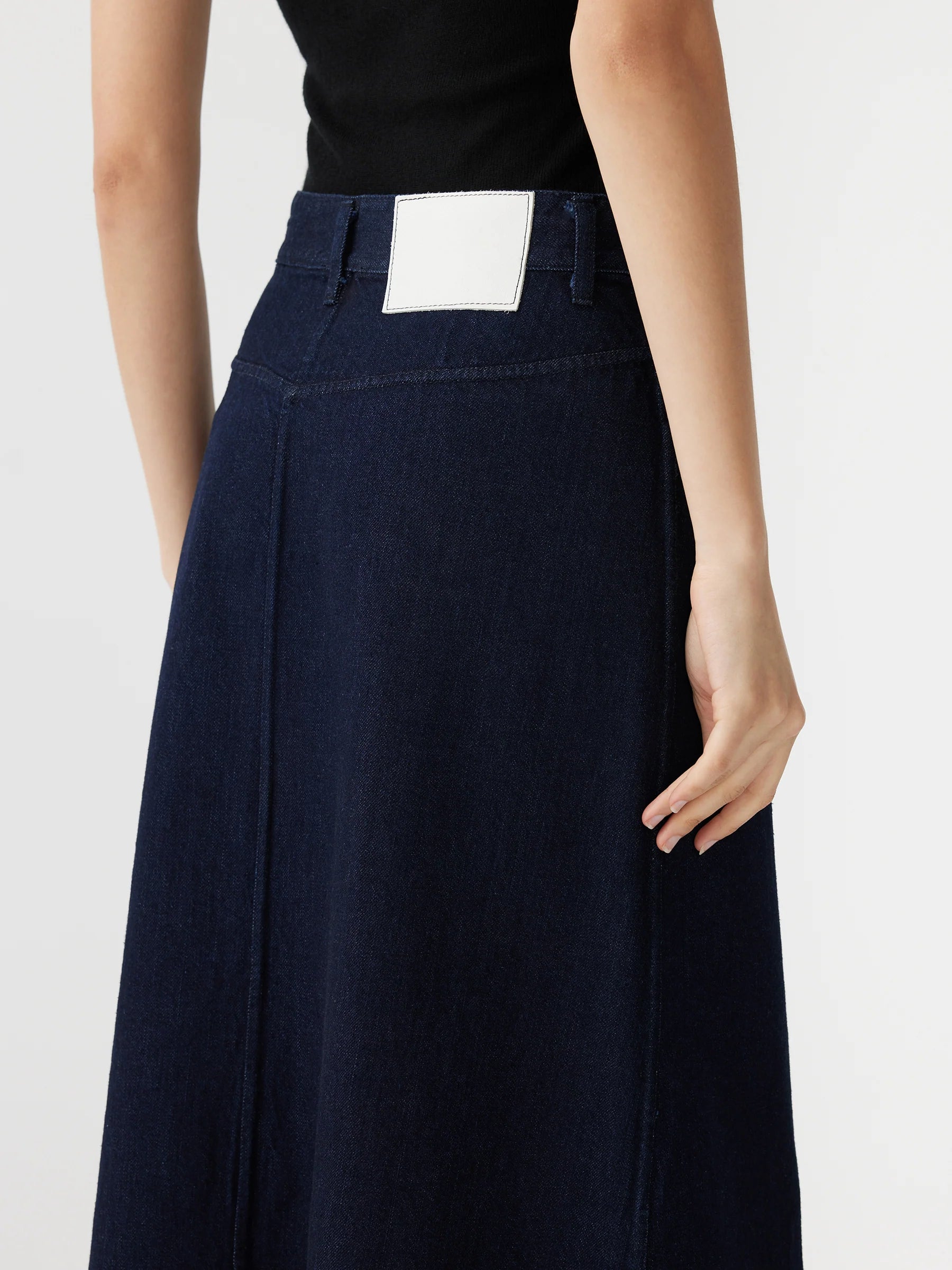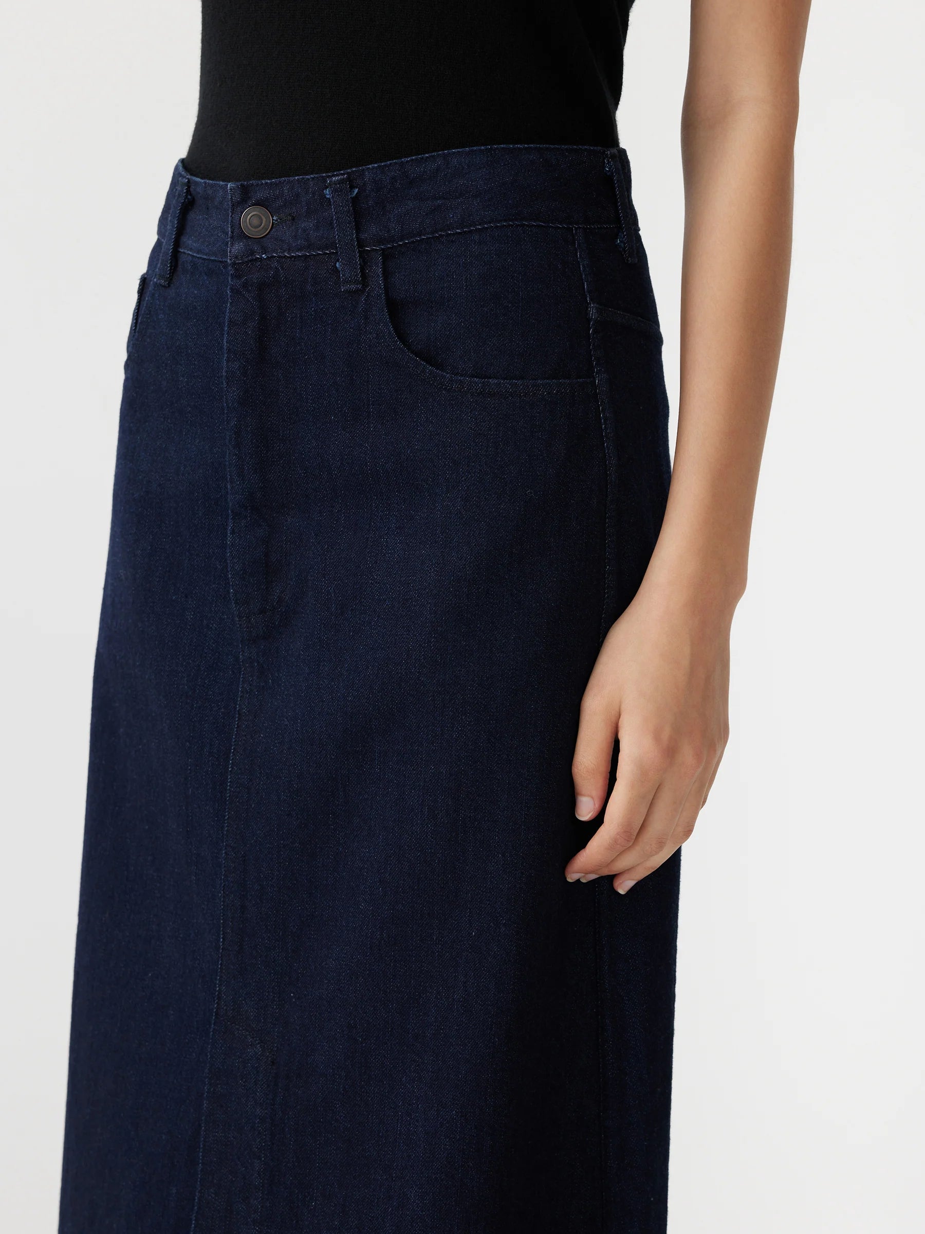 A longerline A-line skirt made from heavyweight denim. Finished with a front vent split, belt loops at waist and side entry pockets.