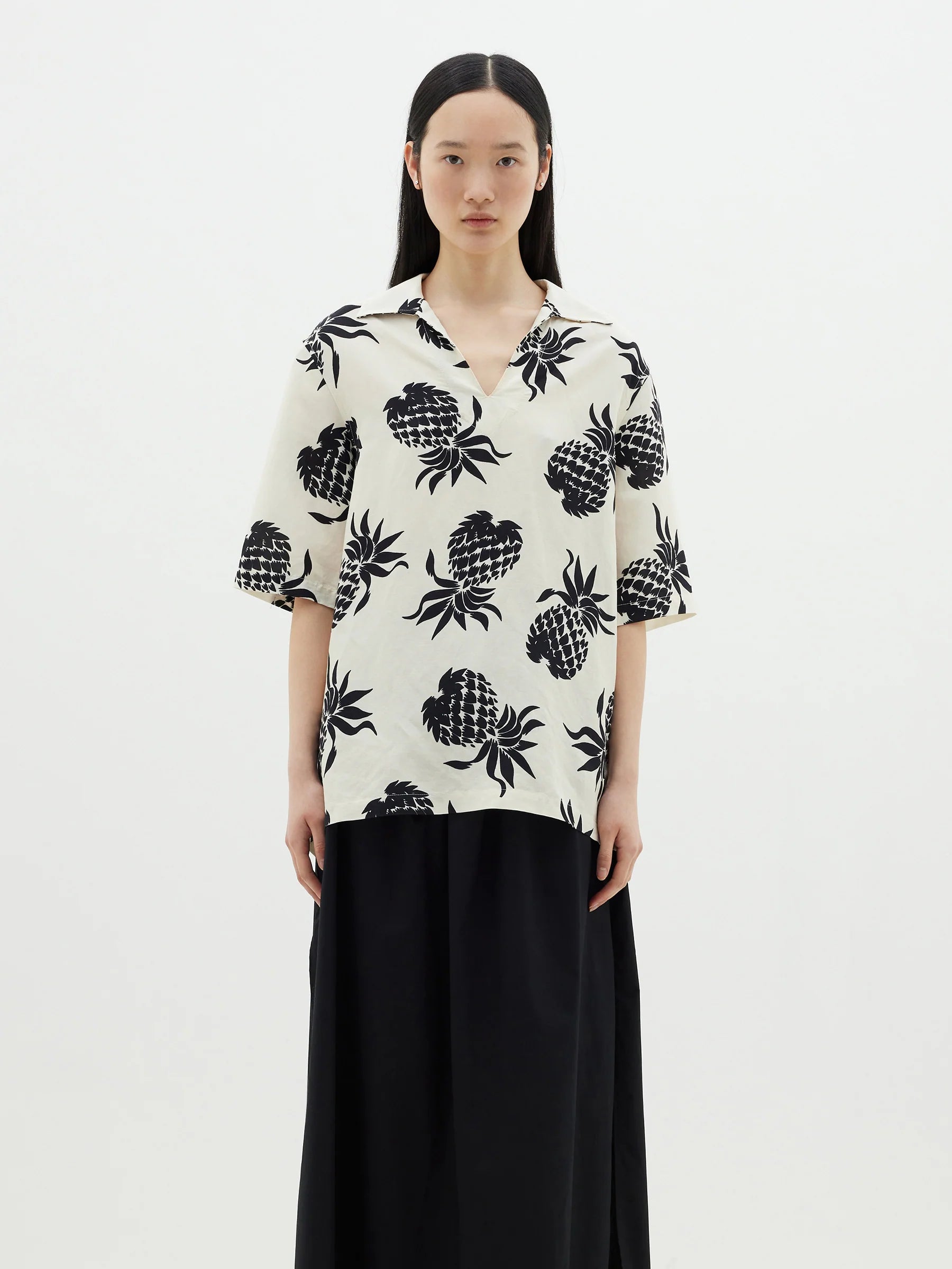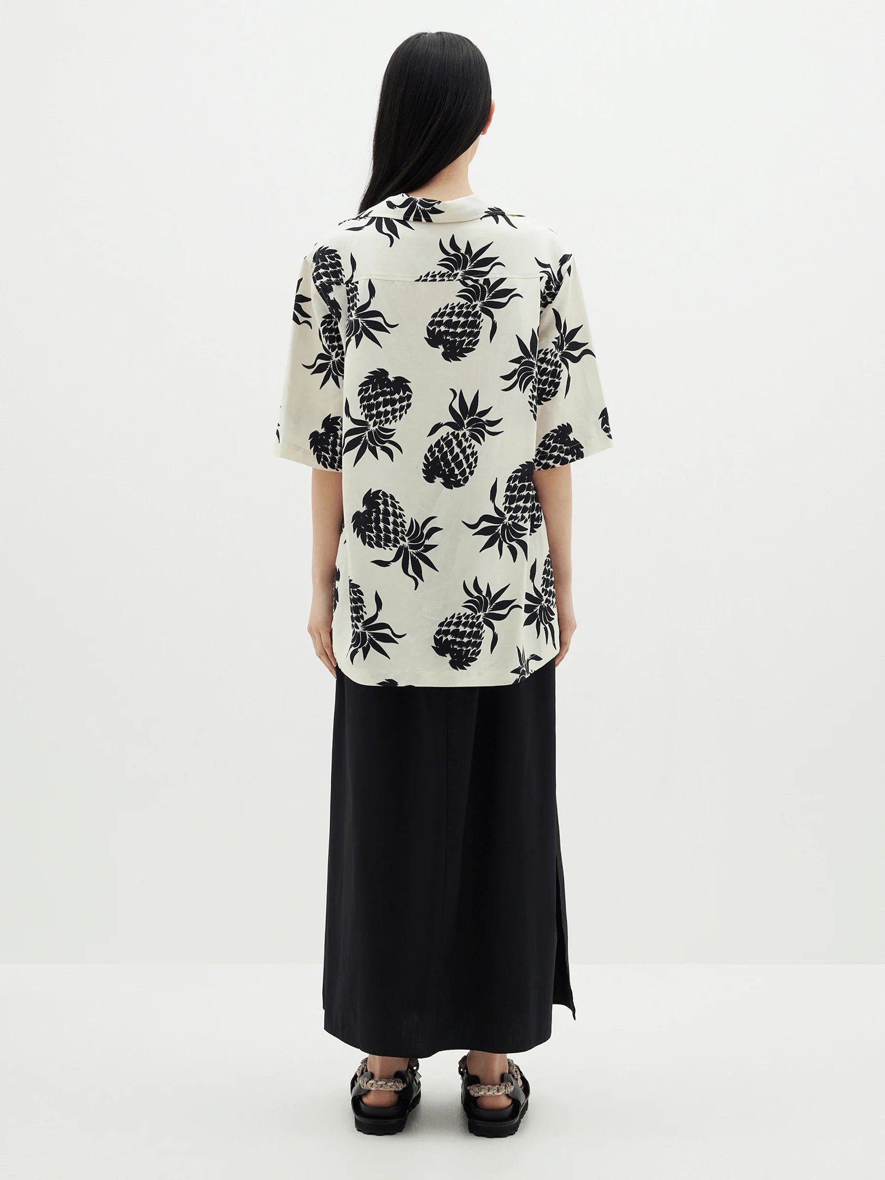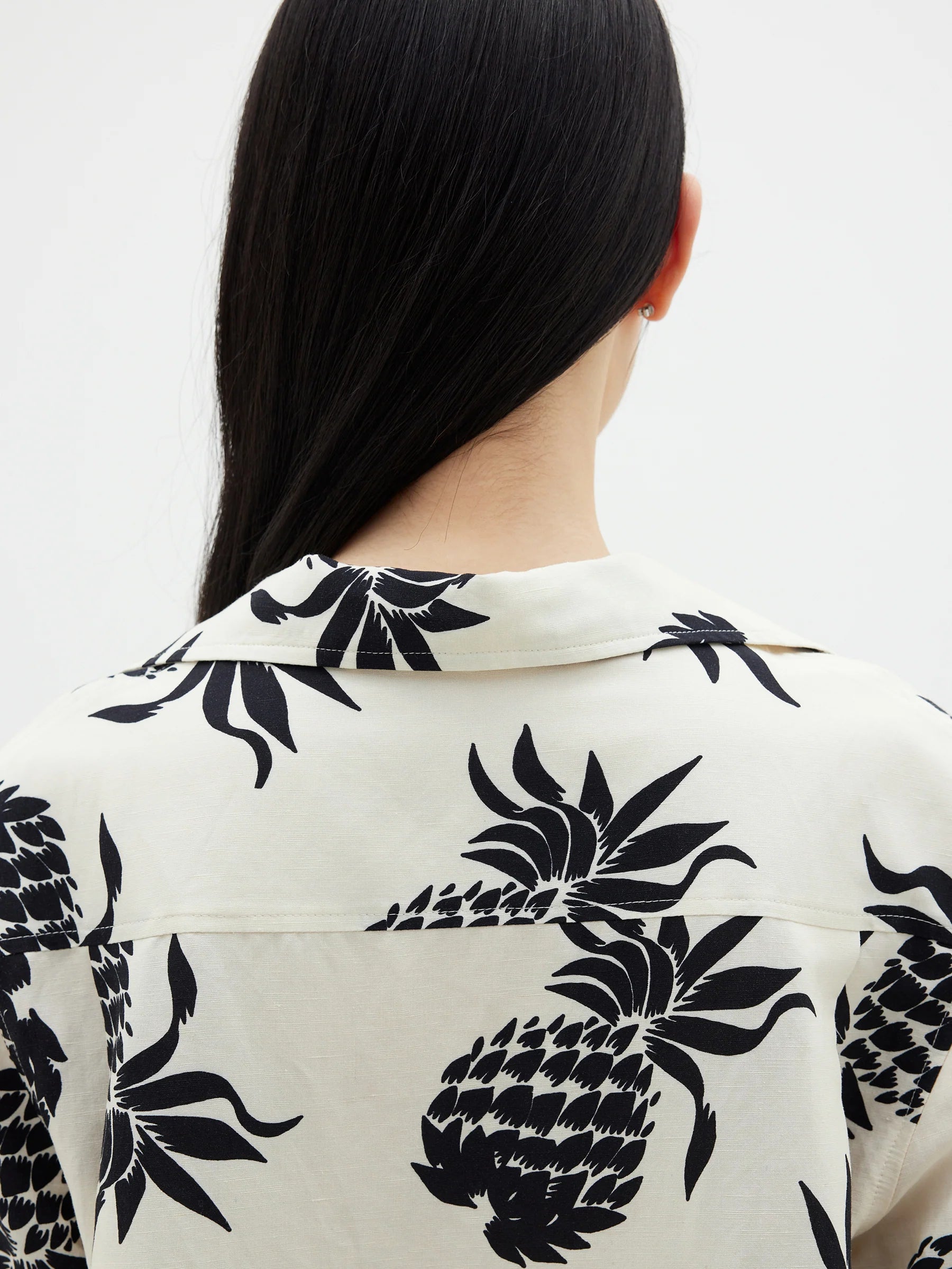 The pineapple print shirt is a cotton elevated button up shirt with above elbow sleeves.