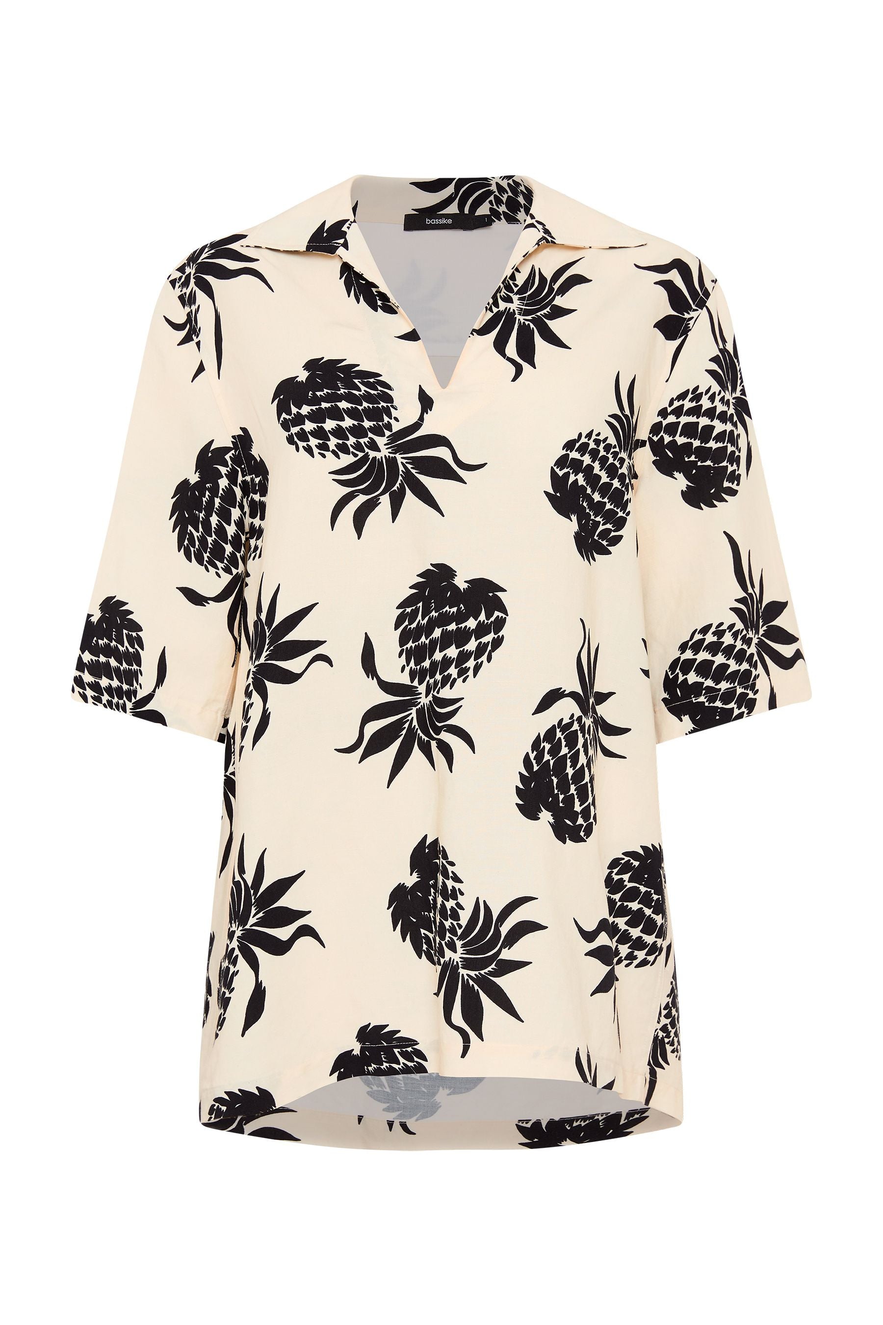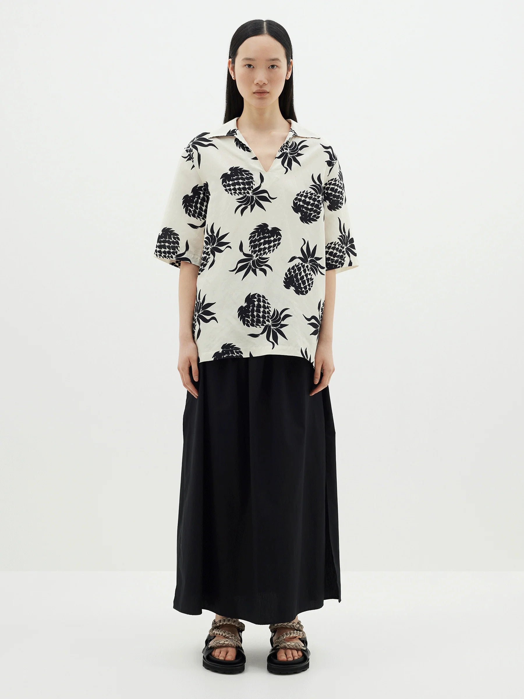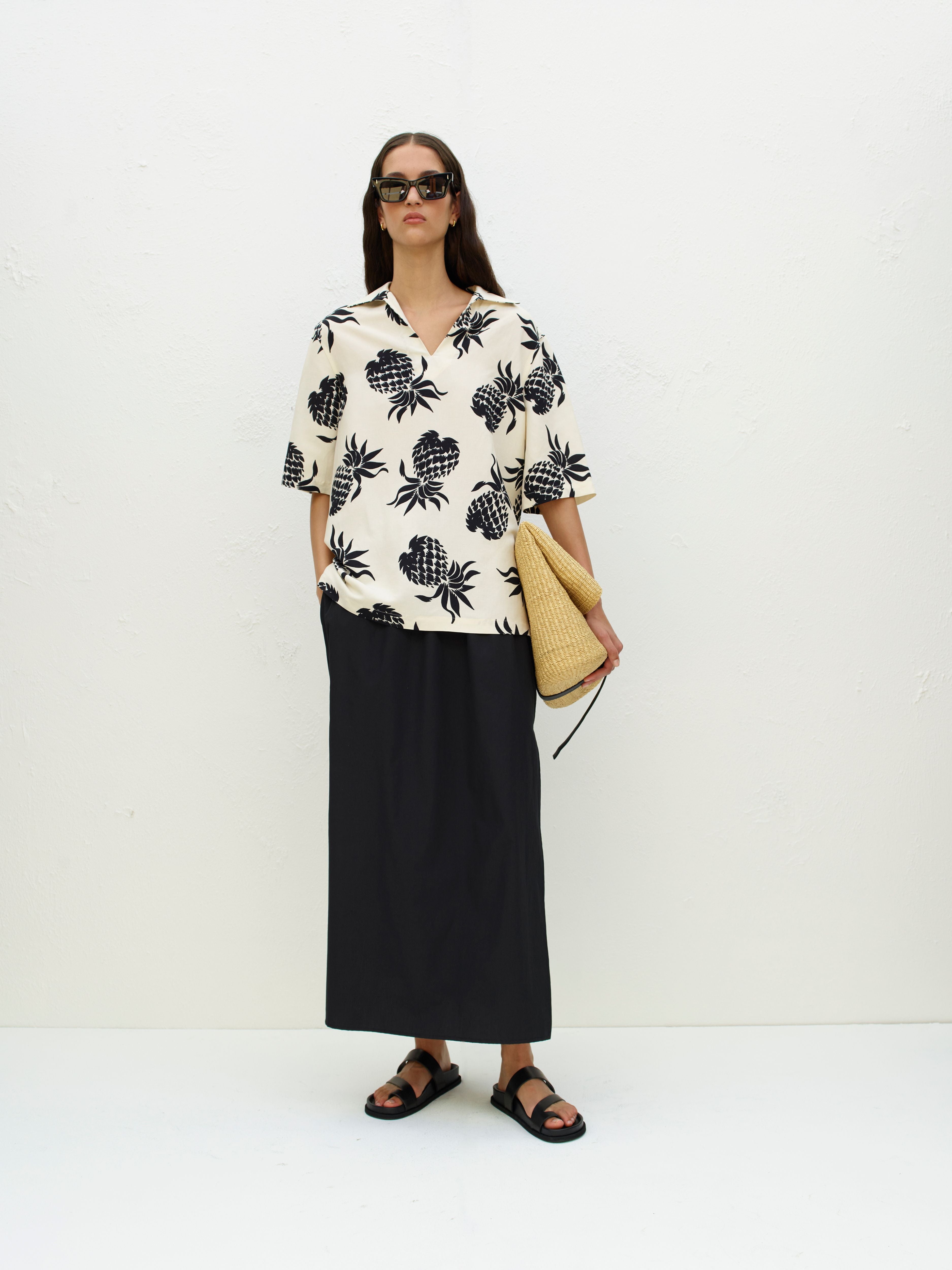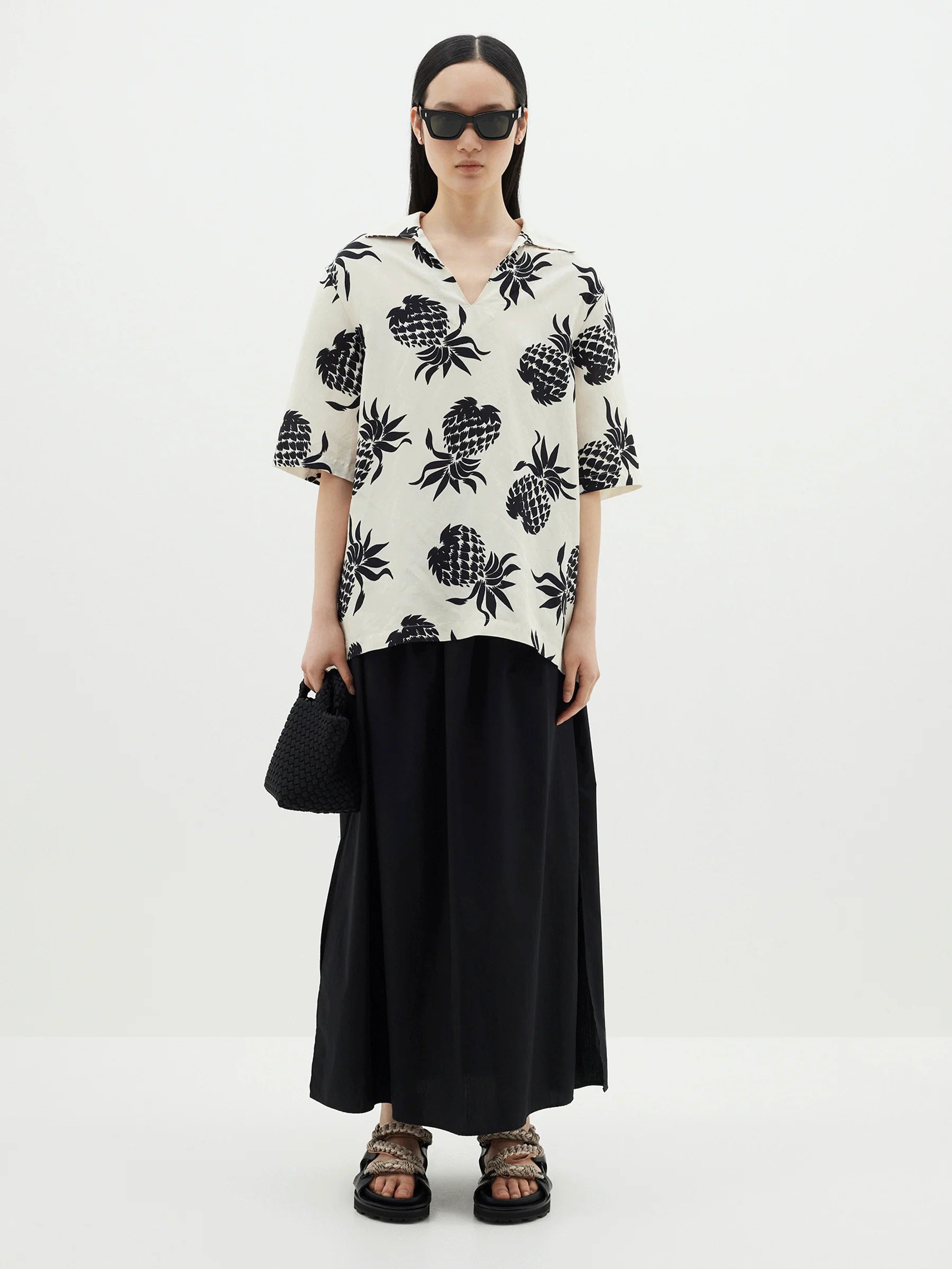 The pineapple print shirt is a cotton elevated button up shirt with above elbow sleeves.