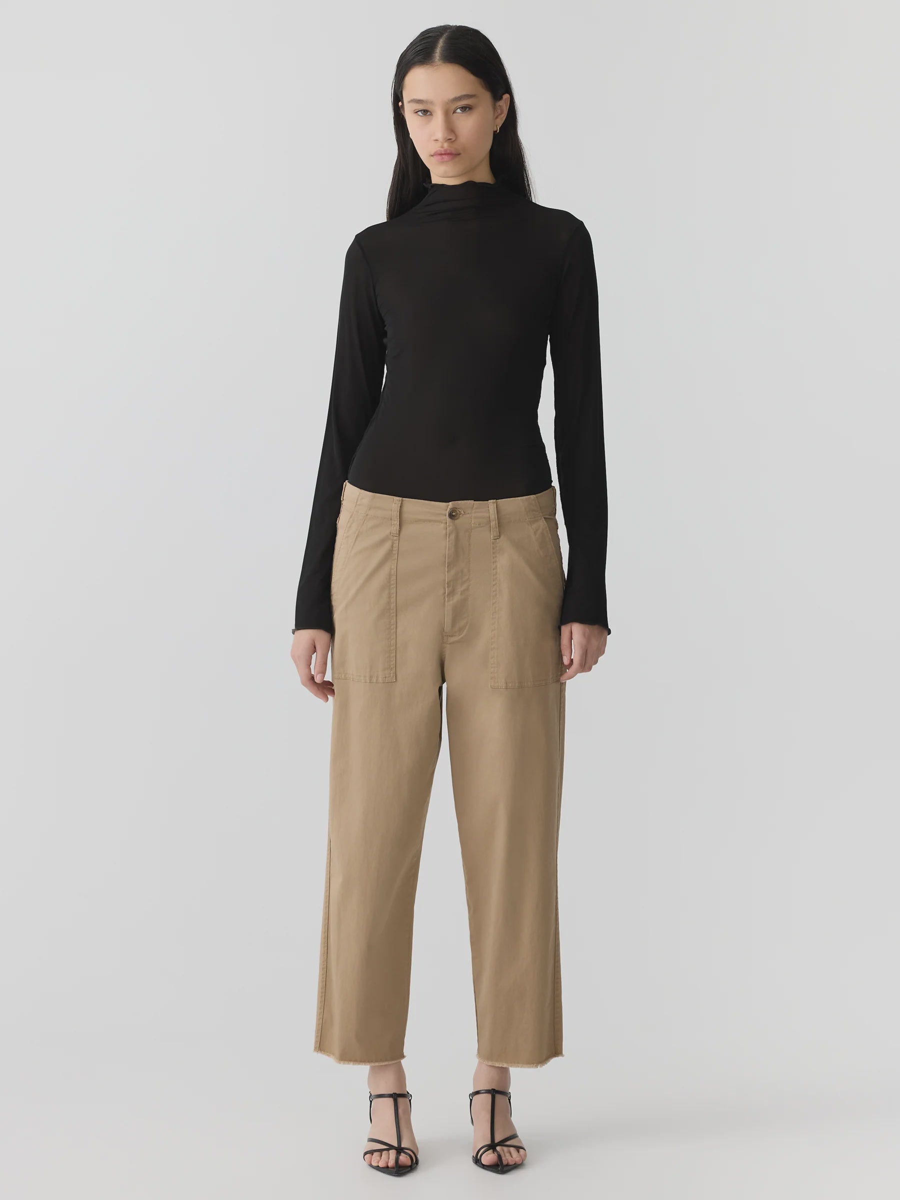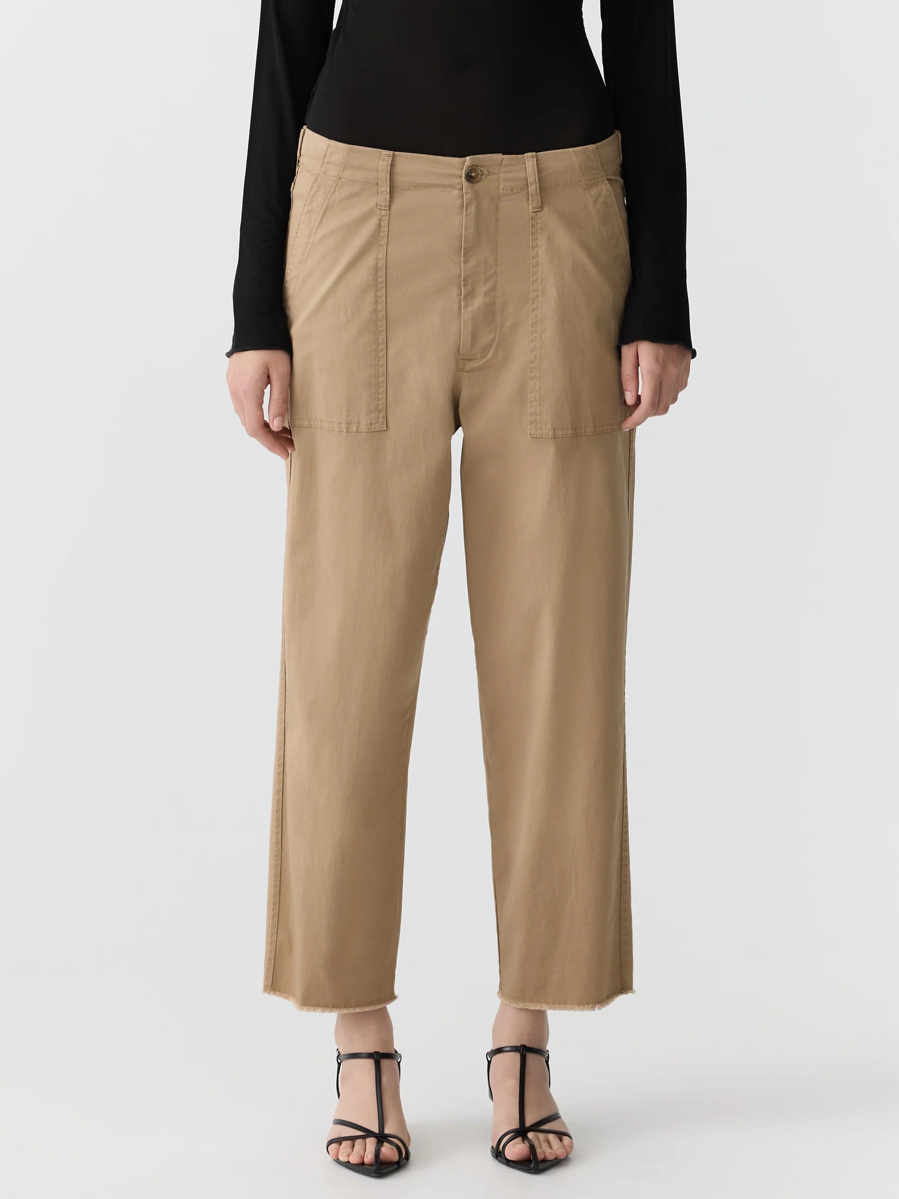 The stretch cotton relaxed pant boasts a regular fit, low-rise, straight leg and raw hem detail. Crafted from a premium cotton elastane blend woven in spain, the final garment is refined by slant front patch pockets, 2 back patch pockets and an adjustable button tab.