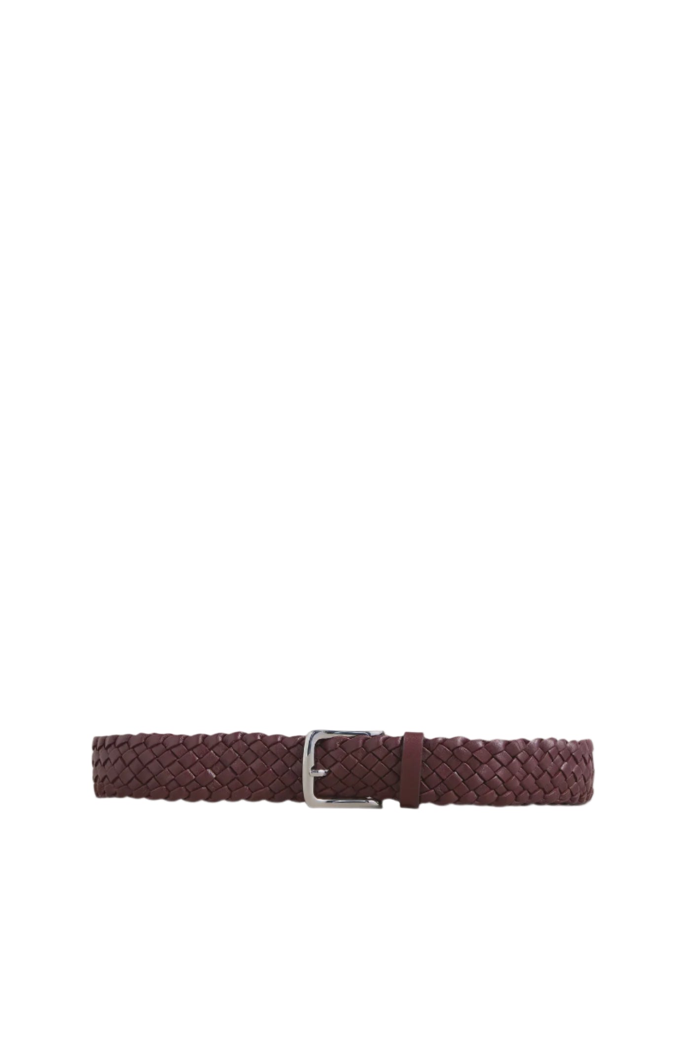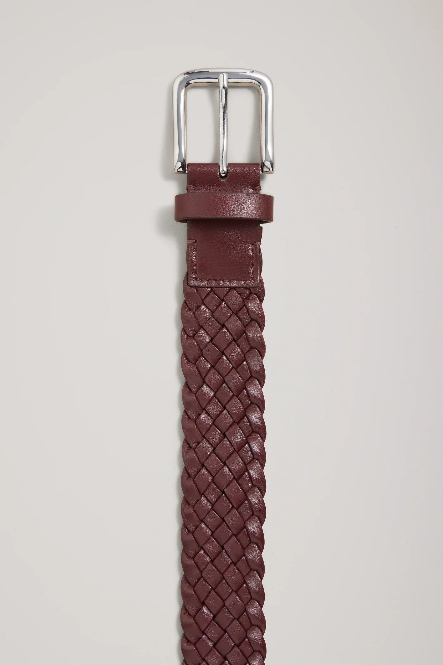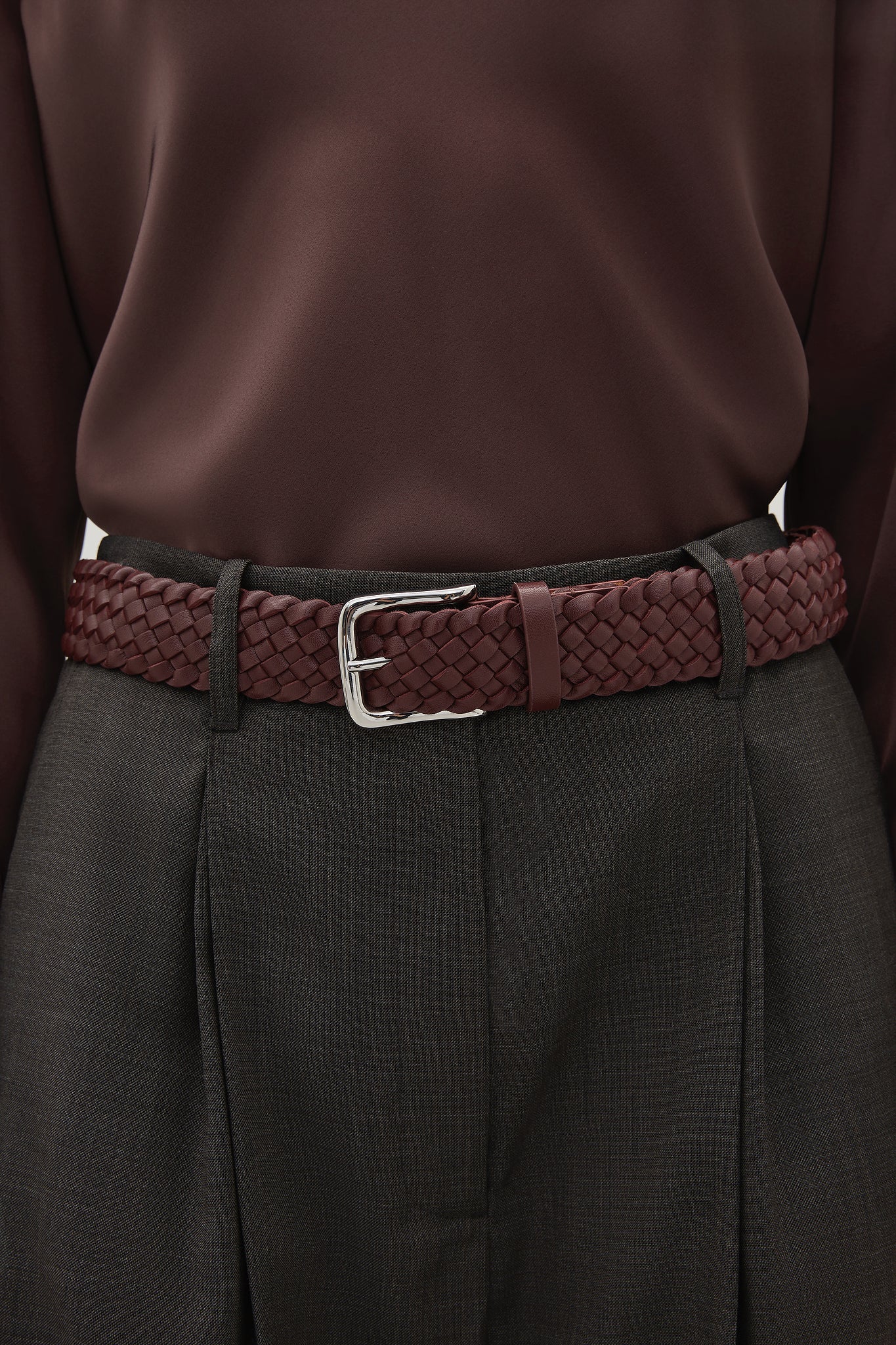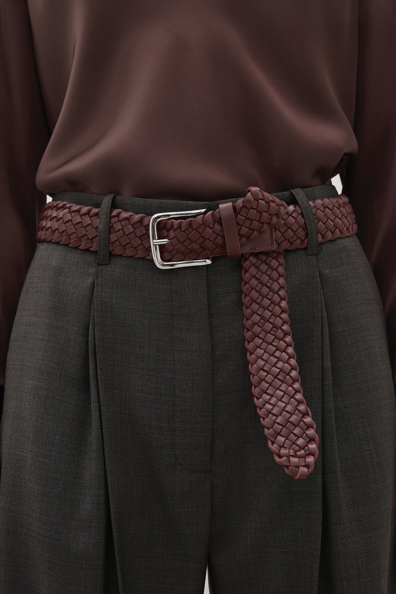 A Emery Kya Belt in Merlot. The Kya Belt is an elevated, everyday wardrobe staple crafted from leather featuring a braided belt strap and a silver buckle.