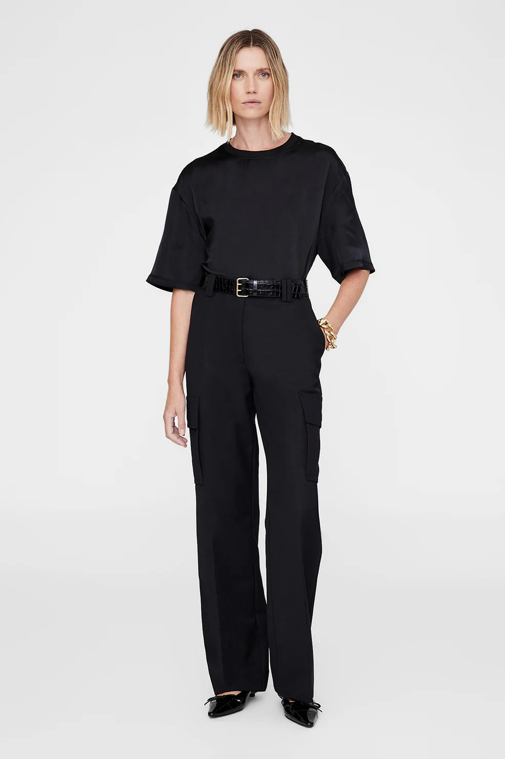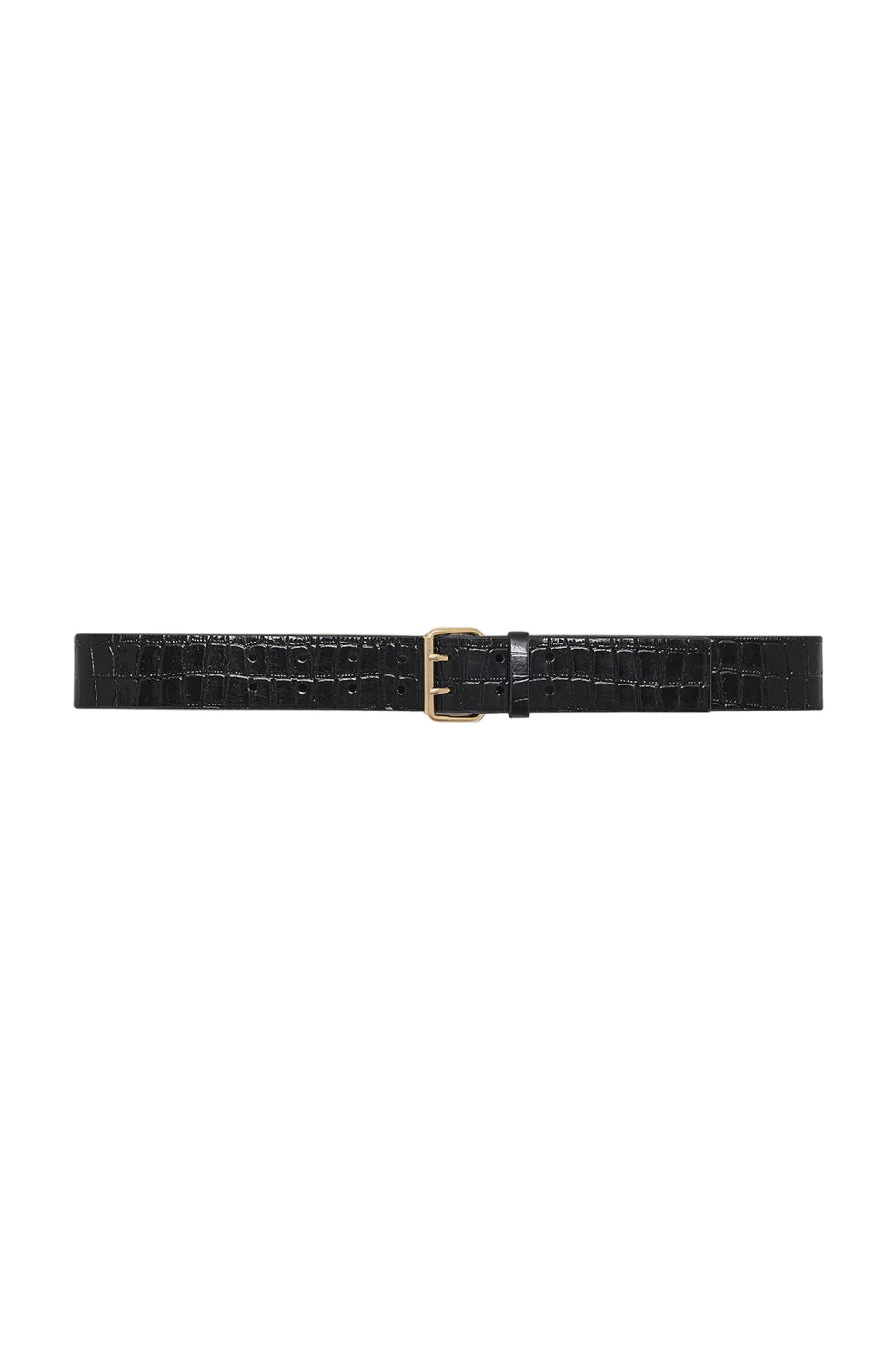 Anine Bing Mila Belt in Embossed Black. A thick, utility-inspired belt made from 100% leather stamped with faux croco-embossed texture in a high-shine finish. This modern style features a double-prong roller buckle in gold-tone hardware.