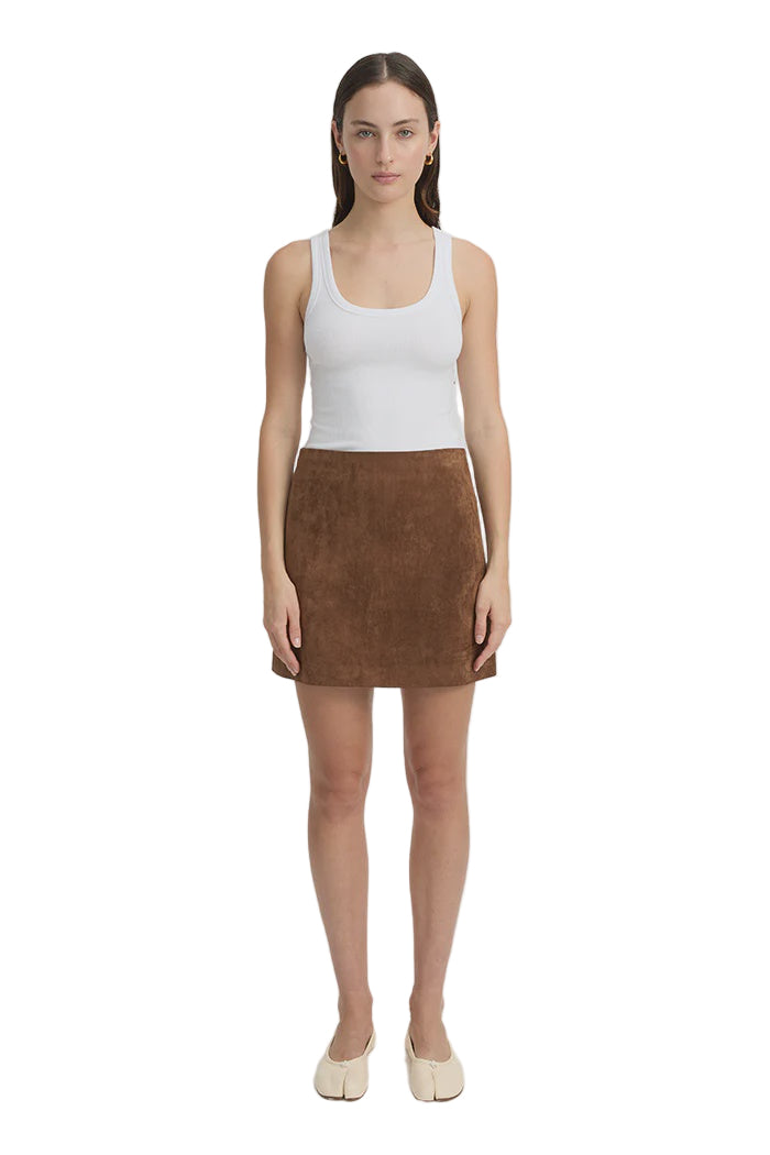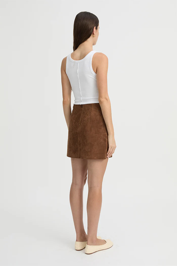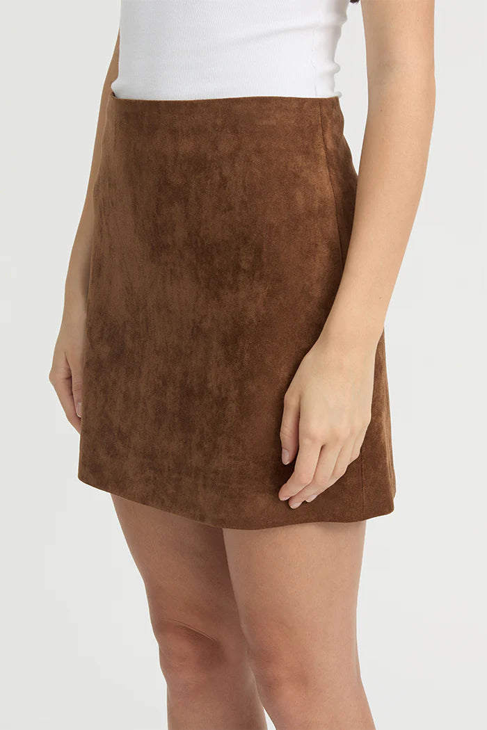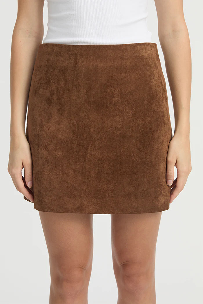 Blanca Fraser Skirt in Coffee. Rich and earthy like a perfect espresso, the Fraser Skirt is the kind of wardrobe essential that elevates any look, hugging the hips with a flattering fit, while the soft suede texture adds depth and richness to your look. Whether you’re pairing it with a cozy sweater for a casual day out or dressing it up with a silky blouse and heels for a night out, this mini skirt offers endless styling possibilities. Its warm, coffee hue is as versatile as it is timeless, making it a wardrobe staple you'll reach for season after season. Wherever you wear it, this skirt adds that perfect touch of understated elegance.