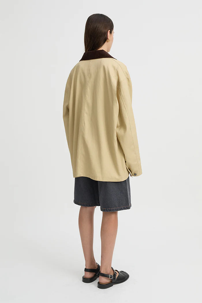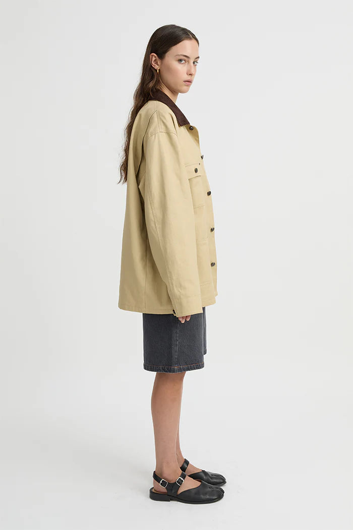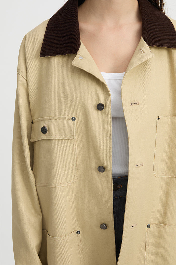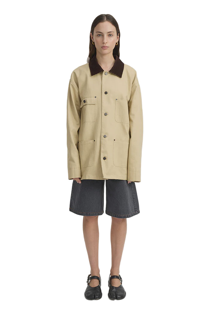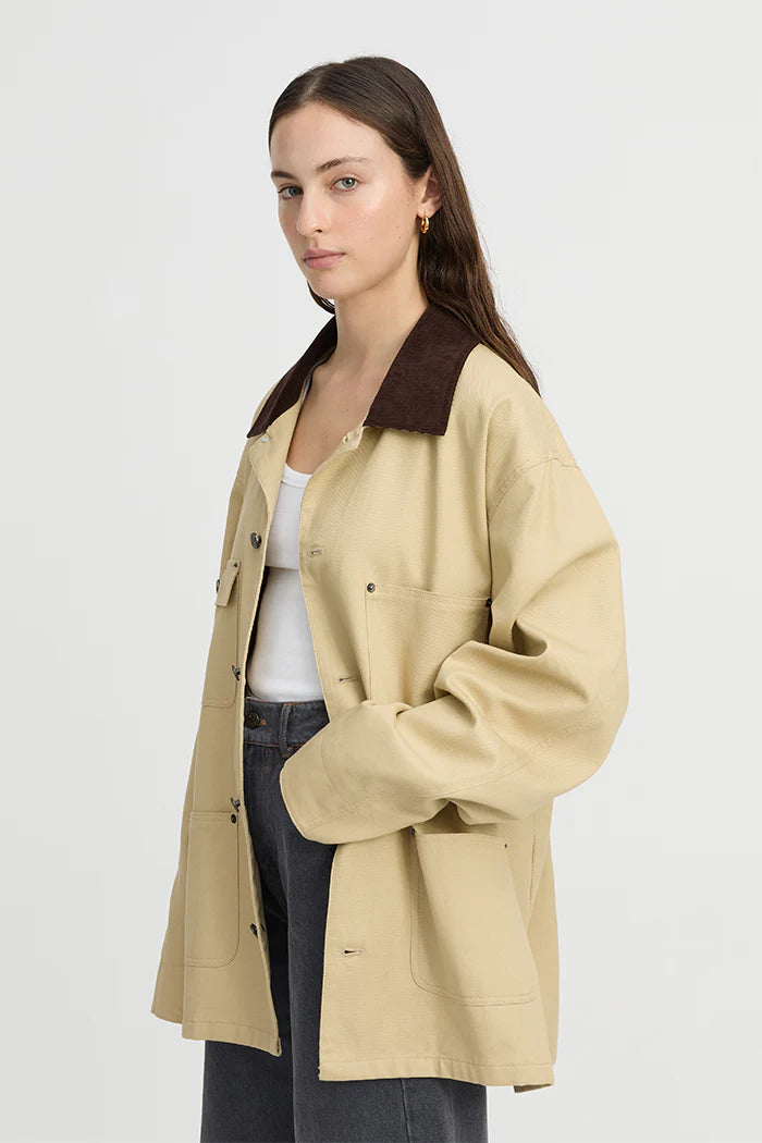 Blanca Louis Barn Jacket in Cream. Introducing the Louis Barn Jacket in Cream – the perfect blend of rugged charm and effortless style. Designed to take you through the seasons with ease, this relaxed jacket features four functional pockets, offering practicality without compromising on style. The distinctive brown fabric and color contrast at the collar adds a unique touch, setting this piece apart from your average jacket. Whether you're layering it over a casual tee for a laid-back weekend look or pairing it with tailored trousers for a more refined, everyday vibe, the Louis Barn Jacket is an essential that works with everything. Throw it on over your favorite denim or pair it with a simple dress for an easy, all-occasion outfit. Versatile, stylish, and timeless—this jacket is your go-to for the perfect balance of comfort and sophistication.
