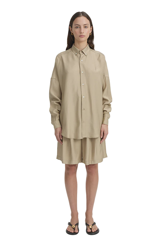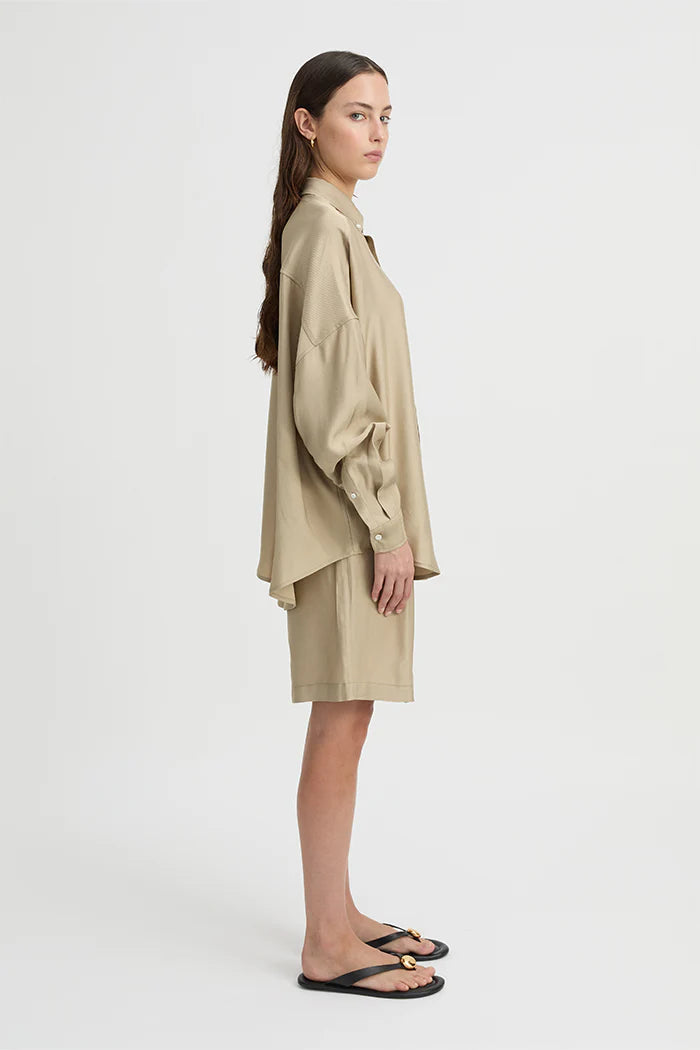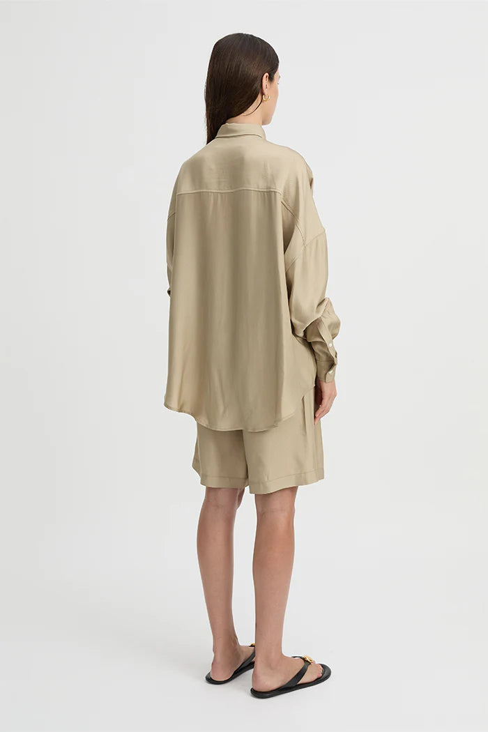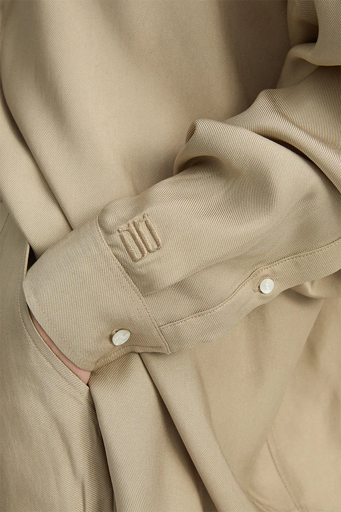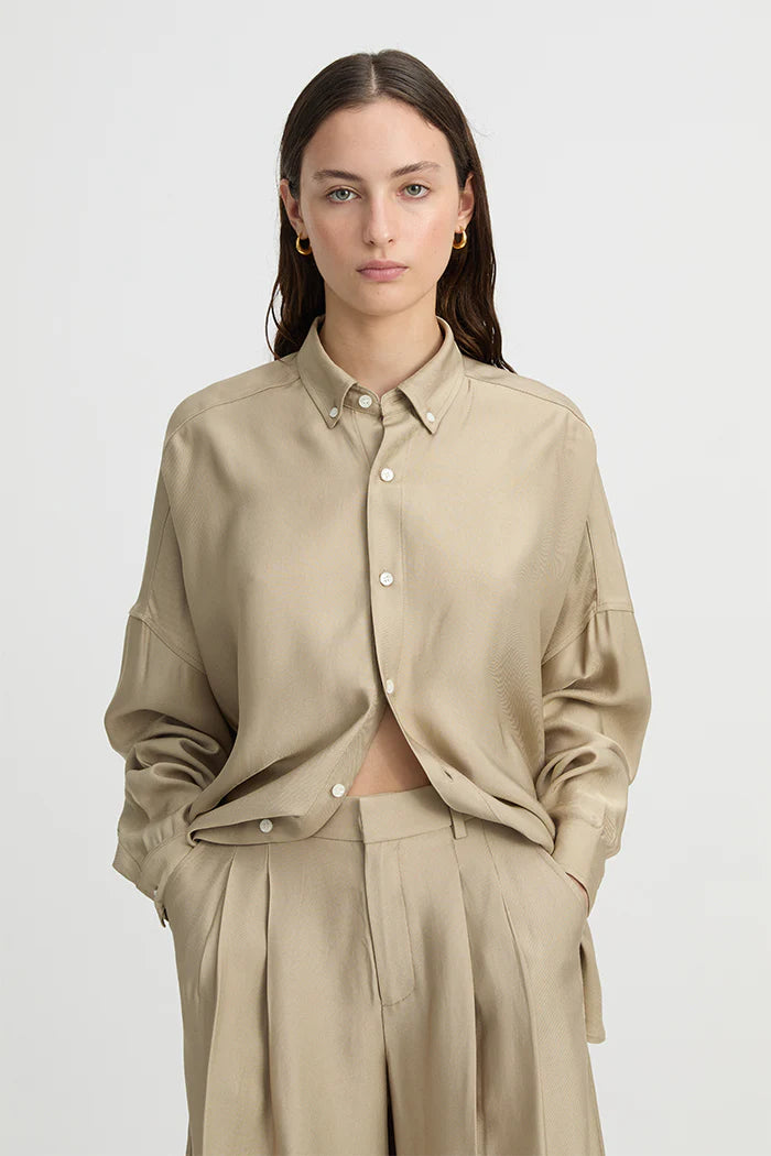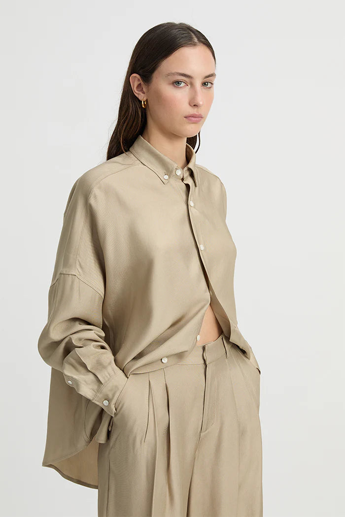 Blanca Olivia Shirt in Beige. Add effortless sophistication to your wardrobe with the Olivia Shirt in Beige. Crafted from smooth, luxurious acetate, this button-front long sleeve shirt exudes a sleek, drapey finish that feels as good as it looks. The subtle beige hue is the perfect neutral base, giving you endless styling options.