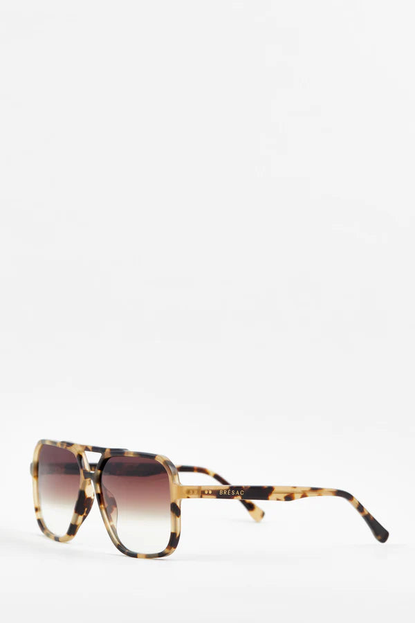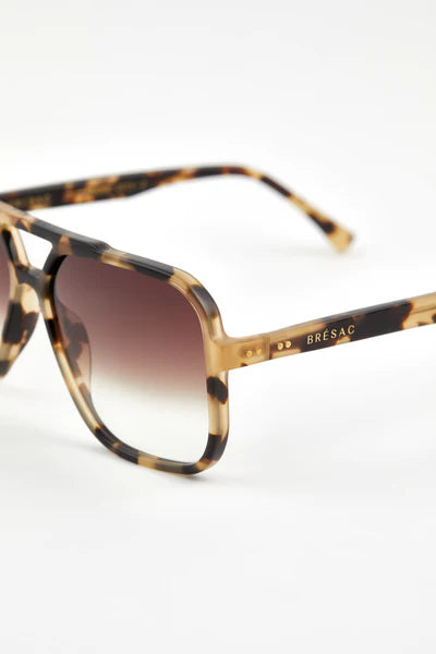 Bresac Frame 13 Sunglasses in Havana. Frame BF13 is a contemporary, oversized navigator aviator style frame. Sophisticated bridge detailing, angular temple design along with custom gradient lens make for a curated and elevating frame.