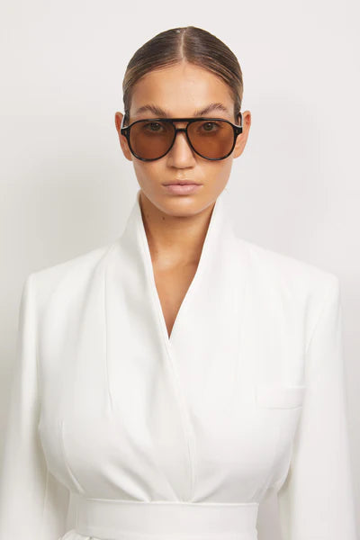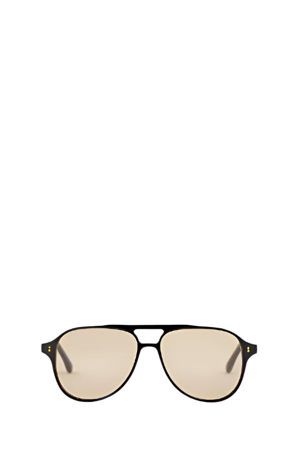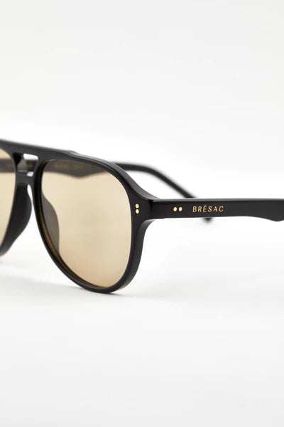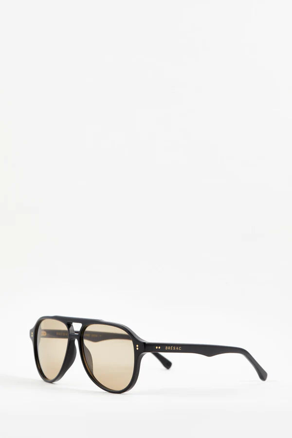 Bresac Frame 14 Sunglasses in Black. Frame BF14 presents as a modern take on the classic aviator design. Sharp lines, sculptural bridge detailing and structural detailed temples complimented with metal detailing result in a curated aviator style frame.