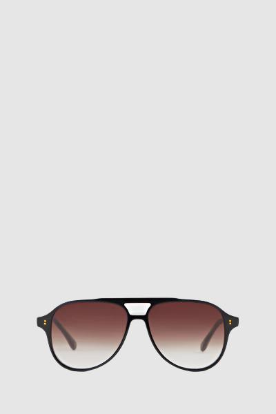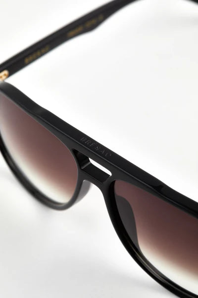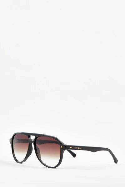 Bresac Frame 14 Sunglasses in Black Gradient. Frame BF14 presents as a modern take on the classic aviator design. Sharp lines, sculptural bridge detailing and structural detailed temples complimented with metal detailing result in a curated aviator style frame.
