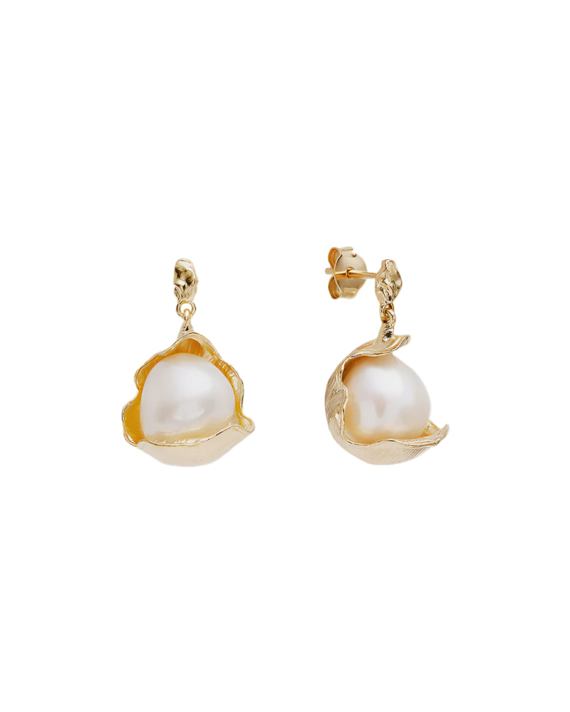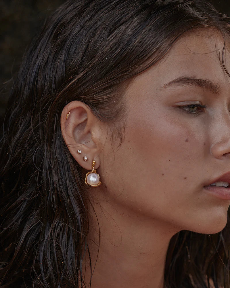 By Charlotte A Place to Dream Pearl Drop Earrings in 18K Gold Plated. The natural baroque pearls are encased in a sculptural, textured setting that mirrors the organic beauty of oceanic forms. Inspired by the quiet stillness of winter and the introspective serenity of the sea, this piece invites you to embrace moments of peace and inner harmony.