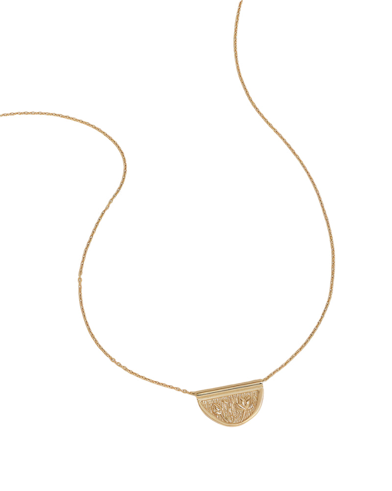 By Charlotte Blooming Together Lotus Necklace in 18K Gold Vermeil. Engraved with the words "Blooming together under the same sun", the Blooming Together Lotus Necklace depicts a blossoming lotus garden reaching towards the sun. This design is a poetic reminder that we are forever intertwined, through all seasons - rain, hail, or shine.