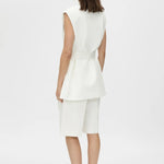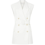 Camilla and Marc Astor Vest in White. The Astor Vest is crafted from a lightweight yet structured blend in an oversized silhouette. This vest features a turn-up collar with contrast pinstripe underneath and signature embroidery detail at the side seam split.