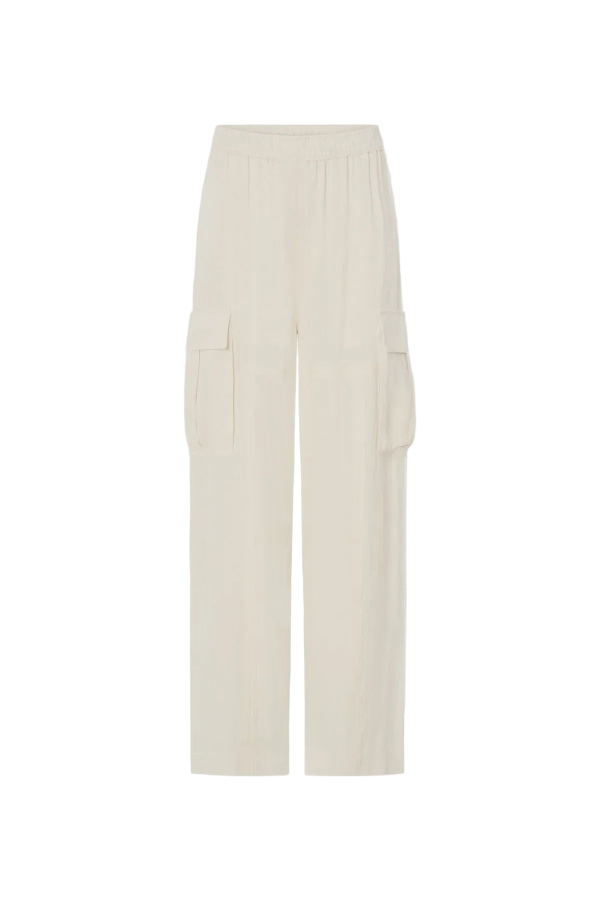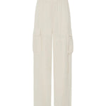 Camilla and Marc Allegro Satin Pant in Cream. CAMILLA AND MARC Allegro satin mid-rise cargo pant in cream with external seam details. Dropped crotch, elasticated gathered waistband. Cargo pockets with box pleats.