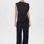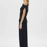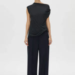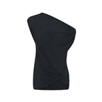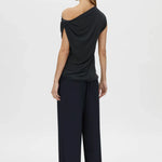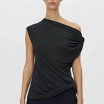 Camilla and Marc Ando Top in Dusty Blue. The Ando Top is a refined statement piece, featuring an off-shoulder mesh design with an asymmetric drape that twists gracefully over the hip and shoulder. A low scoop back neckline enhances its contemporary allure, while the draped yet fitted waistline flatters the silhouette effortlessly. Designed for versatility, this piece transitions seamlessly from day to evening with understated sophistication.