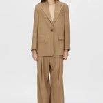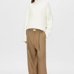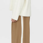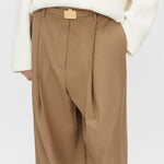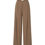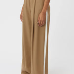 Camilla and Marc Balsam Pant in Camel. The Balsam Pant features a tailored fit with a bold contrast side stripe and topstitching detail for a refined yet modern look. Designed with permanent pressed pleats down both the front and back legs, it offers a sharp, structured silhouette. The waist is accentuated with a speciality metal buckle belt, adding an elegant touch to this statement piece.