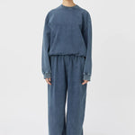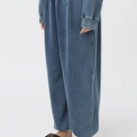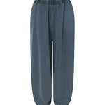 Camilla and Marc Dovell Pant in Indigo. The Dovell Pant features a gathered elasticated waist for a comfortable, fitted feel and an encased elasticated hem for a refined finish. Designed to sit mid waist, these denim trackpants offer a relaxed yet stylish silhouette. Ideal for casual days, they combine practicality with effortless style.