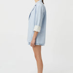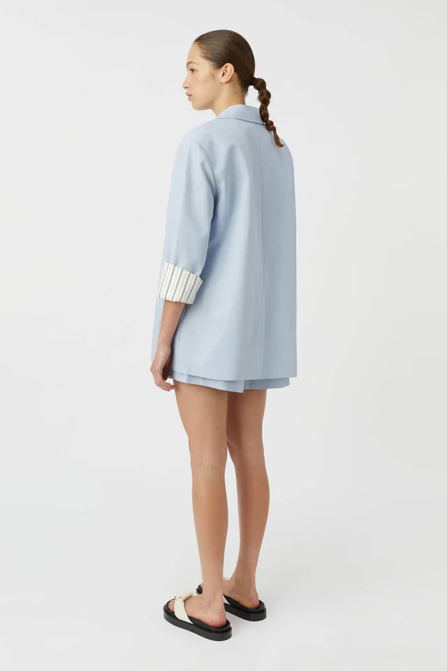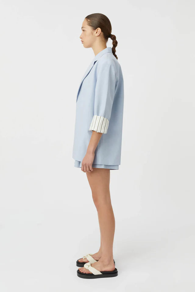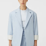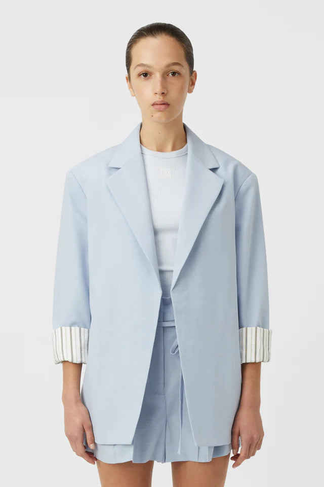 Camilla and Marc Elliot Blazer in Blue Haze. The Elliot Blazer is a versatile piece that effortlessly blends casual style with refined details. Featuring roll-up contrast stripe cuffs and a lightweight thin shoulder pad, it offers a relaxed yet polished look. The inseam pockets add practicality, making this blazer a functional and stylish choice for any occasion.