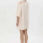 Camilla and Marc Lolani Dress in Soft Pink. The Lolani Dress is crafted from a linen blend in a short-sleeved mini silhouette. This dress features an embroidered circle motif and a dropped shoulder seam.