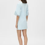 Camilla and Marc Lolani Mini Tee Dress in Ice Blue. The Lolani Mini Tee Dress is crafted from cotton in a relaxed silhouette. This dress features an embroidered circle tee mini dress and an embroidered circle motif panel at the sleeve hem.