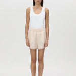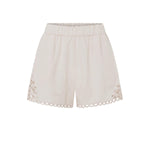 Camilla and Marc Lolani Short in Soft Pink. The Lolani Short is crafted from a linen blend in a relaxed mid-rise silhouette. This short features embroidered circle details at the hem with an elasticated waistband.