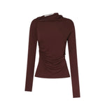 Camilla and Marc Mai Long Sleeve Top in Almadine. The Mai Long Sleeve Top features a unique twisted asymmetric neckline, adding a modern touch to its elegant design. Tucks along the side seam create a flattering silhouette, enhancing its shape with a sophisticated drape. Fully lined for comfort, this top offers both style and refinement in one.