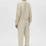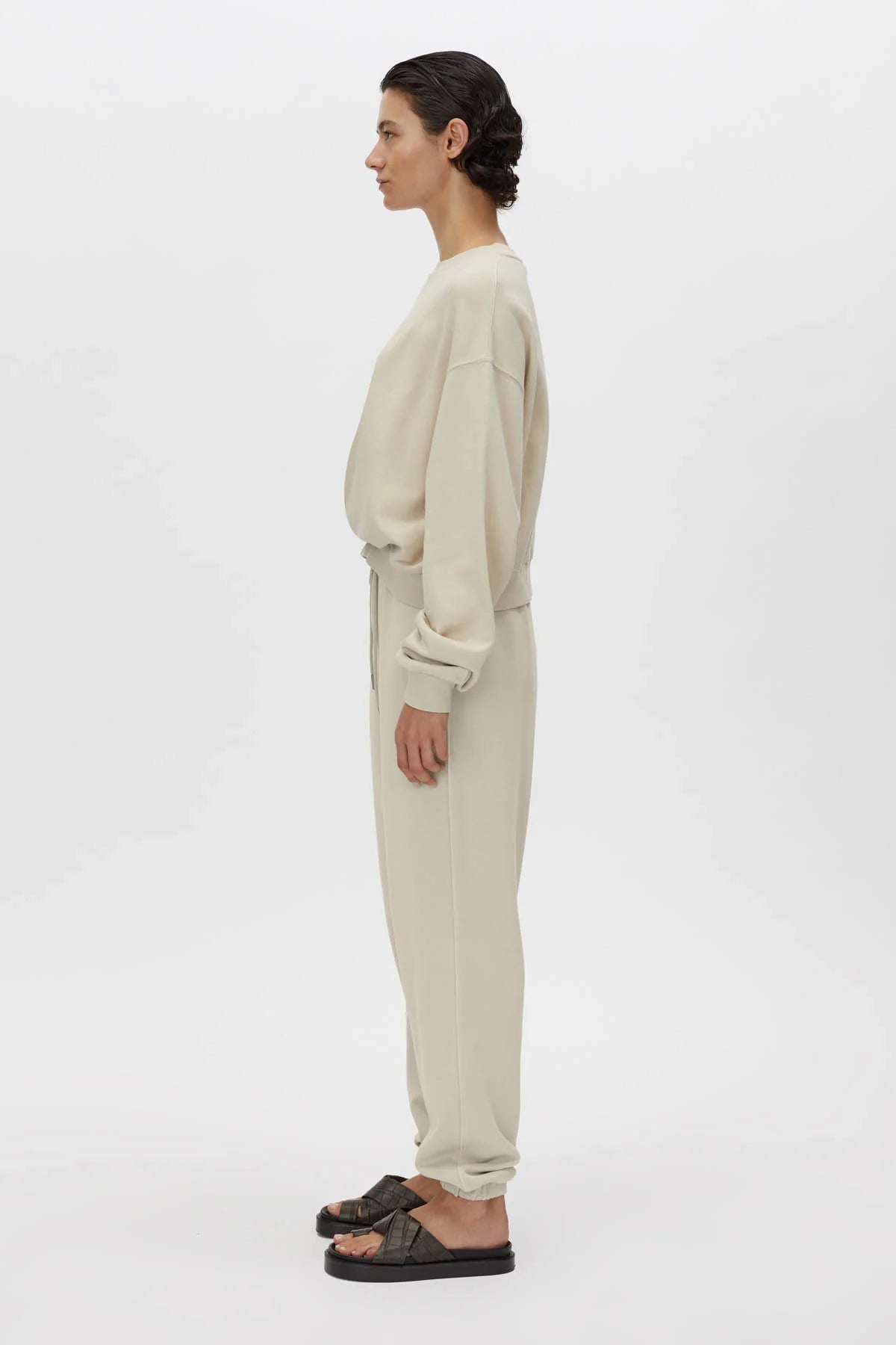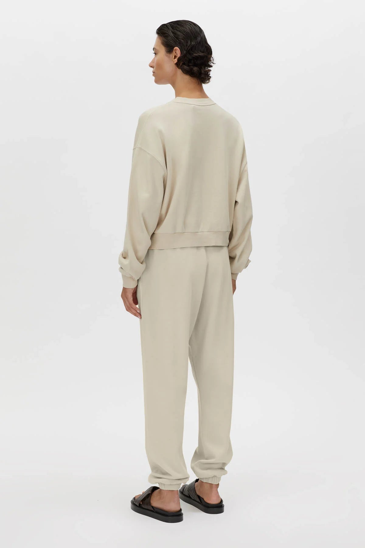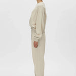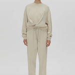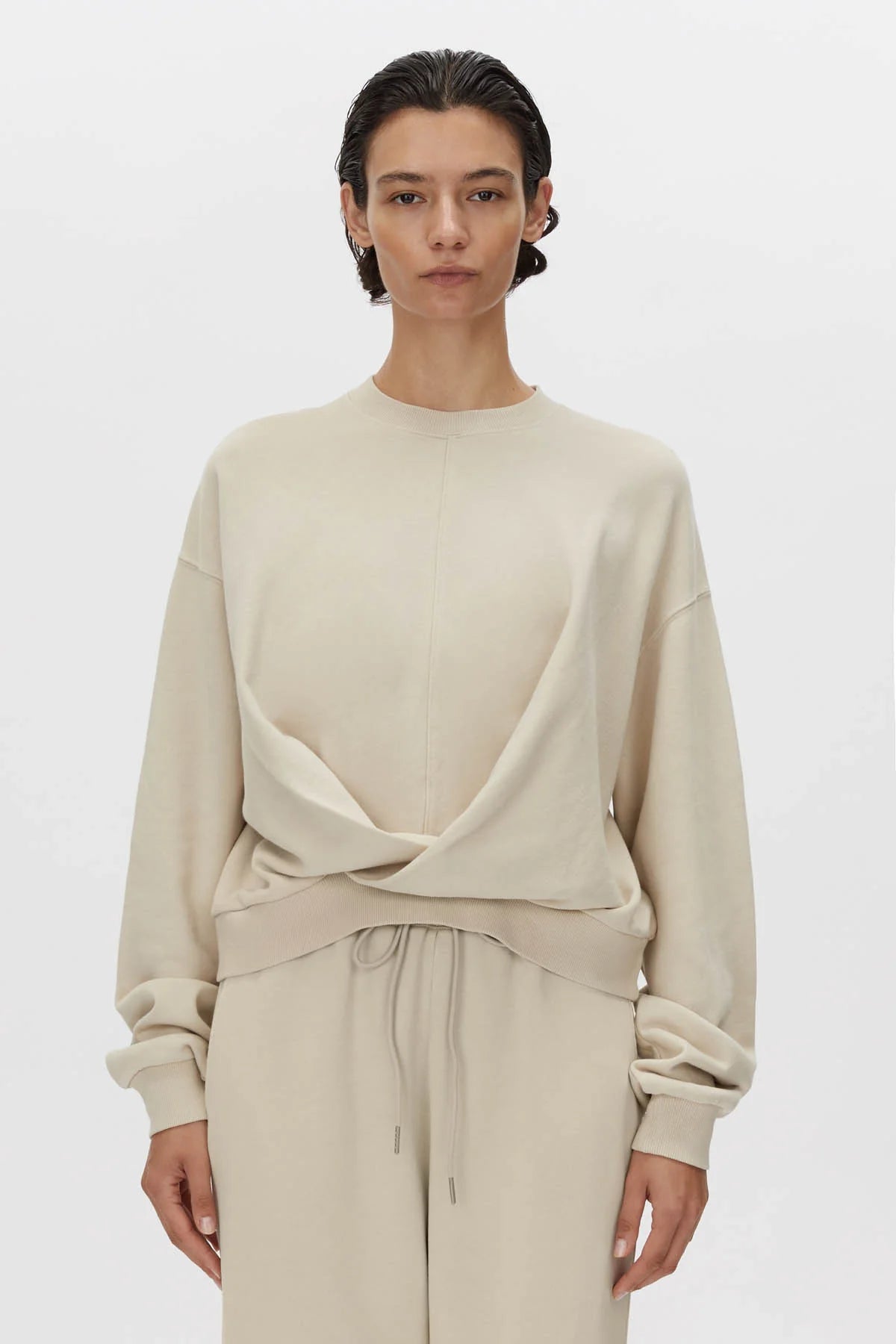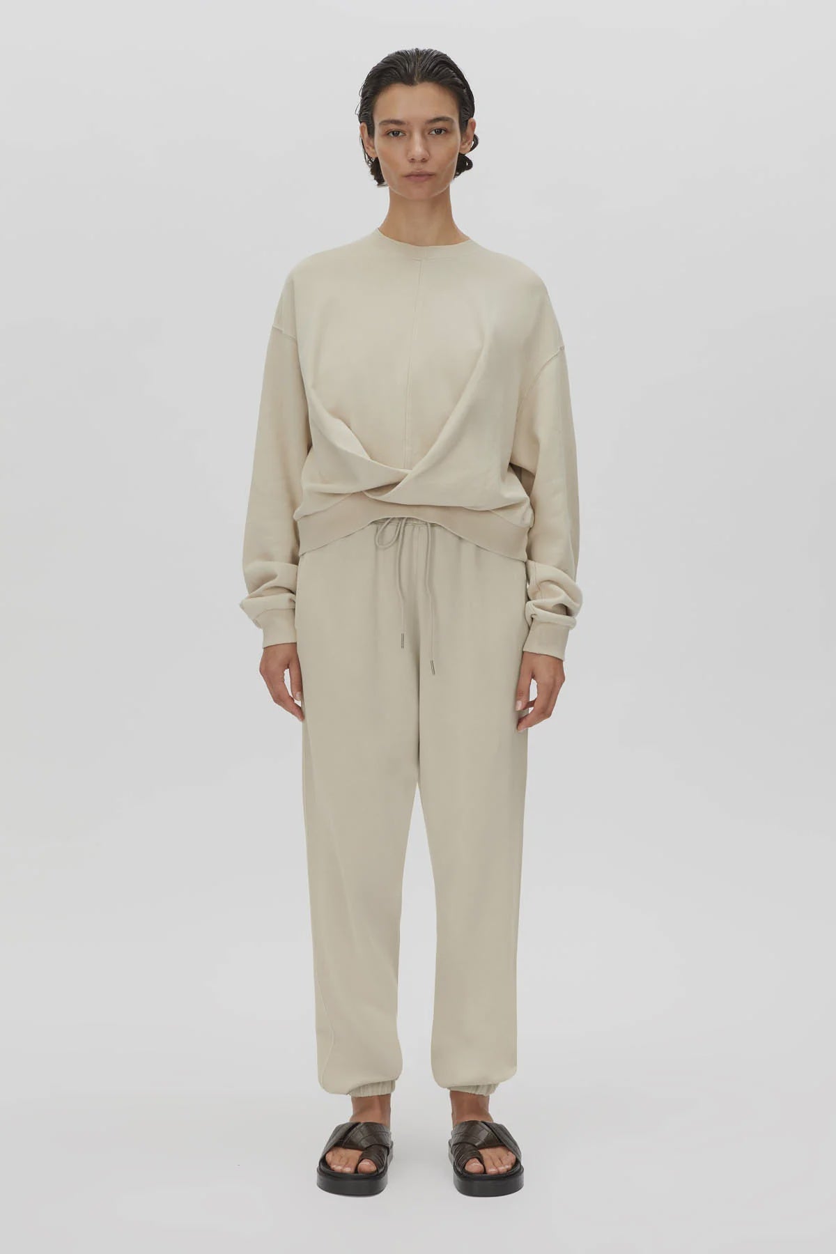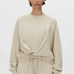 Camilla and Marc Mojave Crew in Alabaster. The Mojave Crew offers a relaxed, contemporary fit with its cropped, draped fleece design. Featuring a ribbed neck with saddle stitching and a centre front seam with delicate pin stitching, it exudes understated detail. The dropped shoulder and draped crossover front panels complete the laid-back, stylish silhouette.