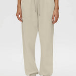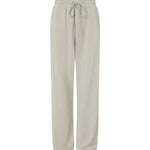Camilla and Marc Mojave Pant in Alabaster. The Mojave Pant features a contrast satin finish with an elasticated waistband, offering a comfortable fit designed to sit mid to low on the waist. A monogram jacquard label is placed at the centre front, complemented by a recycled drawcord and embroidered eyelets for added detail. The elasticated hem provides a refined, tapered silhouette, making it a versatile addition to any wardrobe.