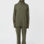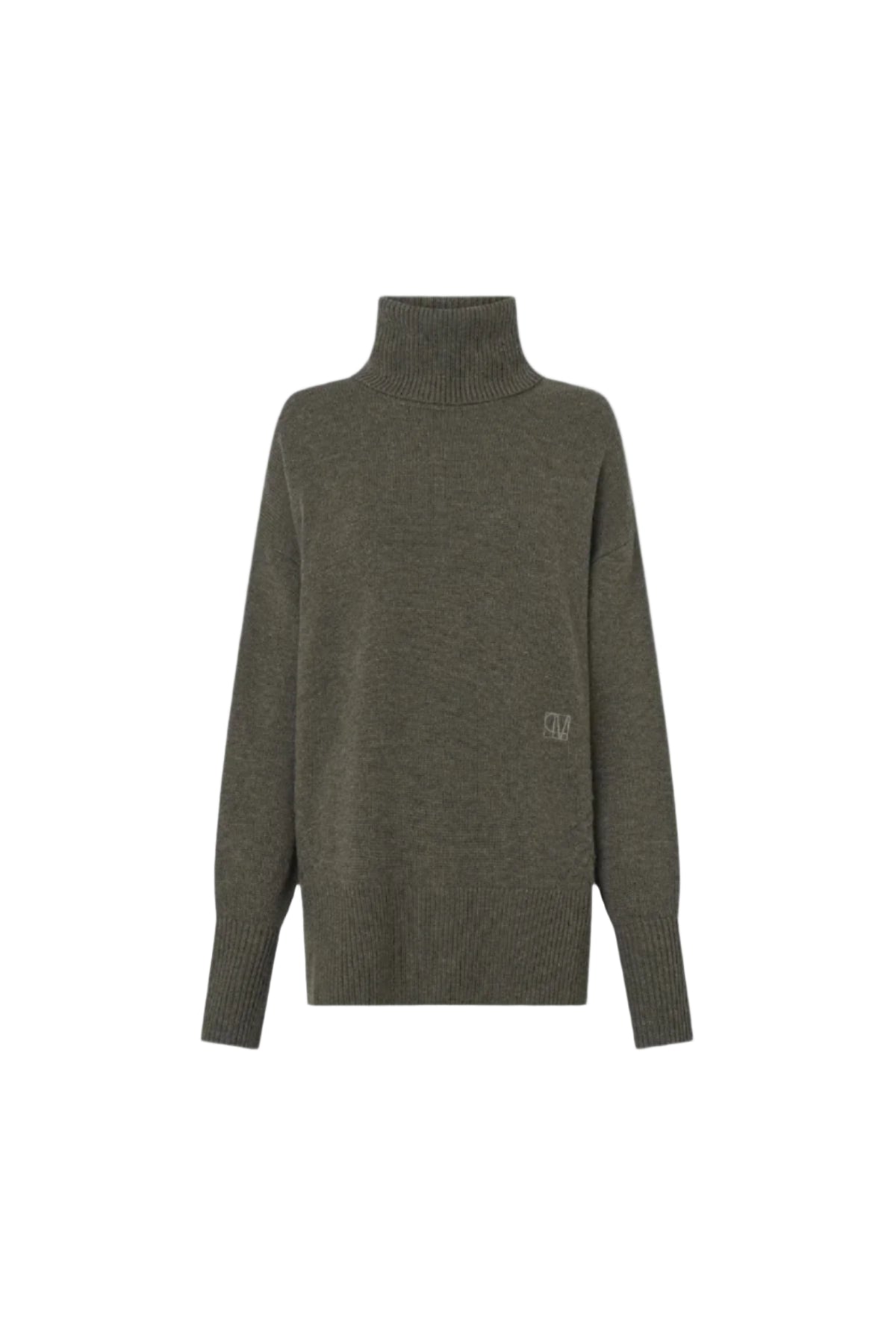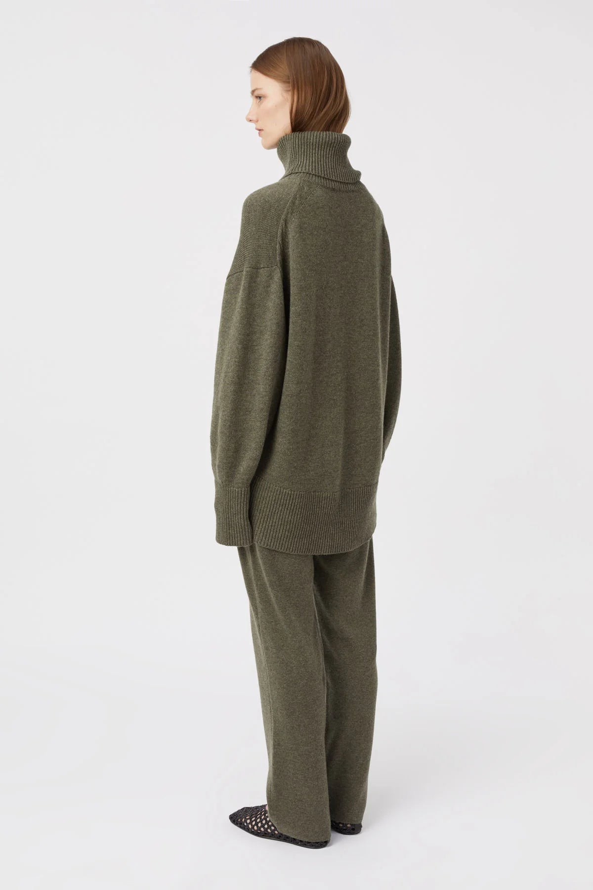 Camilla and Marc Pascal Cashmere Blend Turtleneck in Army Green. The Pascal Cashmere Blend Turtleneck offers a timeless, cocoon-shaped silhouette with a relaxed, oversized fit. Featuring ribbed details at the neckband, sleeve cuffs, and hem, it provides an effortlessly modern look. Designed with dropped shoulders, this refined sweater is a versatile addition to any wardrobe.
