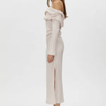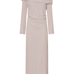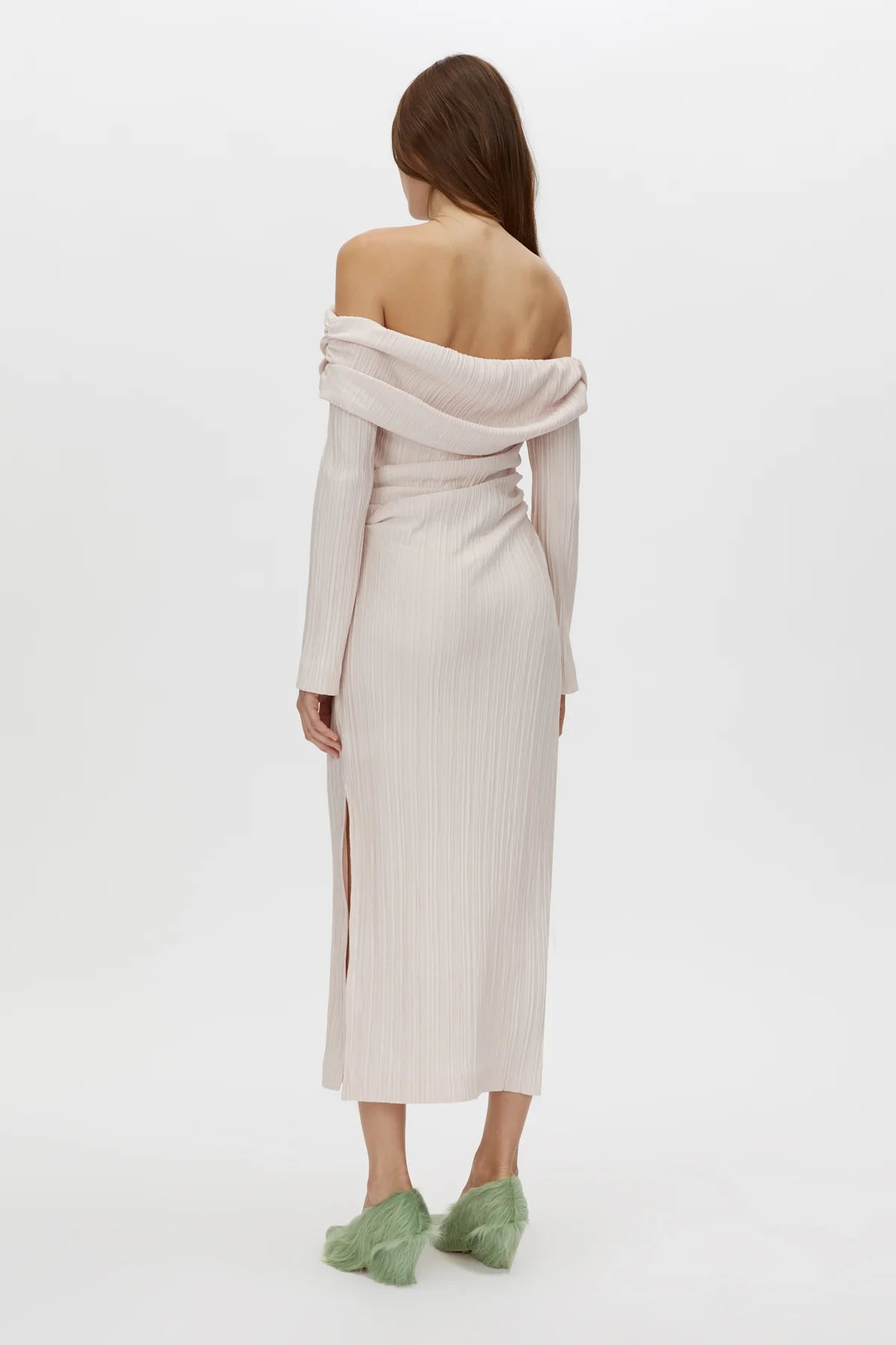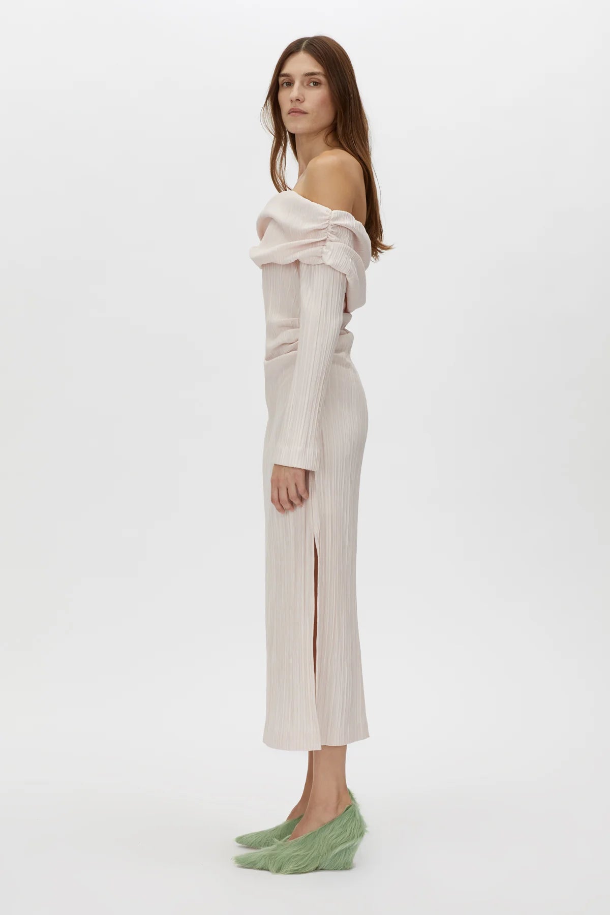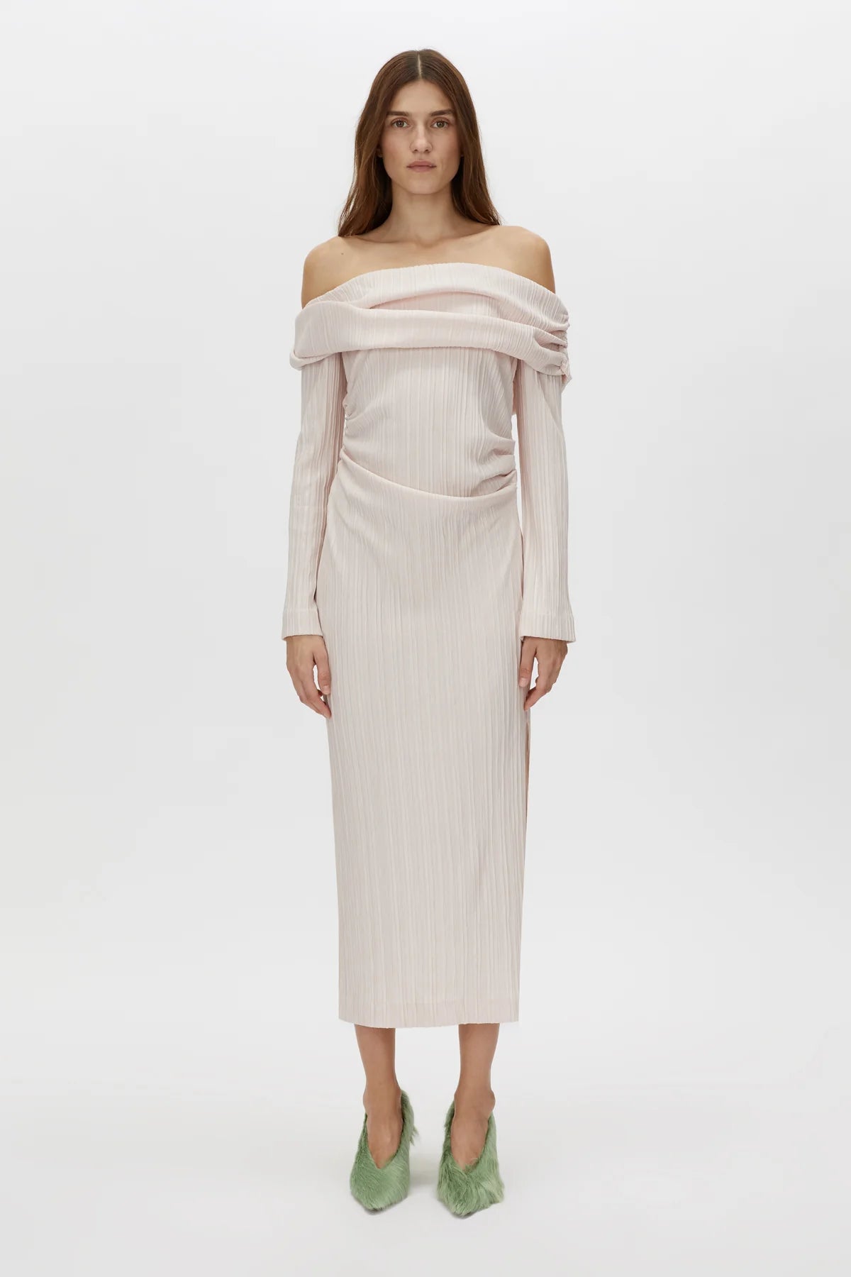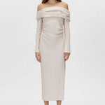 Camilla and Marc Shaw Off Shoulder Dress in Ice Pink. The Shaw Dress exudes effortless charm in a captivating rouge hue, offering a fresh take on timeless elegance. Designed for a close fit, this off-shoulder long-sleeve midi dress features expertly placed tucks at the sides, sculpting a flattering silhouette that accentuates the curves.