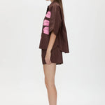Camilla and Marc Sierra Shirt in Chocolate. The Sierra Shirt is crafted from Australian Cotton in a short-sleeved, boxy silhouette. This shirt features a dropped shoulder and a curved hem with wide facing.
