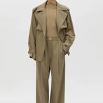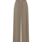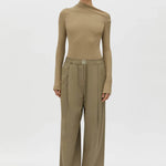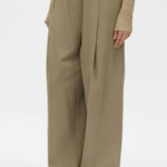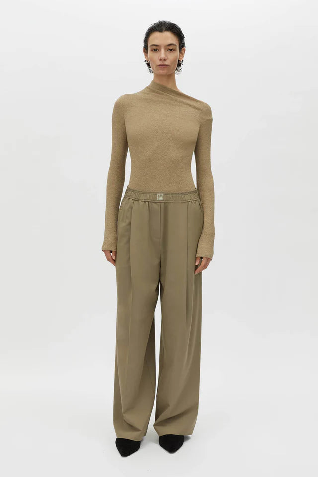 Camilla and Marc Zeno Monogram Elastic Pant in Khaki. The Zeno Monogram Elastic Pant combines modern design with refined detailing. Featuring a self-fabric waistband with a centrally embroidered monogram, the deep tucks and gathers at the waist provide a flattering, structured silhouette. Slant pockets, twin needle stitching, and a blind hem enhance the pants practical yet elevated style.