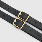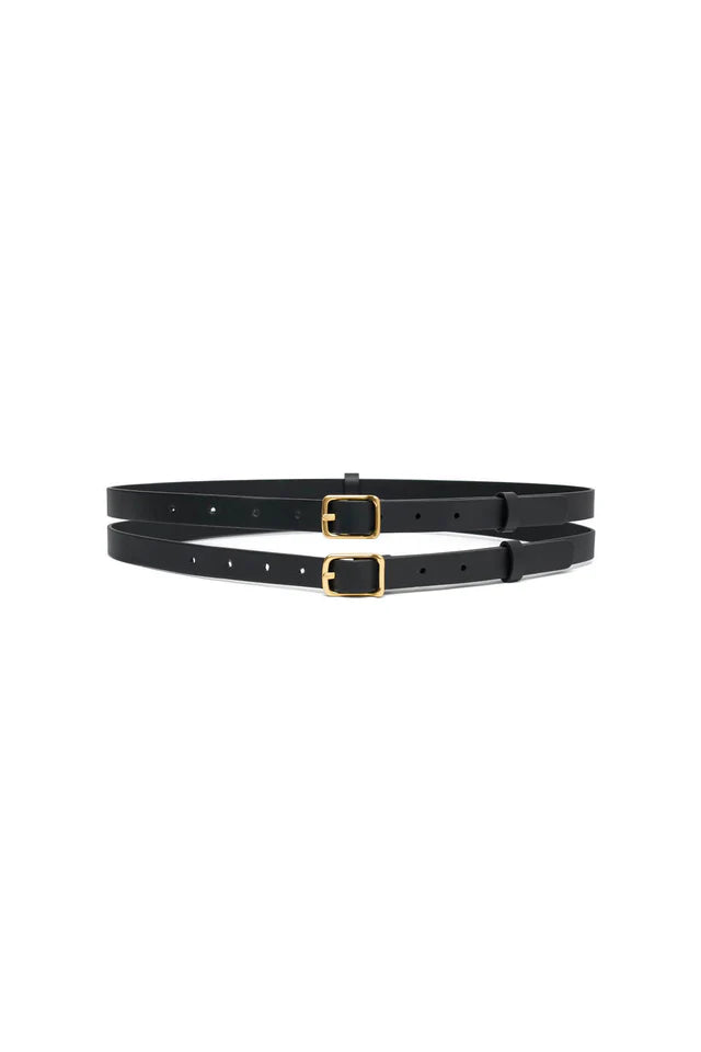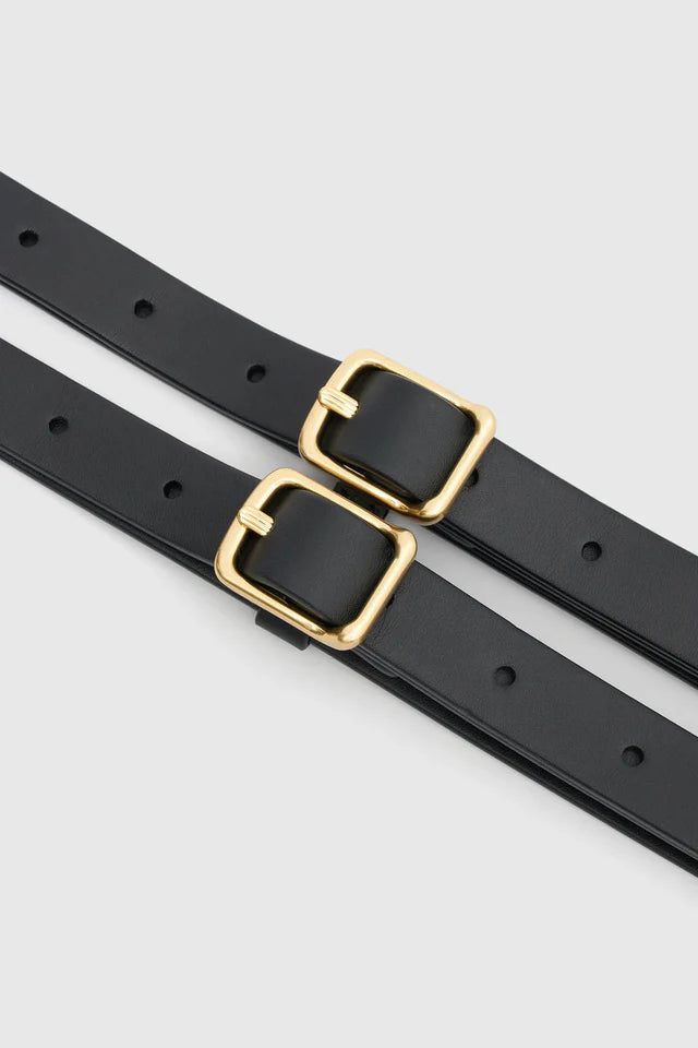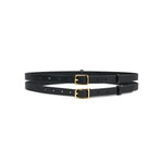 CAMILLA AND MARC Austin Leather Belt in Black with Gold. The Austin Belt is a versatile accessory crafted from luxurious double thin soft vachetta leather and adorned with two elegant gold buckles. Designed to be worn singly or layered for added style, this belt seamlessly enhances any outfit. Elevate your look with the Austin Belt, where timeless elegance meets modern versatility.