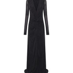 Crafted from a luxurious metallic jersey fabric, this dress exudes sophistication and elegance. The front twist detail at hip height adds a stylish and flattering touch, creating a visually appealing silhouette. The slim-fitted bodice and sleeves enhance your natural curves, while the dress gracefully falls from the hips to the ground, exuding a sense of effortless grace and allure. Perfect for formal events or black-tie affairs, this dress is sure to make a lasting impression.