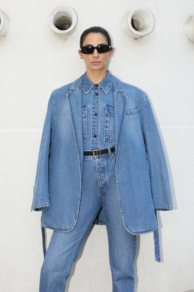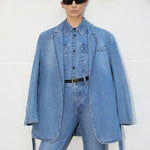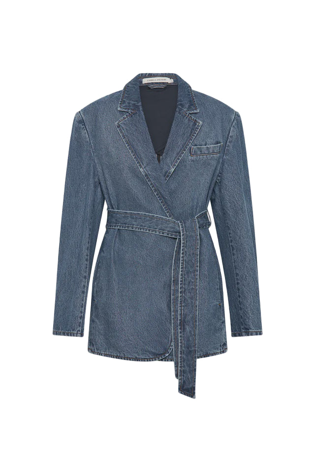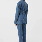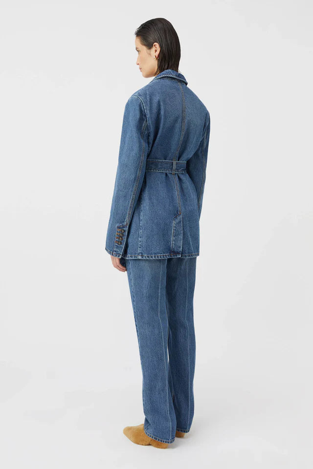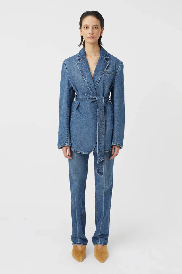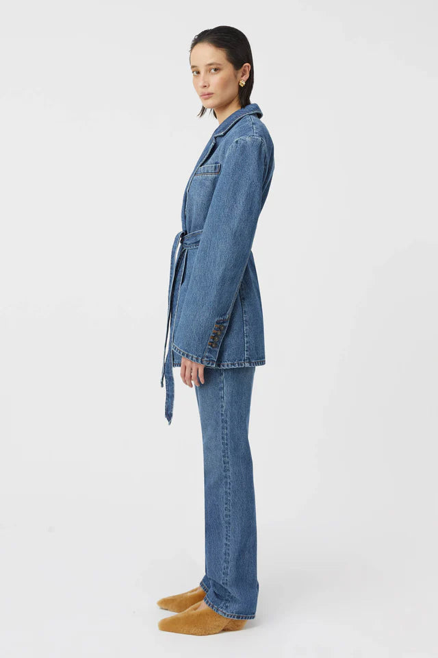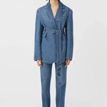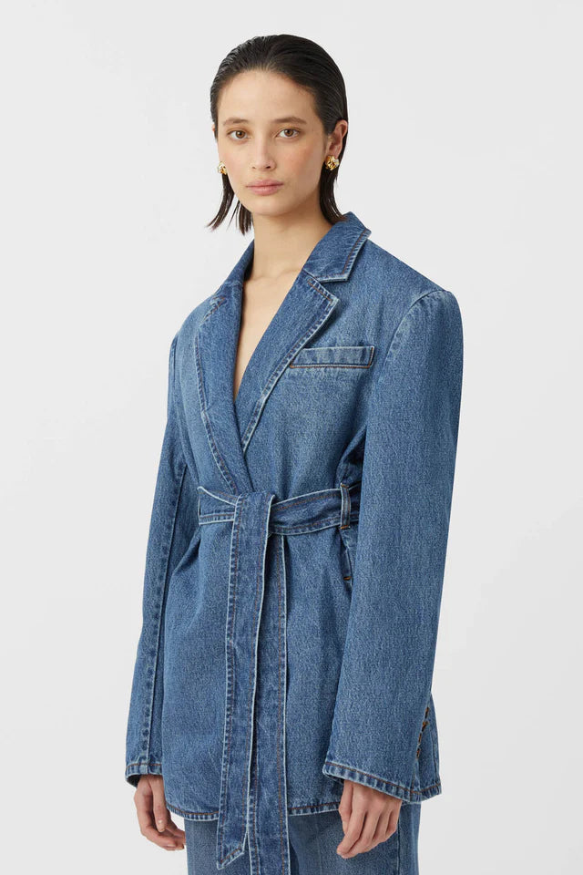 CAMILLA AND MARC Ryland Denim Blazer in Classic Blue. The Ryland Denim Blazer redefines casual elegance with its versatile design and thoughtful details. Featuring a welt pocket on the left chest and removable shoulder pads, it offers both functionality and style. Complete with a self belt tie and belt loops, this blazer effortlessly combines comfort with a tailored silhouette, perfect for adding a polished touch to any ensemble.