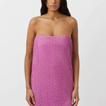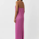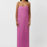 The Sinclar Dress features a beautiful lace outer in a vibrant pink hue that adds a romantic air to this elegant piece. The strapless design showcases a shaped neckline that enhances feminine curves while the full-length hem creates a graceful and flowing silhouette that elongates the body. The Sinclar Dress is perfect for formal events and evening occasions.