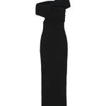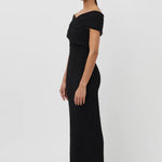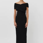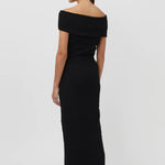 The Toledo is crafted from a unique textured cotton-based fabric in a classic black hue that gives the Toledo its own moment. The off-shoulder dress is fitted in the bodice and falls to a straight-line silhouette that finishes just below the knee with a high split on the right of the skirt.