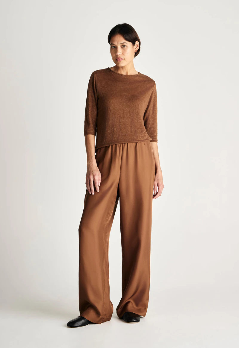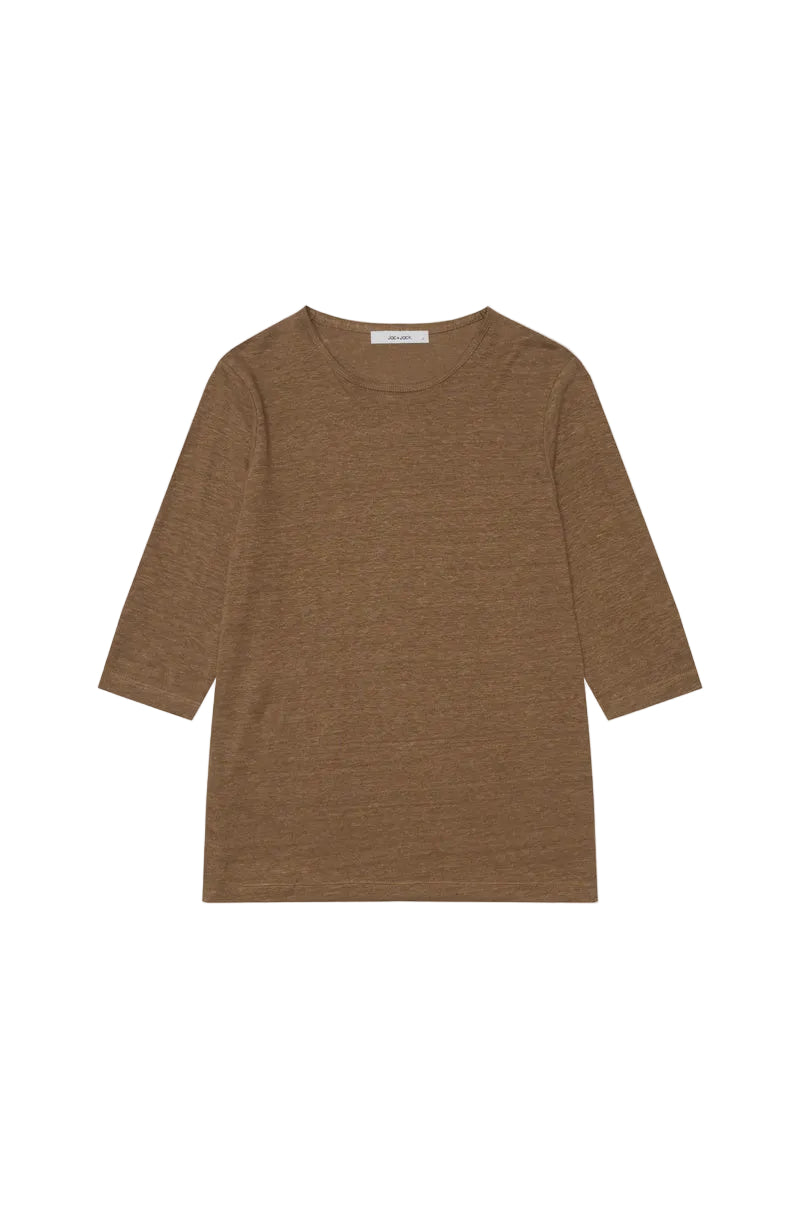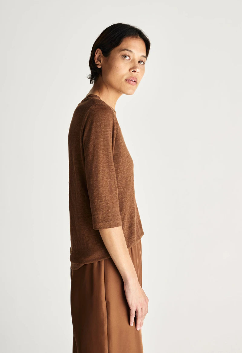 Jac and Jack Max Tee in Dark Tabac. The Max Tee is a versatile wardrobe essential crafted from 100% slubbed mid-weight linen jersey. Featuring a crew neckline, three-quarter sleeves, and a gently trapeze cut for a relaxed, flattering fit, this t-shirt drapes beautifully and is cut square at the hem for a refined finish. Perfect for everyday wear, it can be styled tucked into tailored pants or left untucked for effortless, casual elegance.