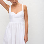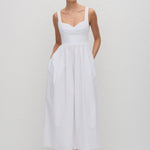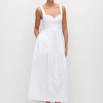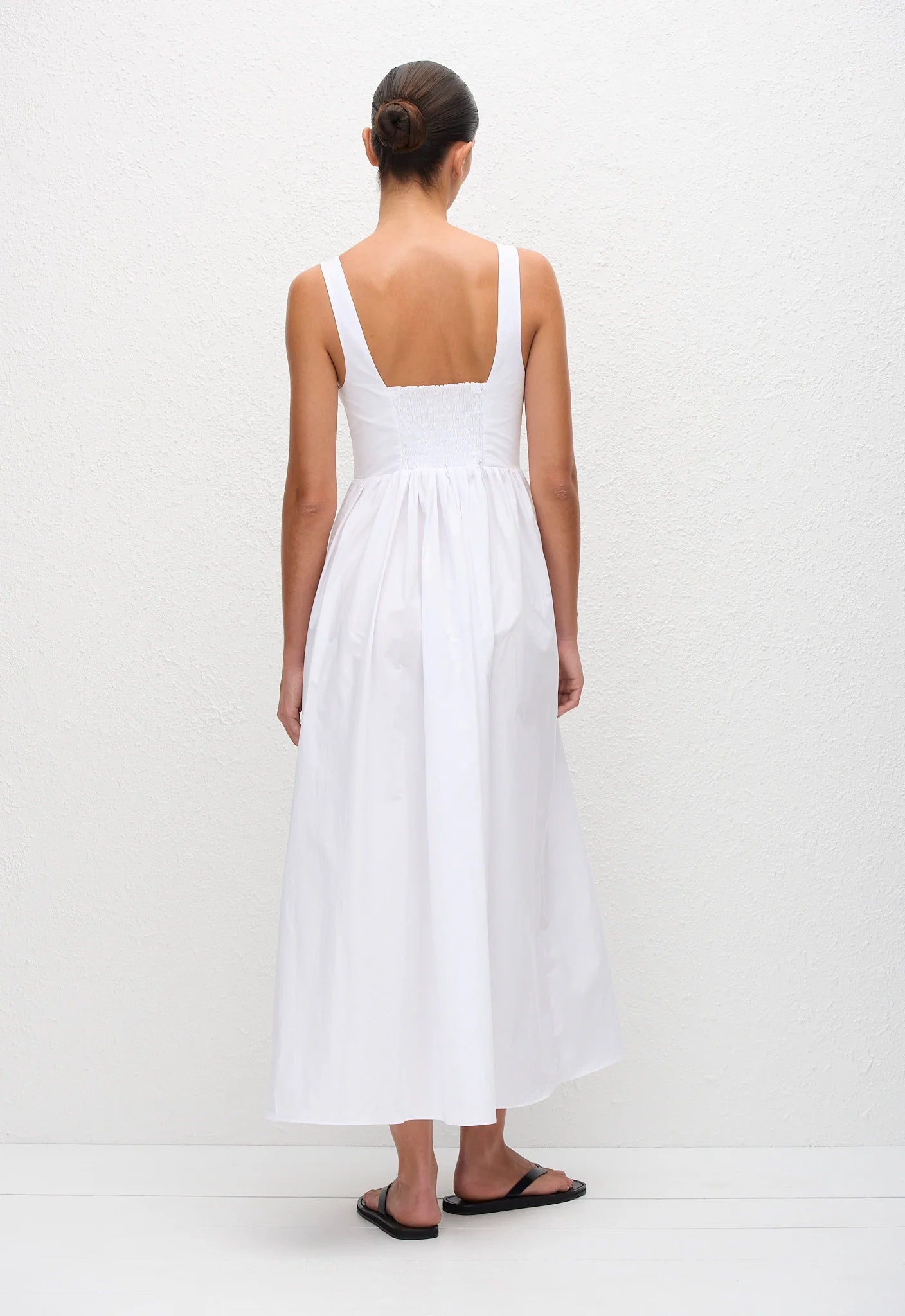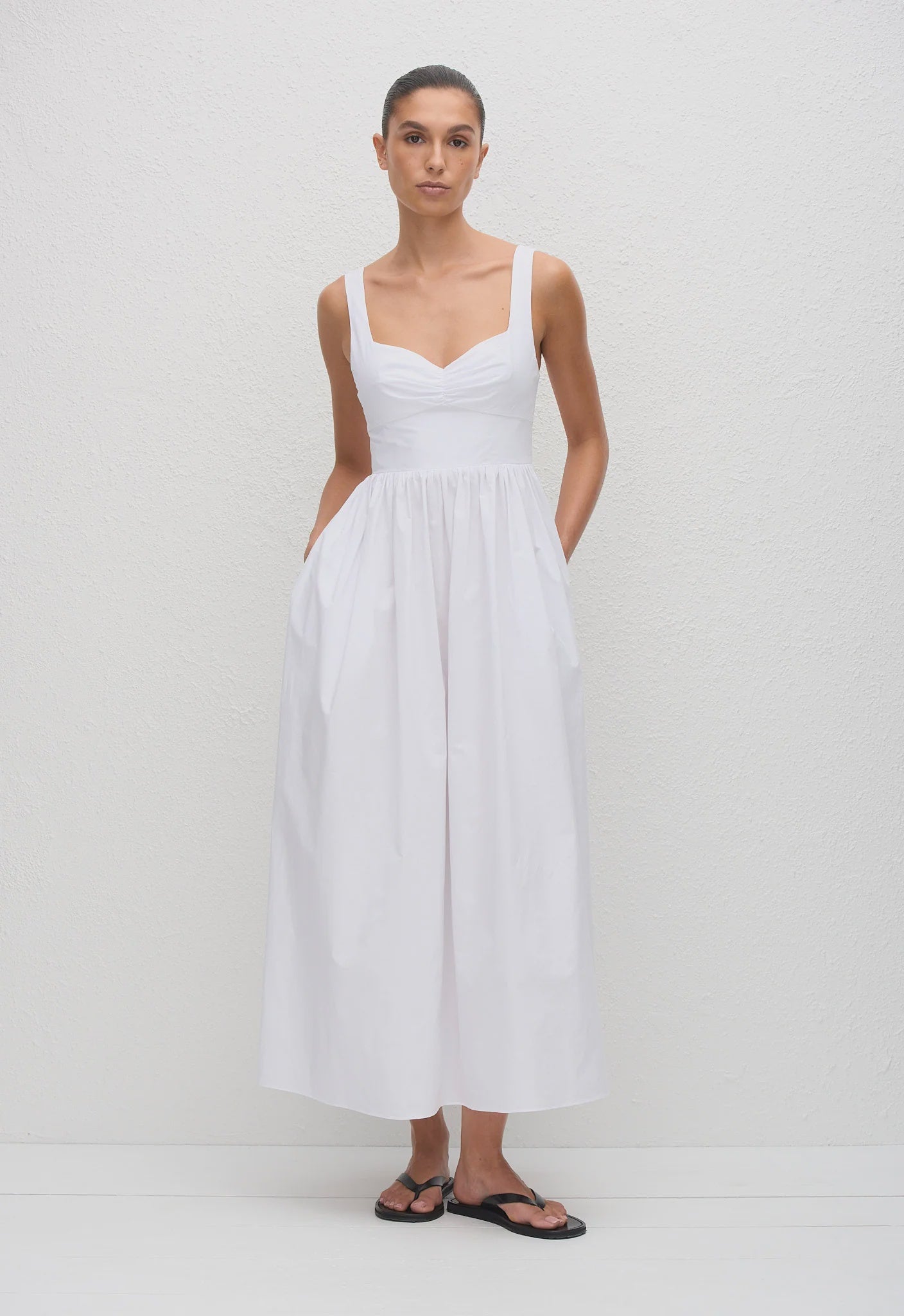 Matteau Bralette Midi Dress in White. Introducing the Bralette Midi Dress, a new pull-on dress silhouette that features a sweetheart neckline, fitted bodice and a shirred elastic back panel detail. The full gathered skirt conceals in-seam pockets and adds to the elevated hourglass silhouette. Wear for your next summer occasion with your favourite sandals.
