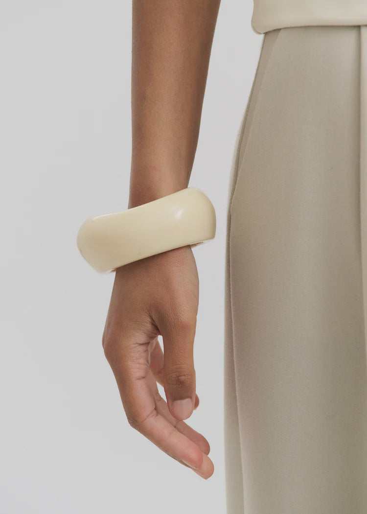 Anna Rossi Make a Statement Bangle in Cream. The Make a Statement Bangle is a striking thick acrylic piece with a unique, entirely curved shape ensuring each piece is completely different. The featuring of a subtle marble effect through the green makes this bangle the perfect piece to bring texture to an outfit, stacked for a pop of colour, or paired with the metal bangles for a styled look.